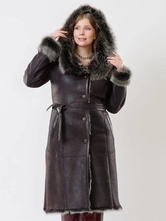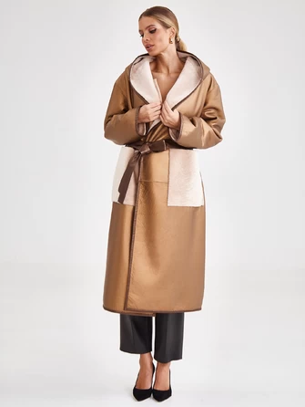 Женская длинная дубленка оверсайз с капюшоном премиум класса 2021, бежевая, размер 50, артикул 62980
