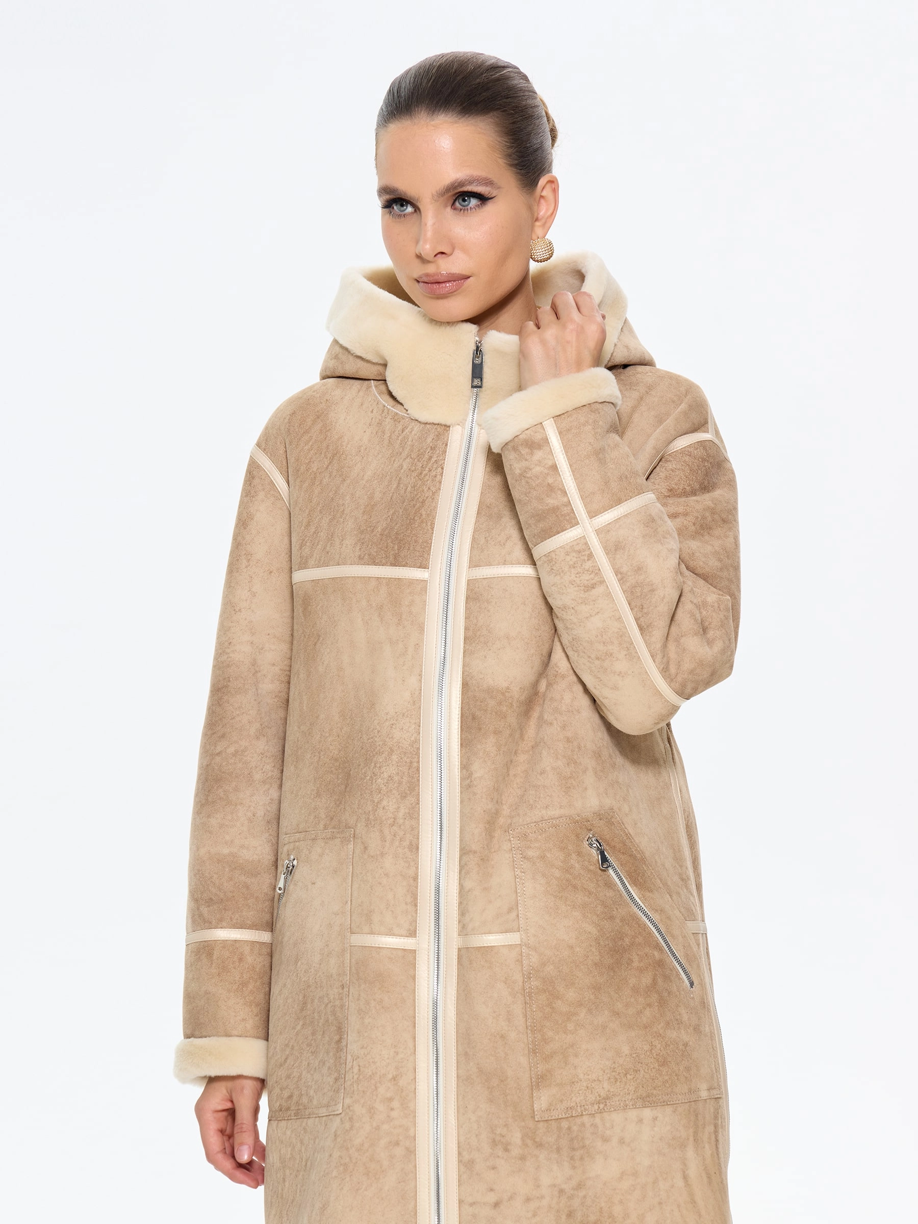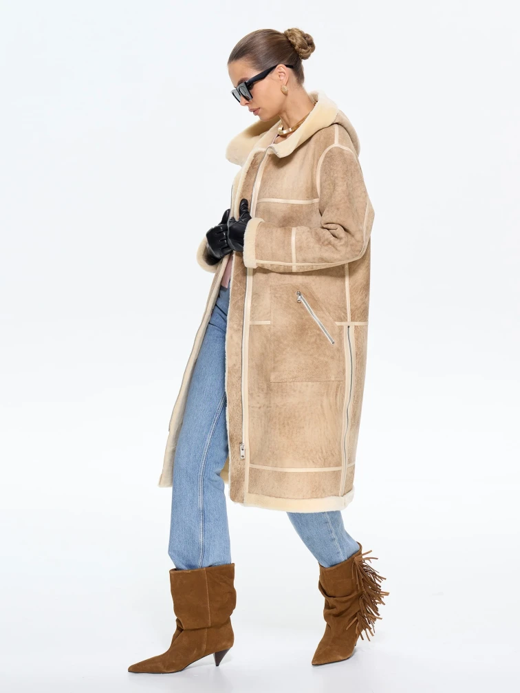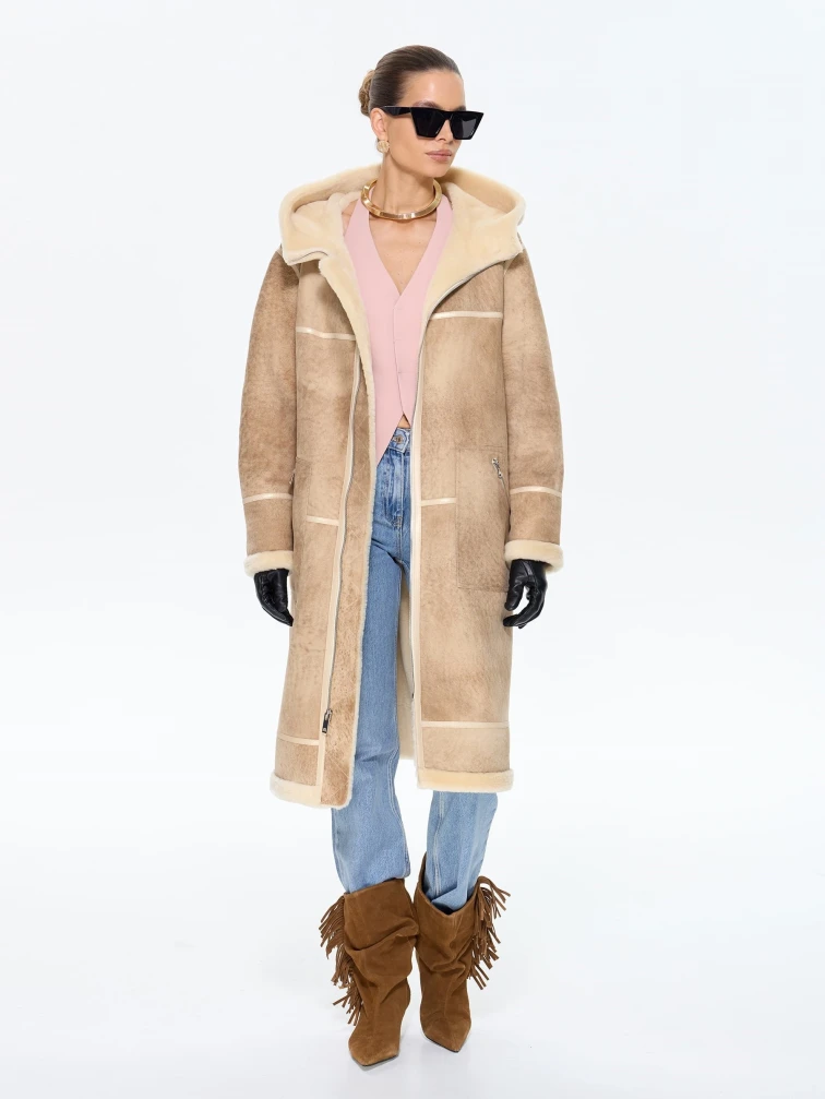 Стильная дублёнка свободного кроя с капюшоном из натуральной овчины мерино премиум-класса в бежевой цветовой гамме. Модель длиной 105 см со спущенной линией плеча и глубоким капюшоном с меховой опушкой создаёт уютный и стильный образ — само изделие и стильные врезные карманы застёгиваются на удобные молнии. Стилисты рекомендуют носить эту дублёнку с кожаными ботинками и джинсами-скинни для повседневного образа или с вязаным платьем и уггами для завершённого зимнего лука. Изящные кожаные канты и меховая отделка подчёркивают внимание к деталям, делая эту модель идеальным сочетанием практичности и утончённого шарма для современных женщин, ценящих комфорт и элегантность.