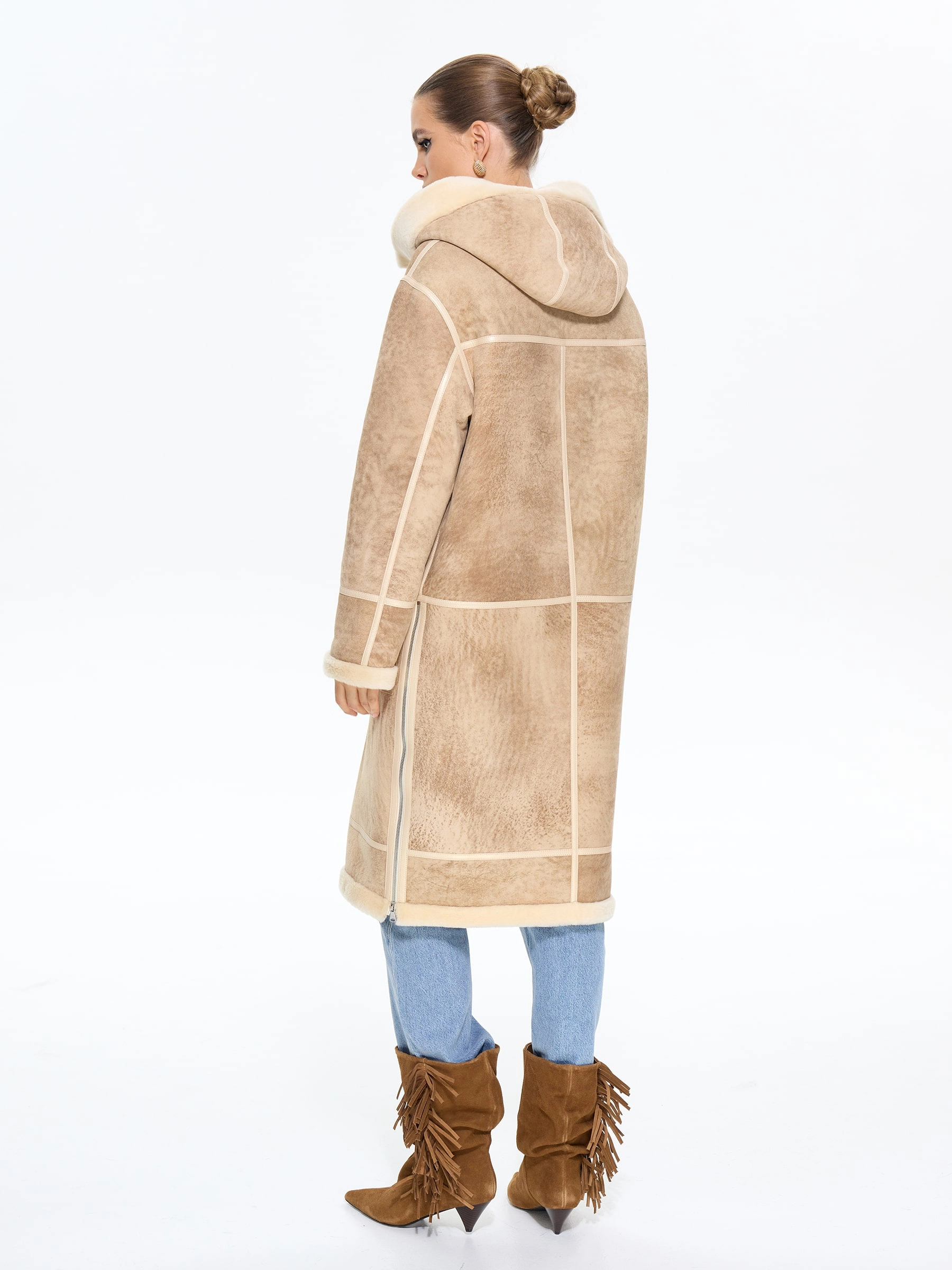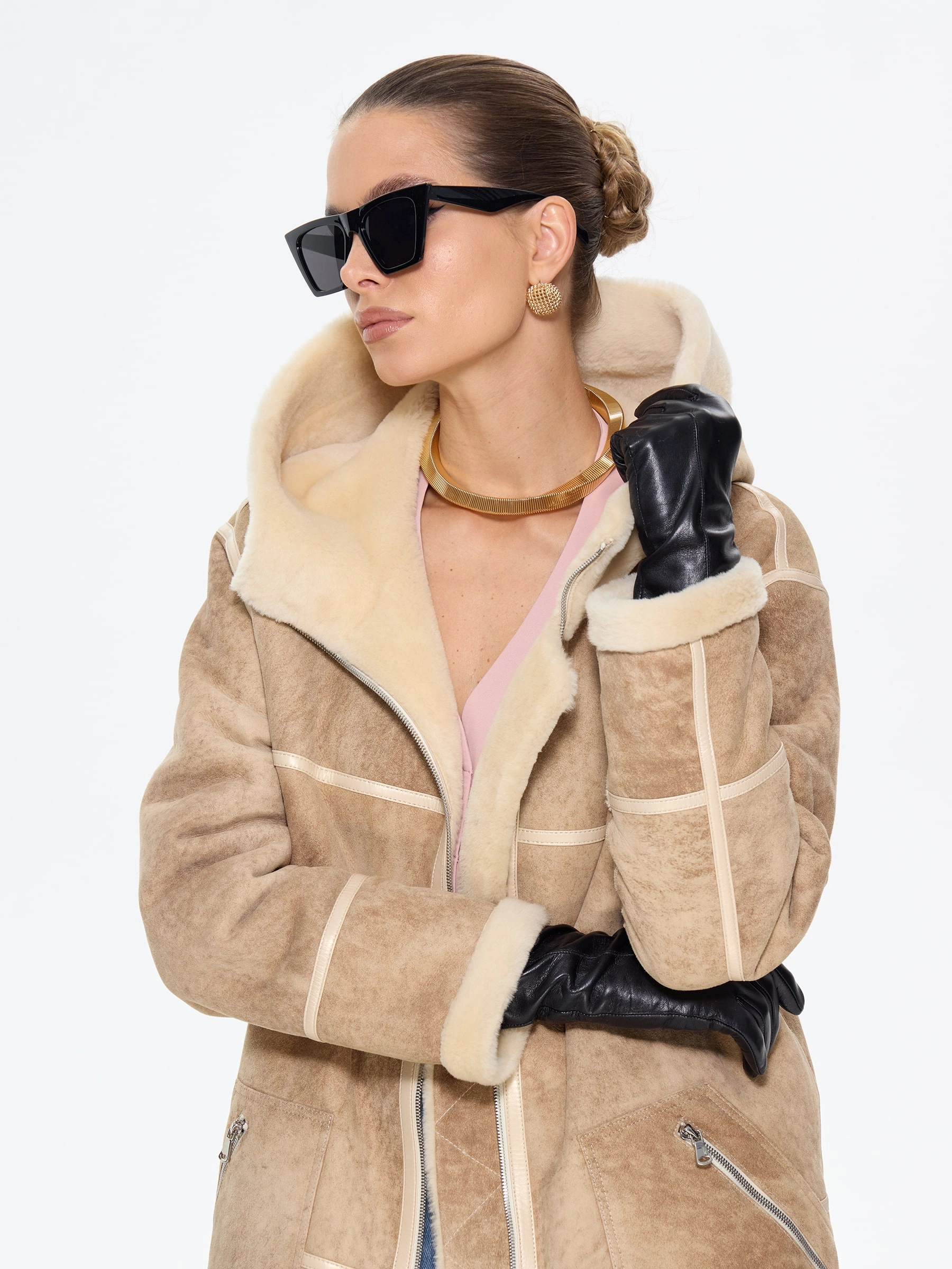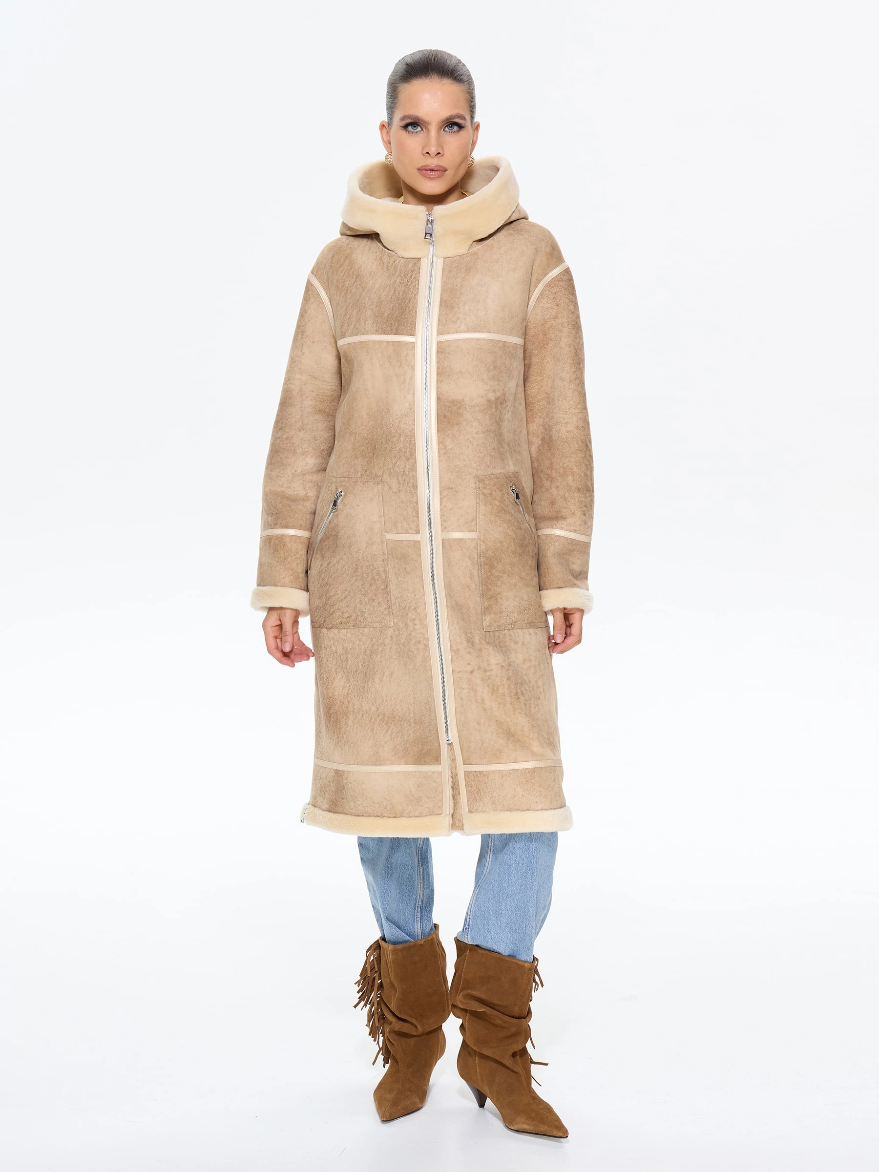 Стильная дублёнка свободного кроя с капюшоном из натуральной овчины мерино премиум-класса в бежевой цветовой гамме. Модель длиной 105 см со спущенной линией плеча и глубоким капюшоном с меховой опушкой создаёт уютный и стильный образ — само изделие и стильные врезные карманы застёгиваются на удобные молнии. Стилисты рекомендуют носить эту дублёнку с кожаными ботинками и джинсами-скинни для повседневного образа или с вязаным платьем и уггами для завершённого зимнего лука. Изящные кожаные канты и меховая отделка подчёркивают внимание к деталям, делая эту модель идеальным сочетанием практичности и утончённого шарма для современных женщин, ценящих комфорт и элегантность.