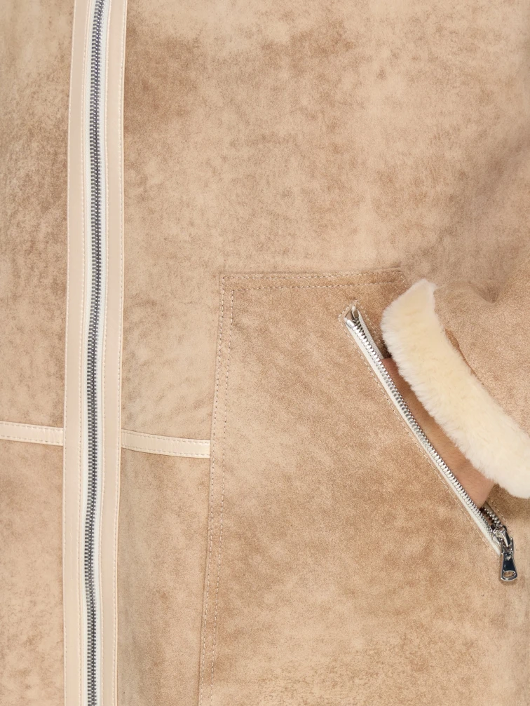 Бежевая женская дубленка с капюшоном 2061, размер 44, артикул 65210