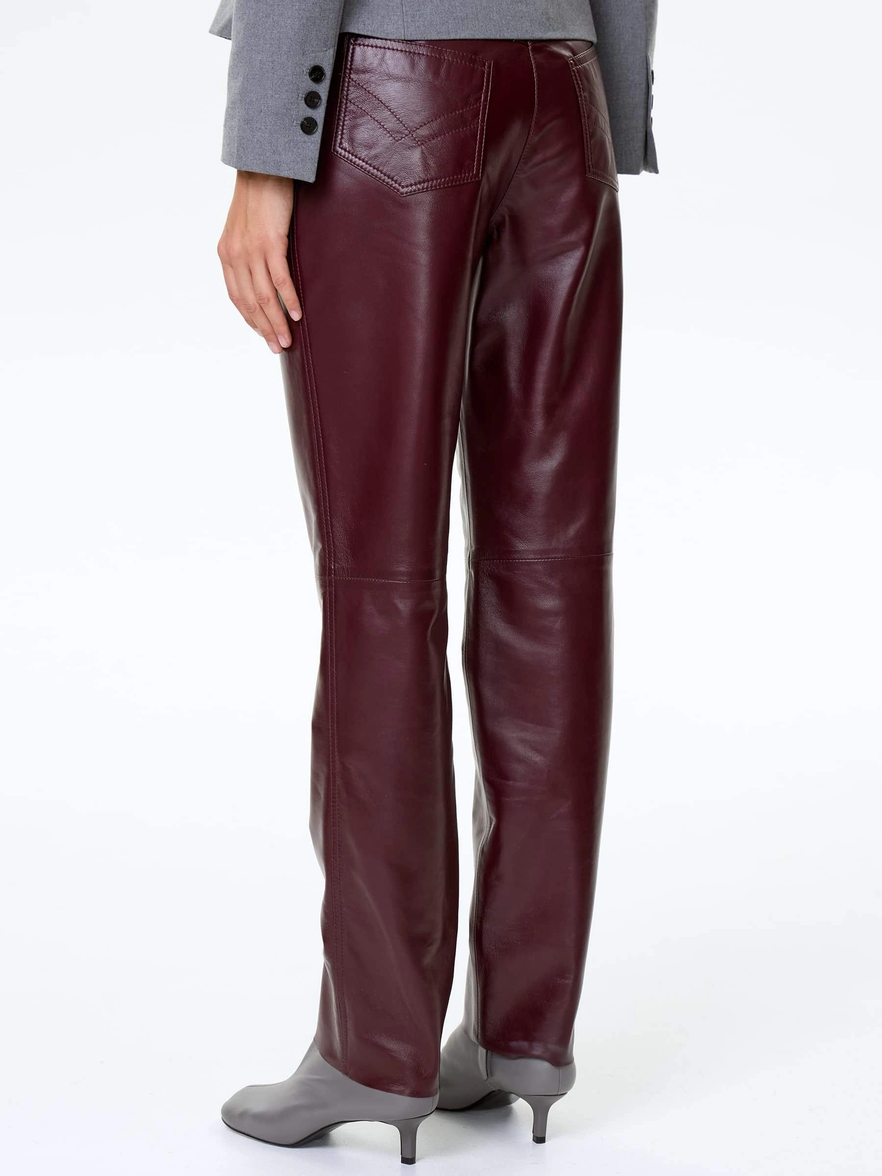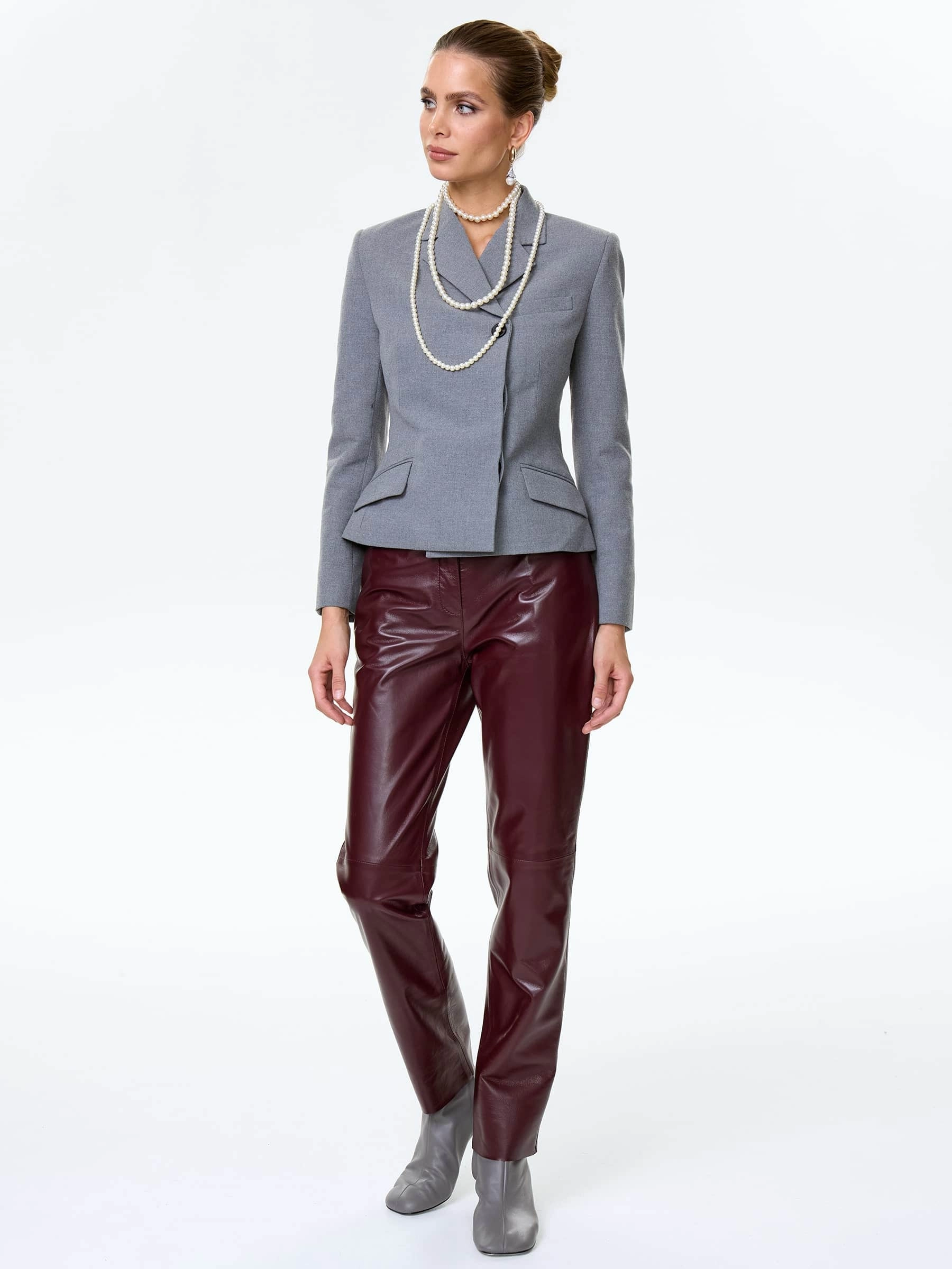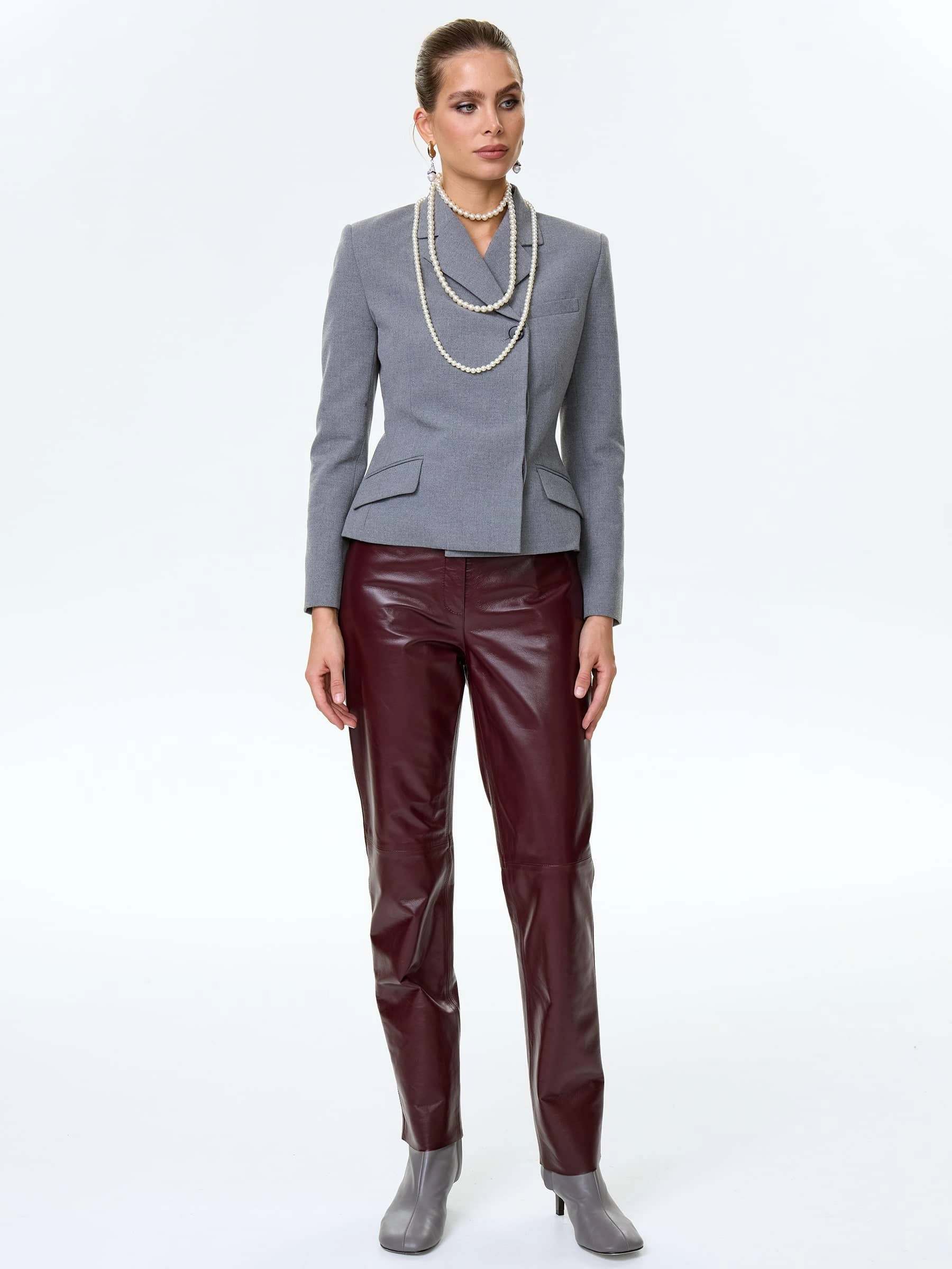 Зауженные брюки из натуральной кожи насыщенного бордового оттенка сочетают элегантность и комфорт. Модель прямого силуэта со средней посадкой идеально подчеркивает женственность. Длина 105 см создает стройный силуэт. Четыре функциональных кармана — два боковых и два задних — добавляют практичности, сохраняя лаконичность дизайна. Потайная застежка-молния с декоративной планкой обеспечивает аккуратный внешний вид и подчеркивает чистоту линий. Глубокий бордовый цвет позволяет создавать разнообразные образы — от классических сочетаний с белой рубашкой до современных луков с объемными свитерами или кожаными жакетами. Эти брюки станут универсальным выбором как для повседневной носки, так и для особых случаев.