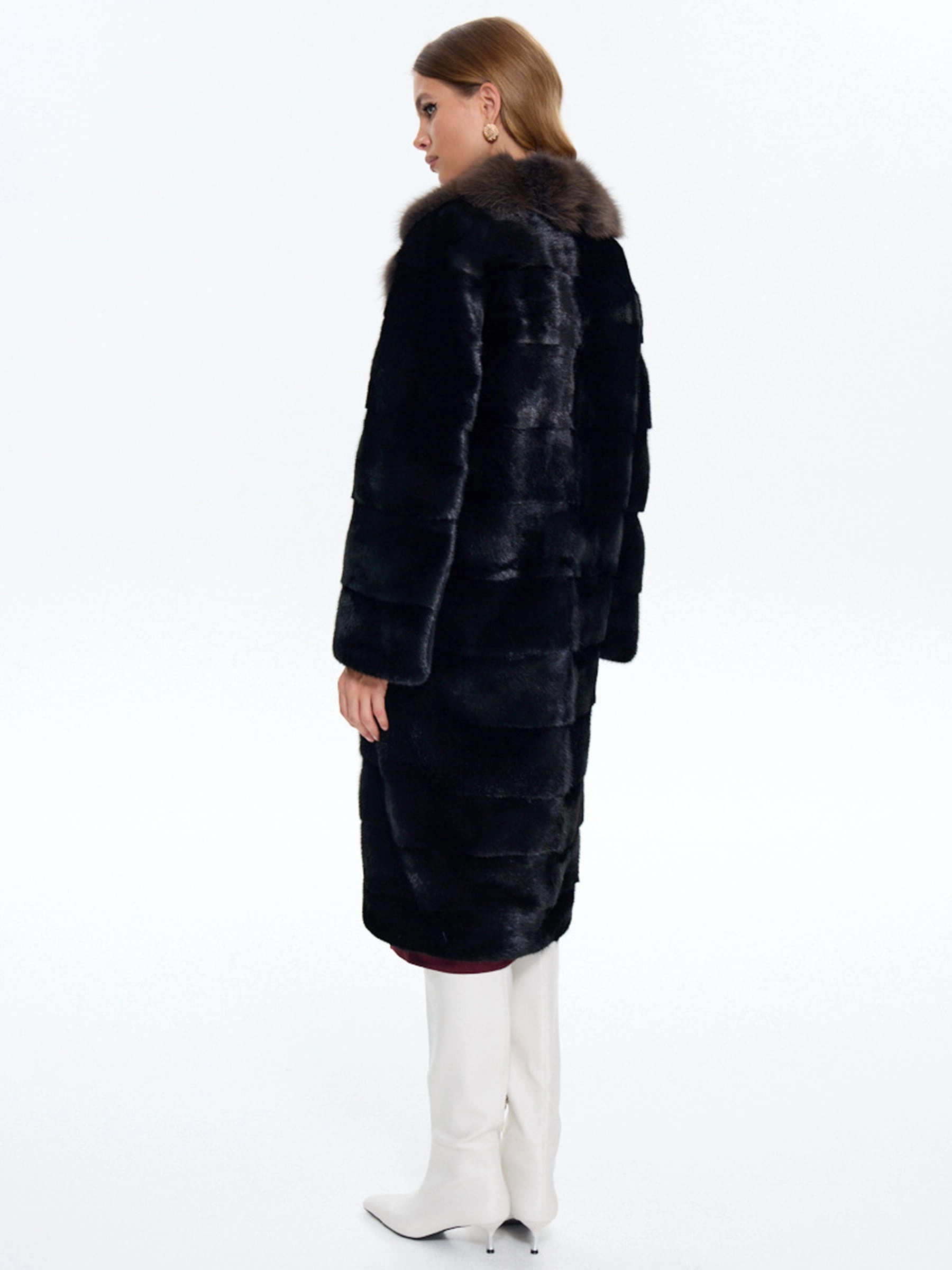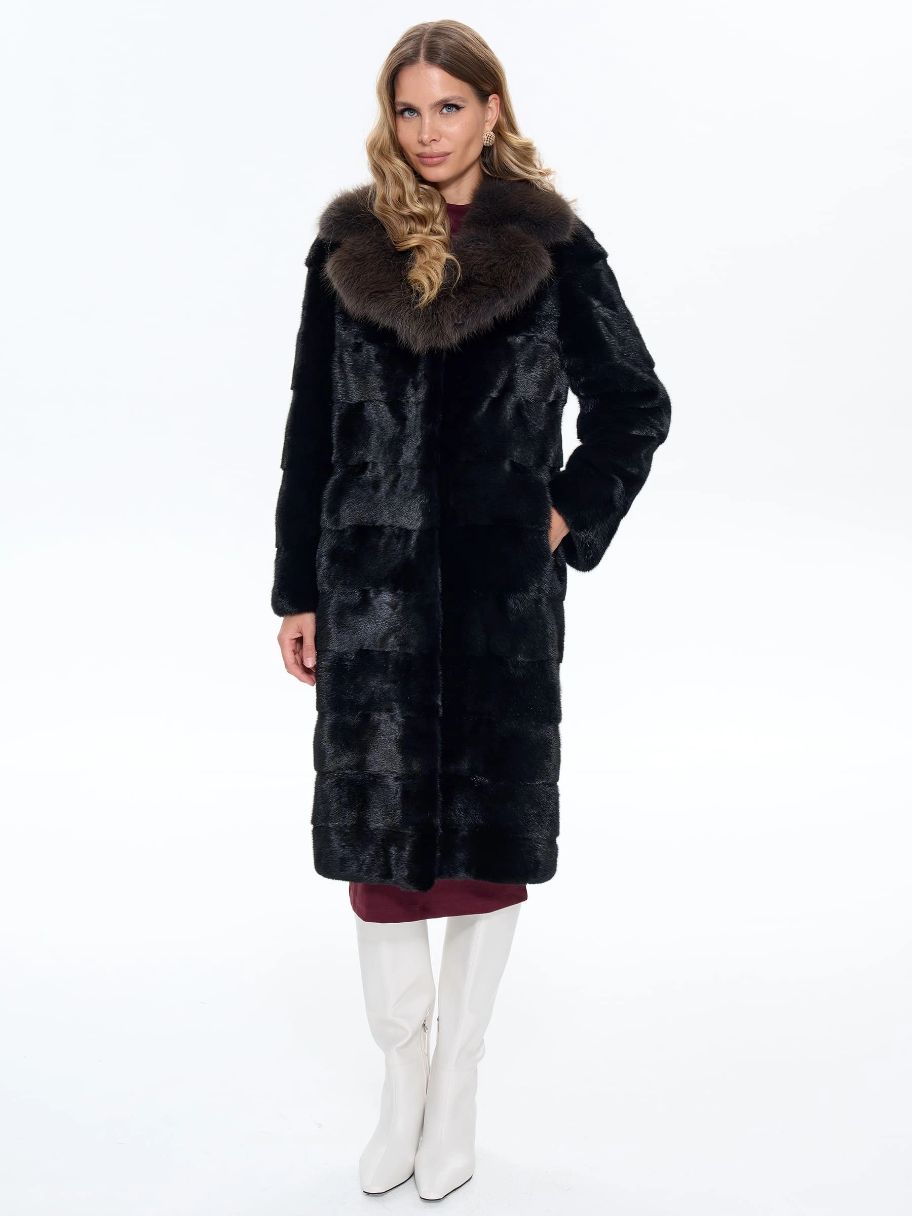 Товар черная норковая шуба с куницей 2а, размер 44, артикул 65150 выполнен из мех норки с застежкой клипсы. Рассчитан на сезон: зима. Длина изделия 110 см, силуэт прямой.