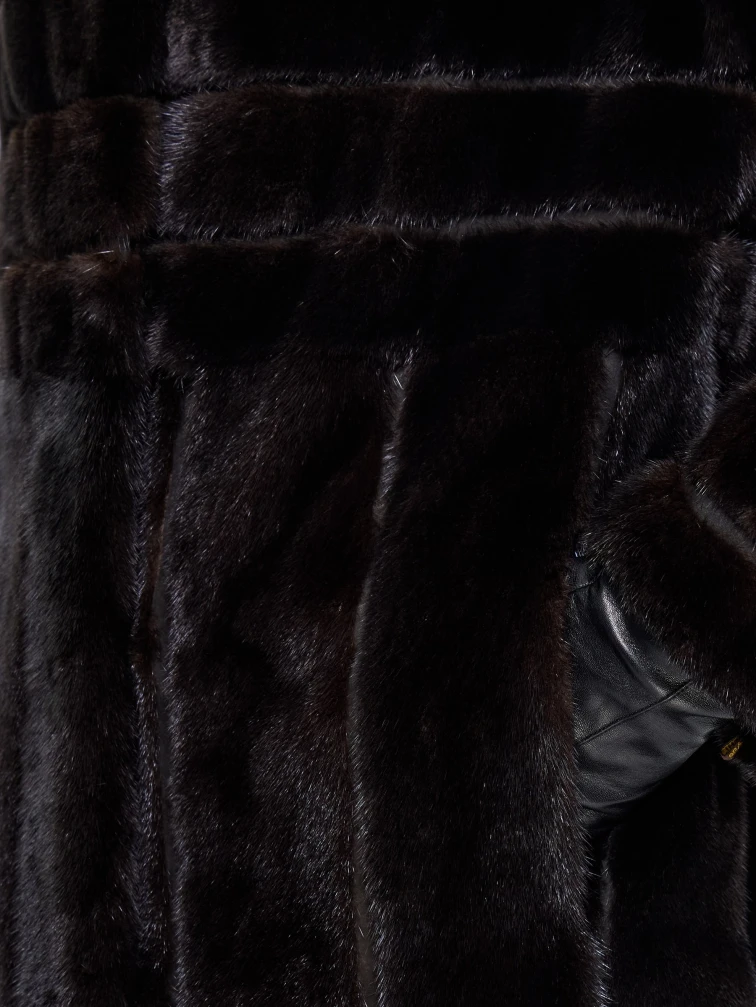 Элегантная черная шуба приталенного силуэта из меха норки премиум-класса. Техника поперечной раскладки создаёт эффект плетения, а рукав реглан обеспечивает свободу движений. Универсальная длина midi сохраняет тепло, подчёркивая стройность. Открытый воротник акцентирует внимание на шее, позволяя носить объёмные аксессуары.
