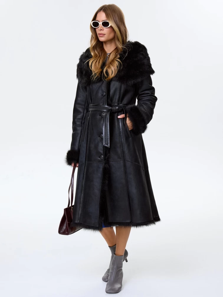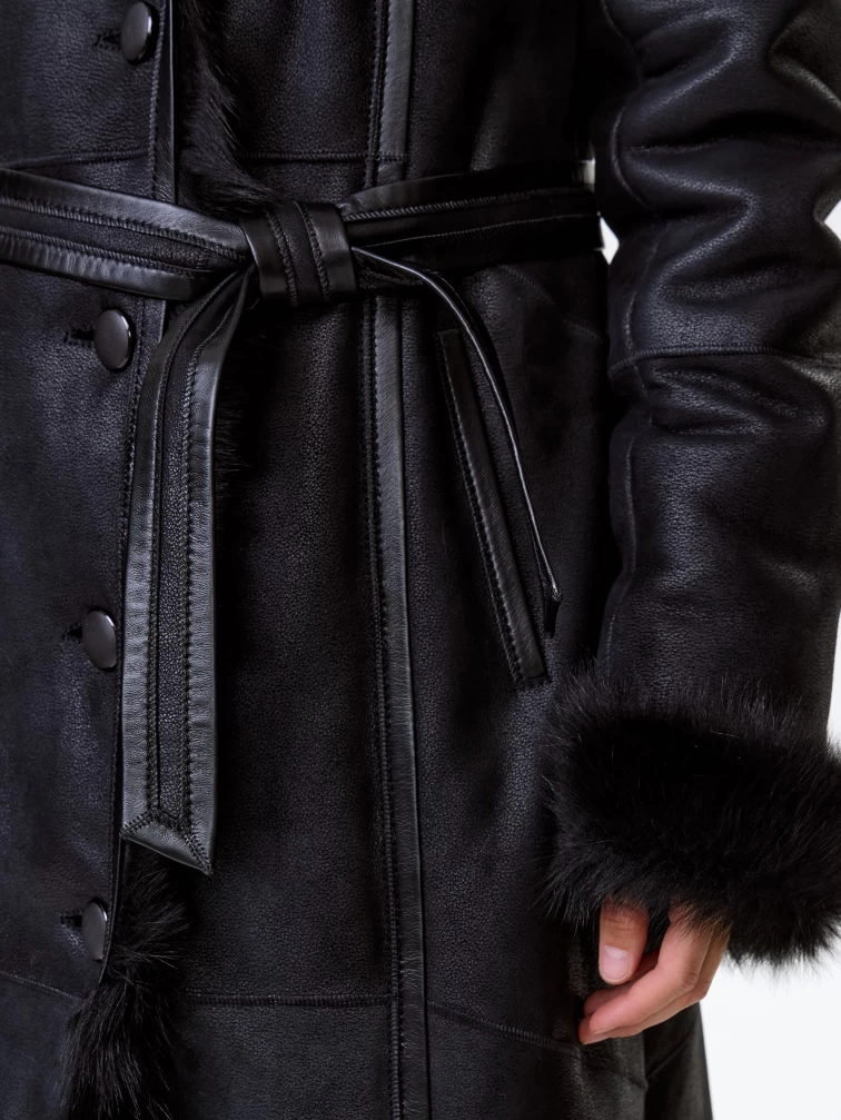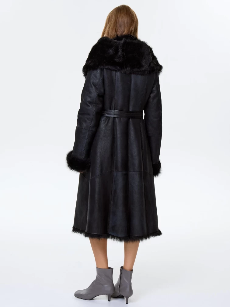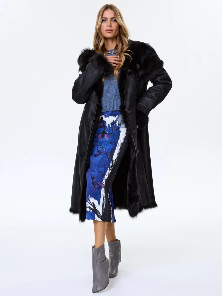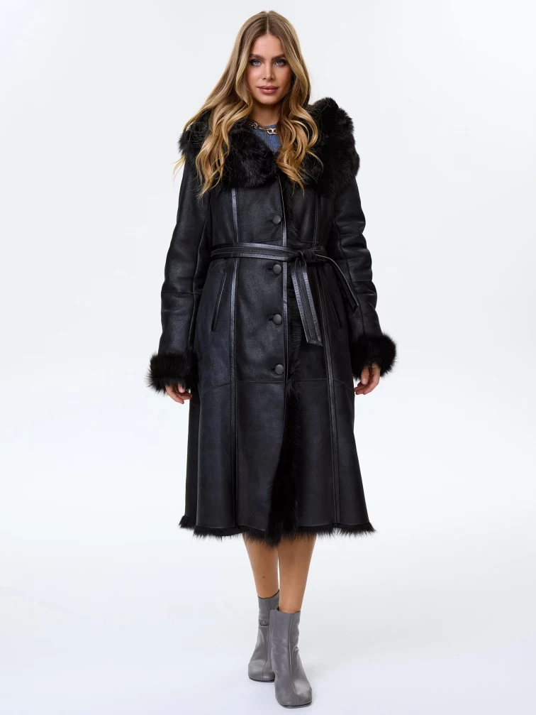 Дублёнка из тосканской овчины в черном цвете. Эффектный широкий капюшон, превращающийся на плечах в шаль. Нежнейший мех очень густой и высокий, поэтому дублёнка великолепно греет в любой мороз. Новейшее защитное покрытие надёжно предохраняет от царапин. Идеальная посадка по фигуре. Безупречная работа наших портных. Премиальное качество.