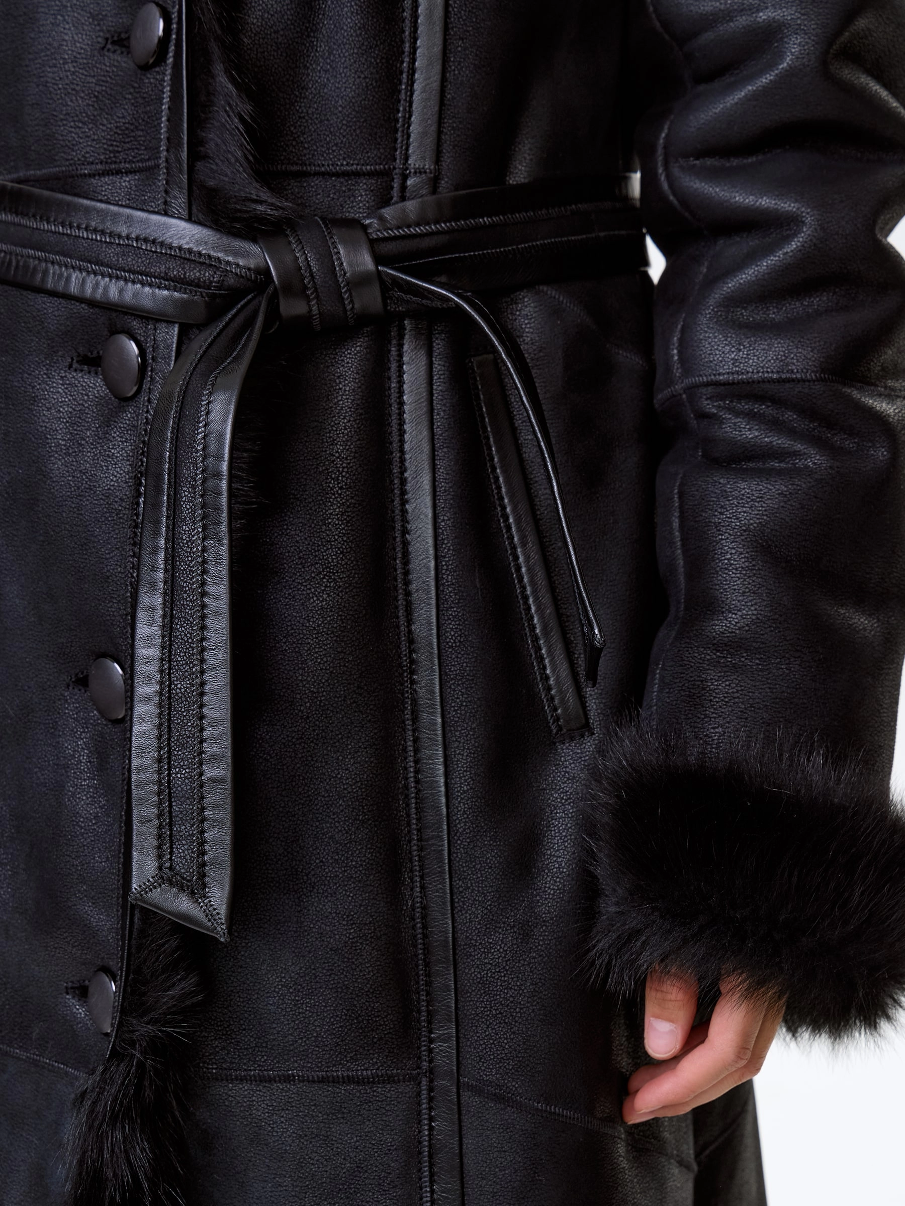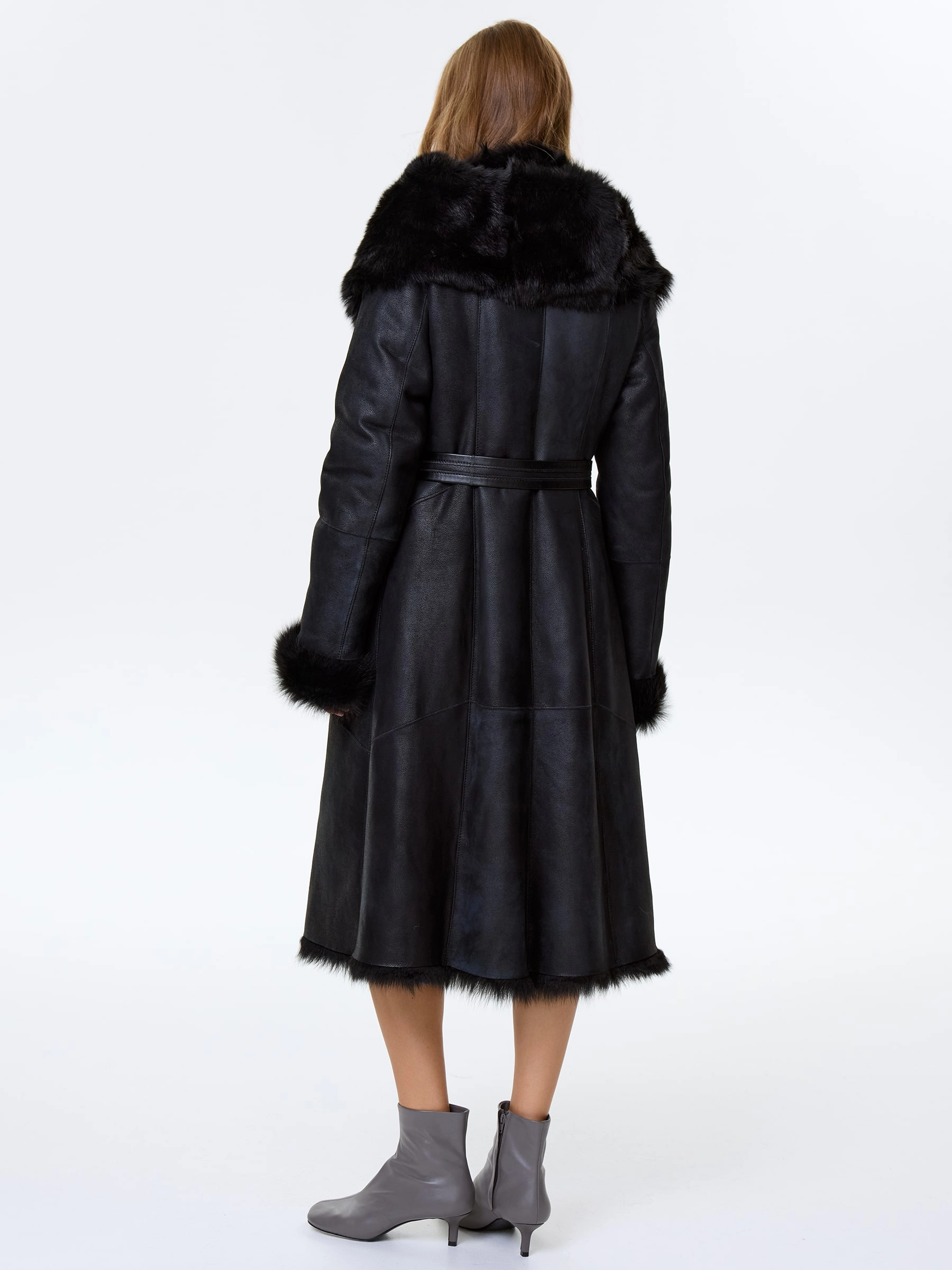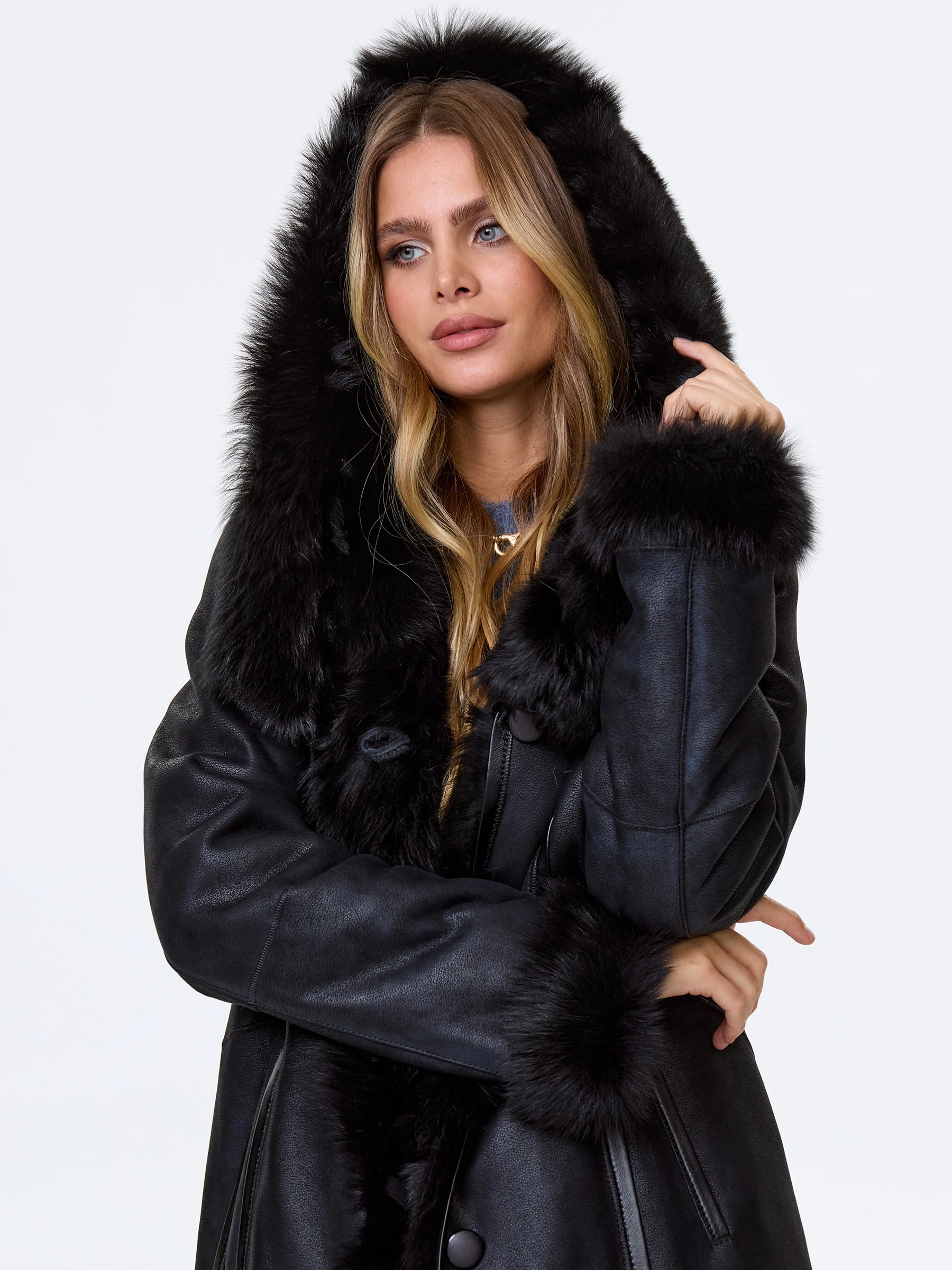 Дублёнка из тосканской овчины в черном цвете. Эффектный широкий капюшон, превращающийся на плечах в шаль. Нежнейший мех очень густой и высокий, поэтому дублёнка великолепно греет в любой мороз. Новейшее защитное покрытие надёжно предохраняет от царапин. Идеальная посадка по фигуре. Безупречная работа наших портных. Премиальное качество.