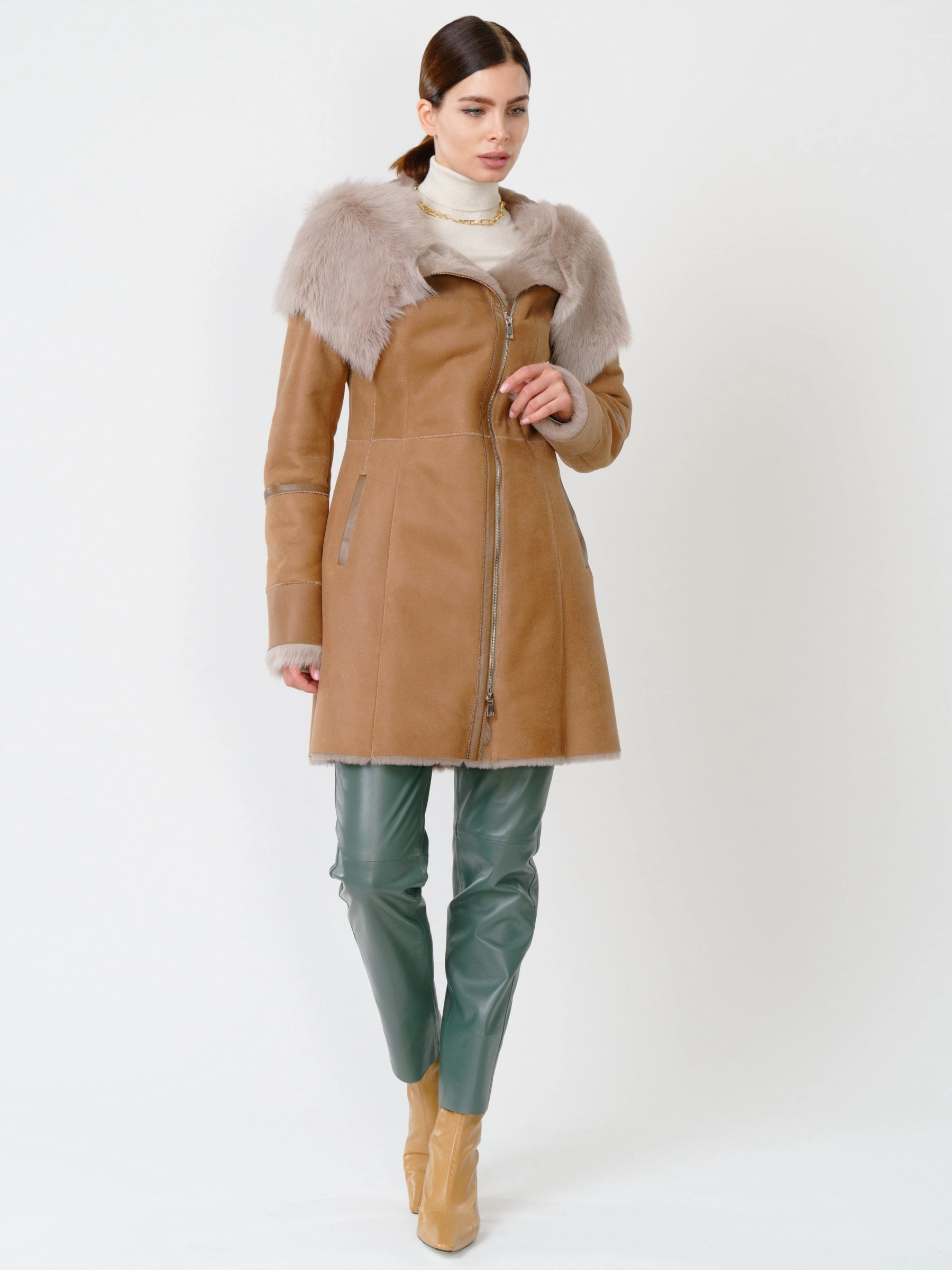 Демисезонный комплект женский: Дубленка 283 + Брюки 03, бежевый/оливковый, р. 44, арт. 111211