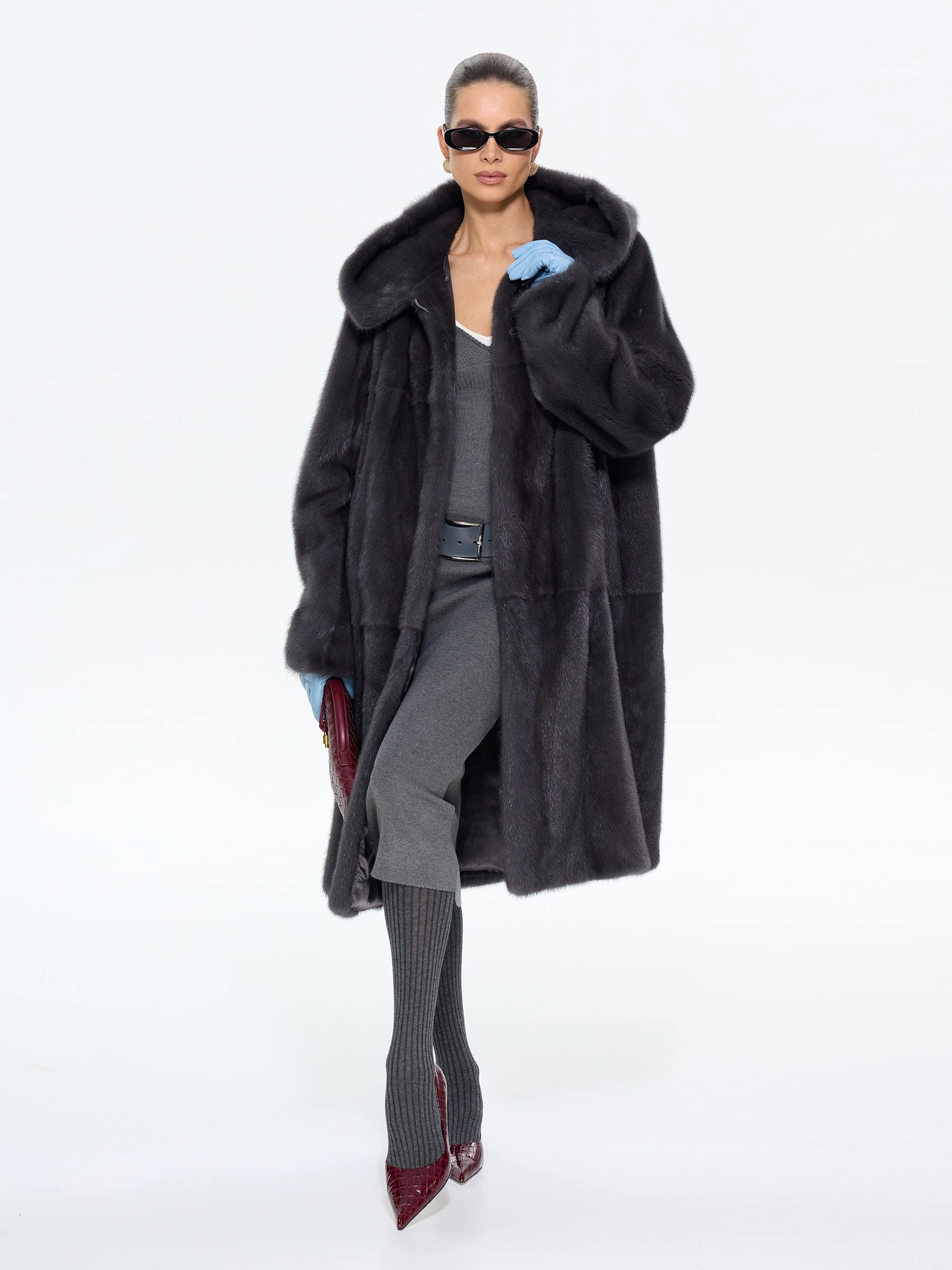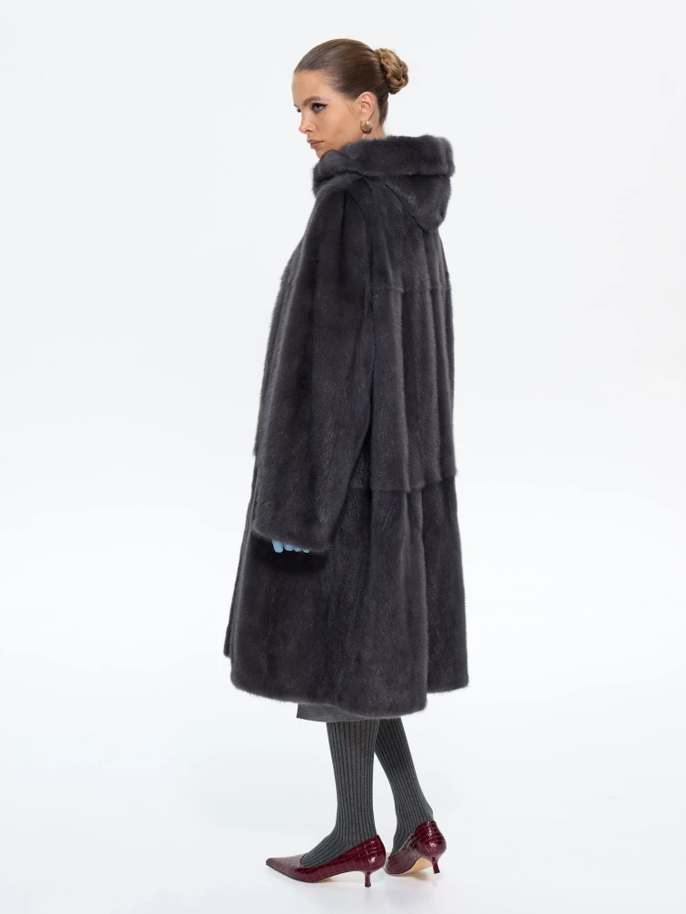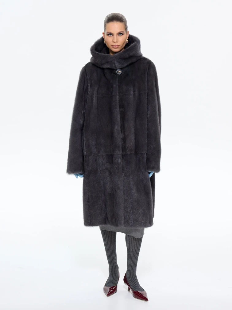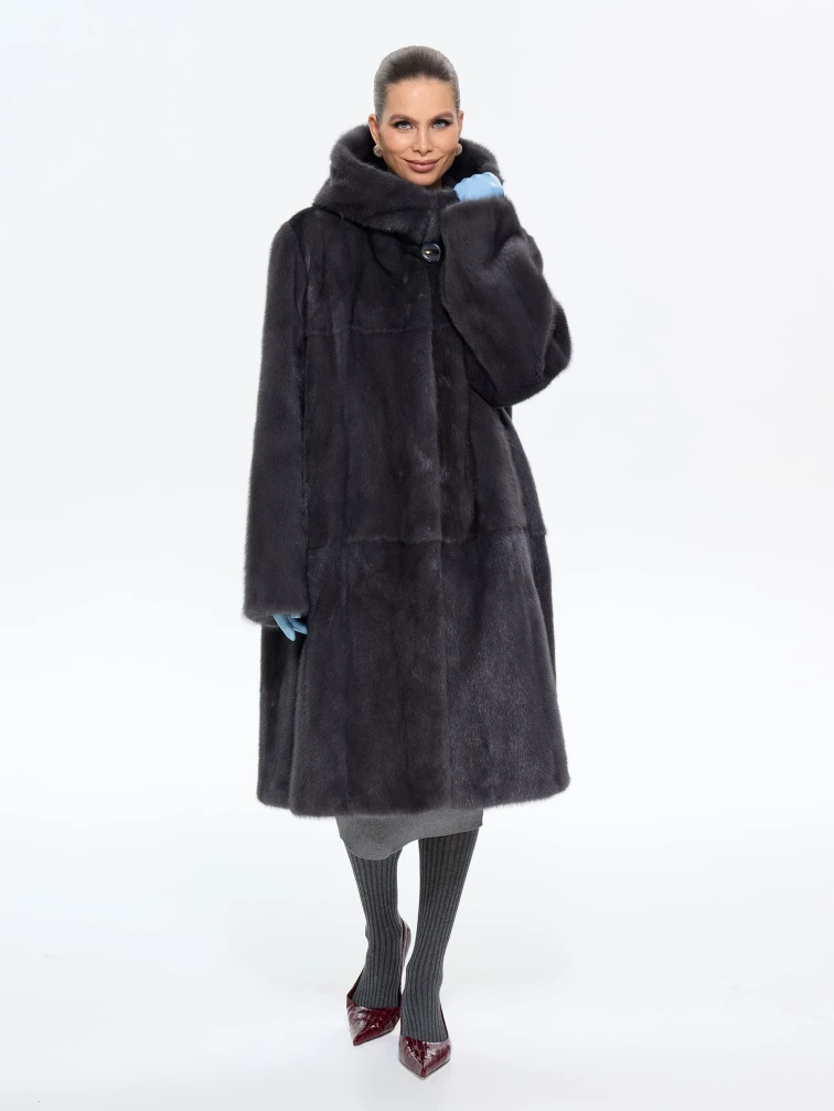 Товар длинная женcкая шуба с капюшоном классика-687, графитовая, размер 62, артикул 65440 выполнен из мех норки с застежкой клипсы. Рассчитан на сезон: зима. Длина изделия 100 см, силуэт прямой.