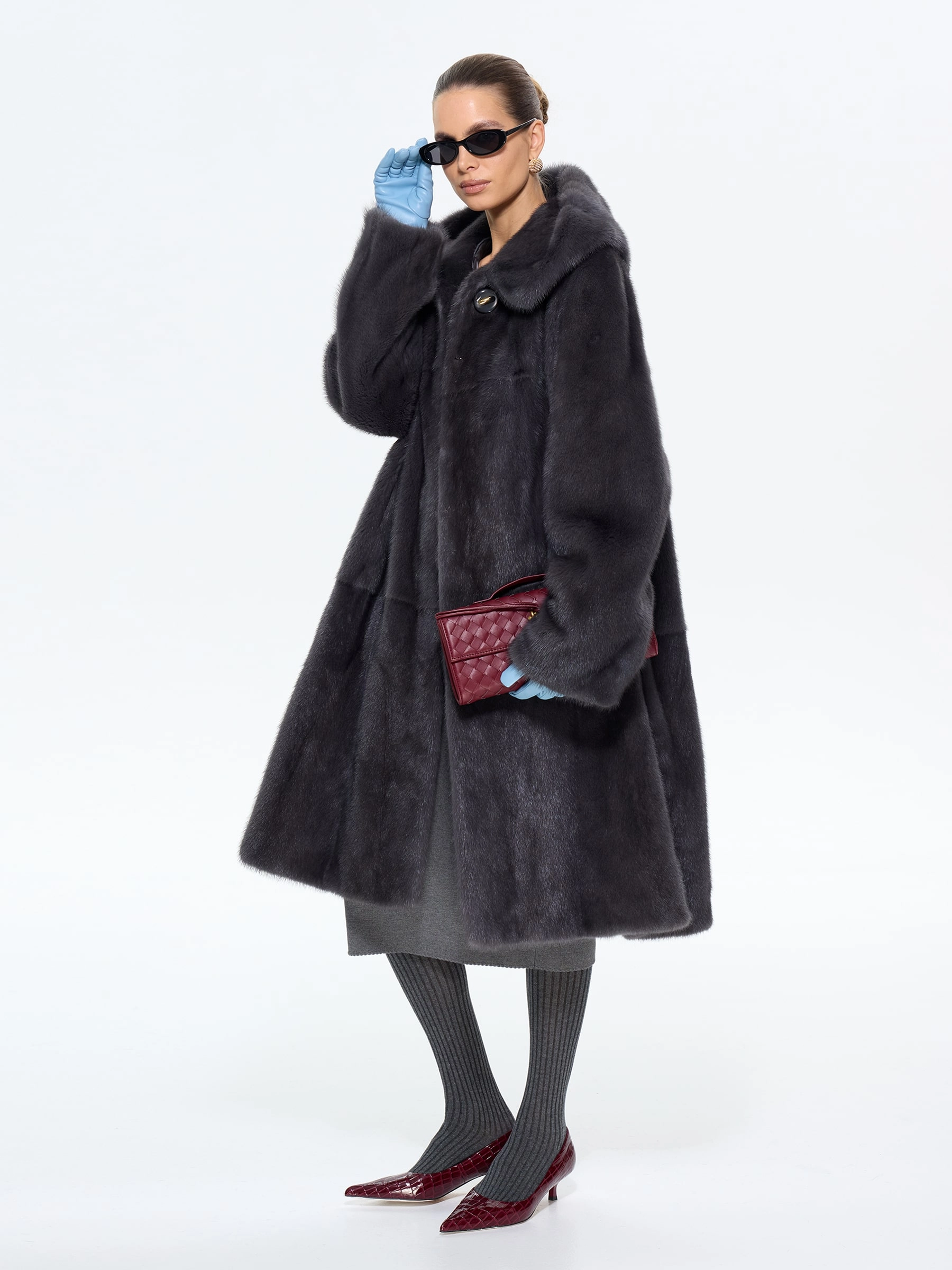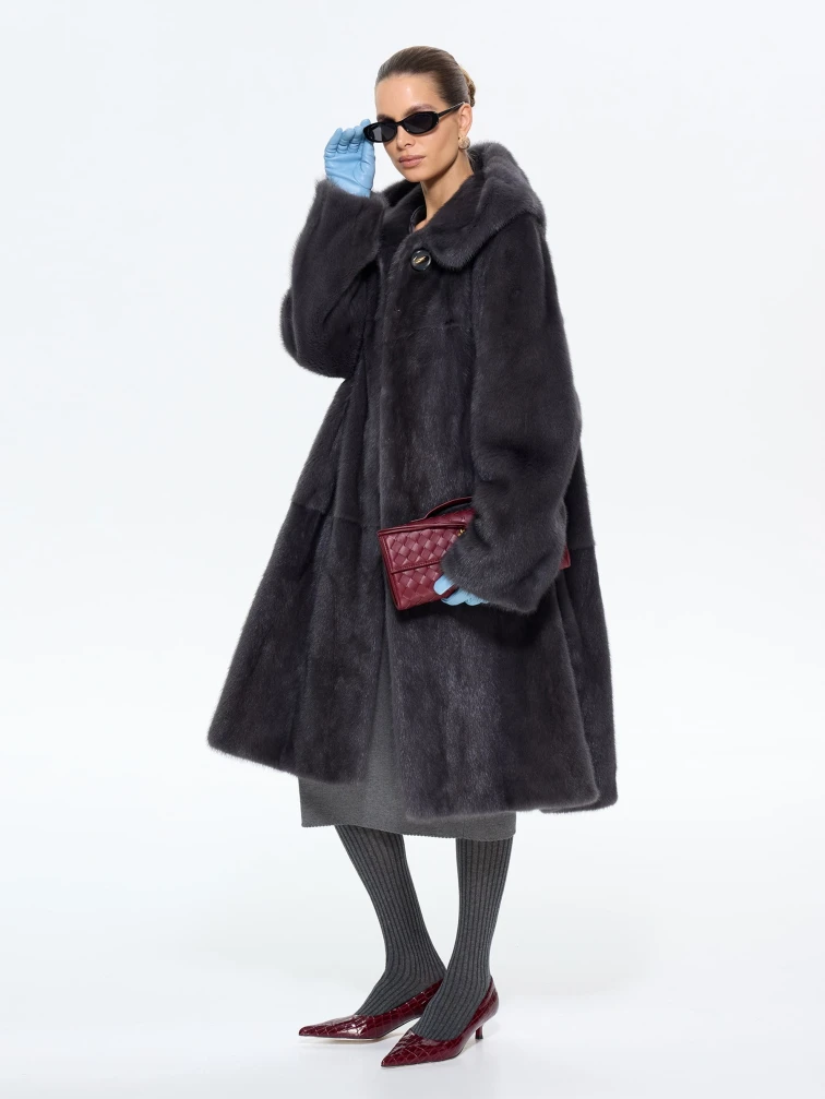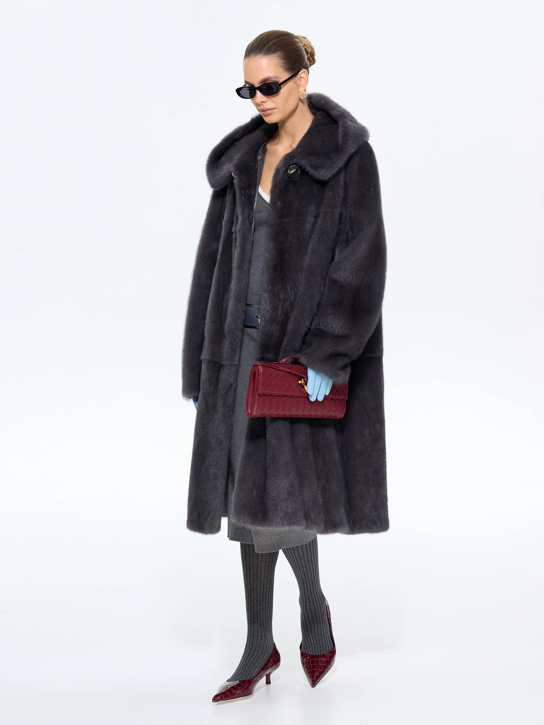 Товар длинная женcкая шуба с капюшоном классика-687, графитовая, размер 62, артикул 65440 выполнен из мех норки с застежкой клипсы. Рассчитан на сезон: зима. Длина изделия 100 см, силуэт прямой.