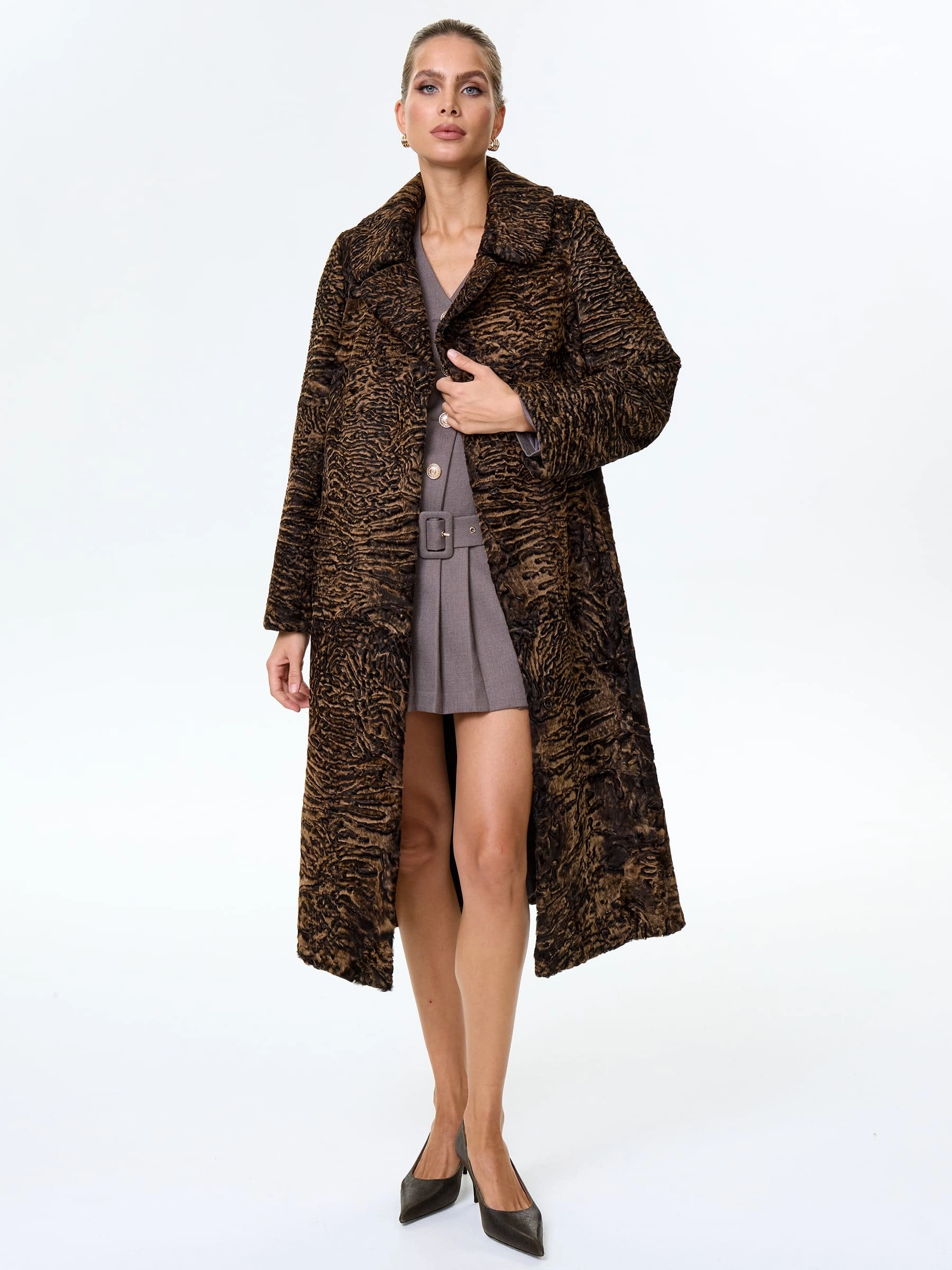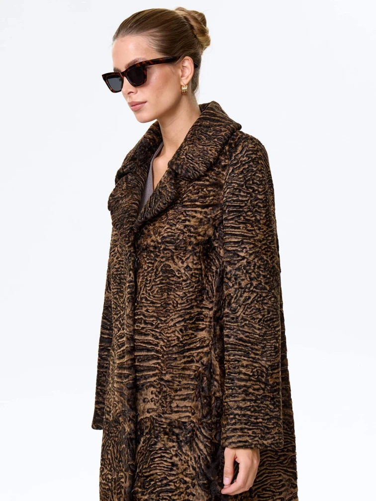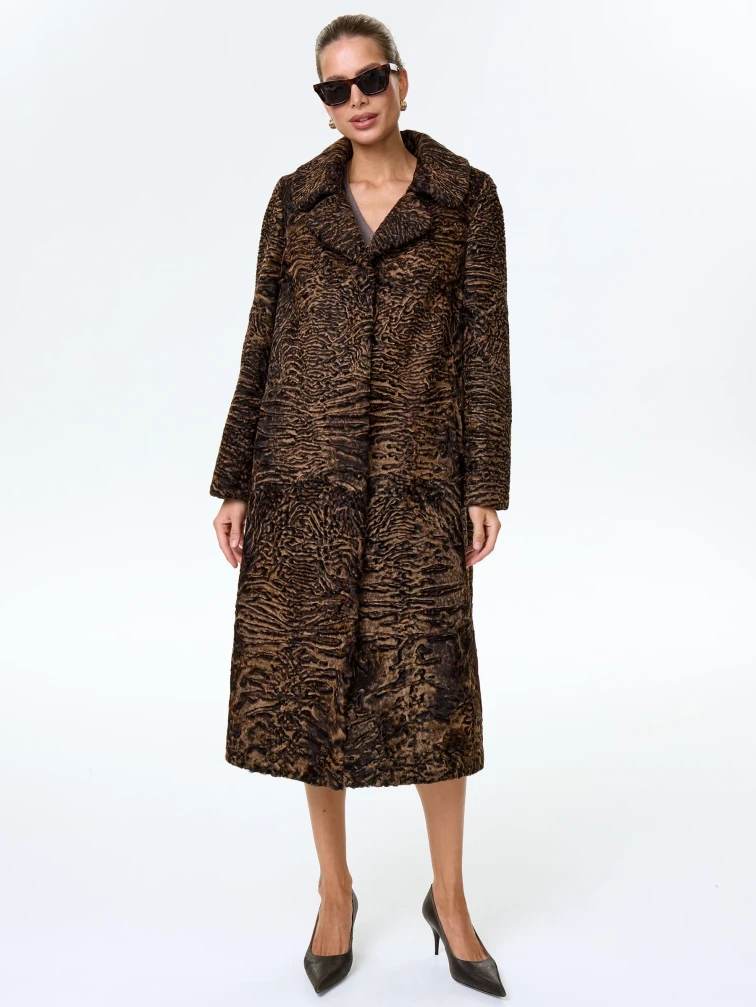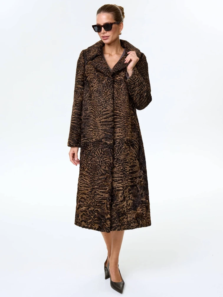 Товар длинная женская шуба из меха каракульчи премиум класса лола(ав), темно-коричневая, размер 50, артикул 34000 выполнен из каракульча с застежкой клипсы. Рассчитан на сезон: весна-осень. Длина изделия 118 см, силуэт прямой.