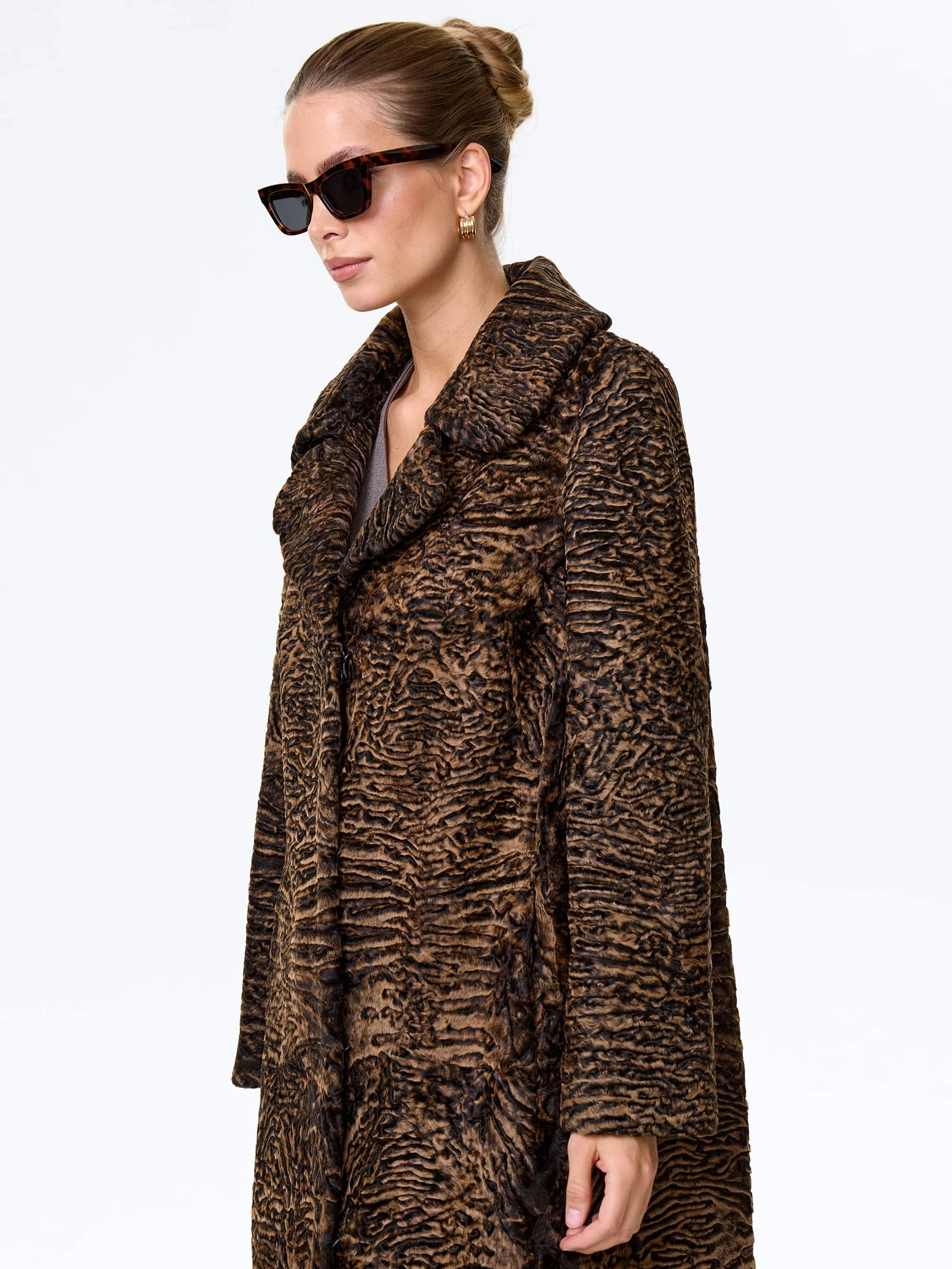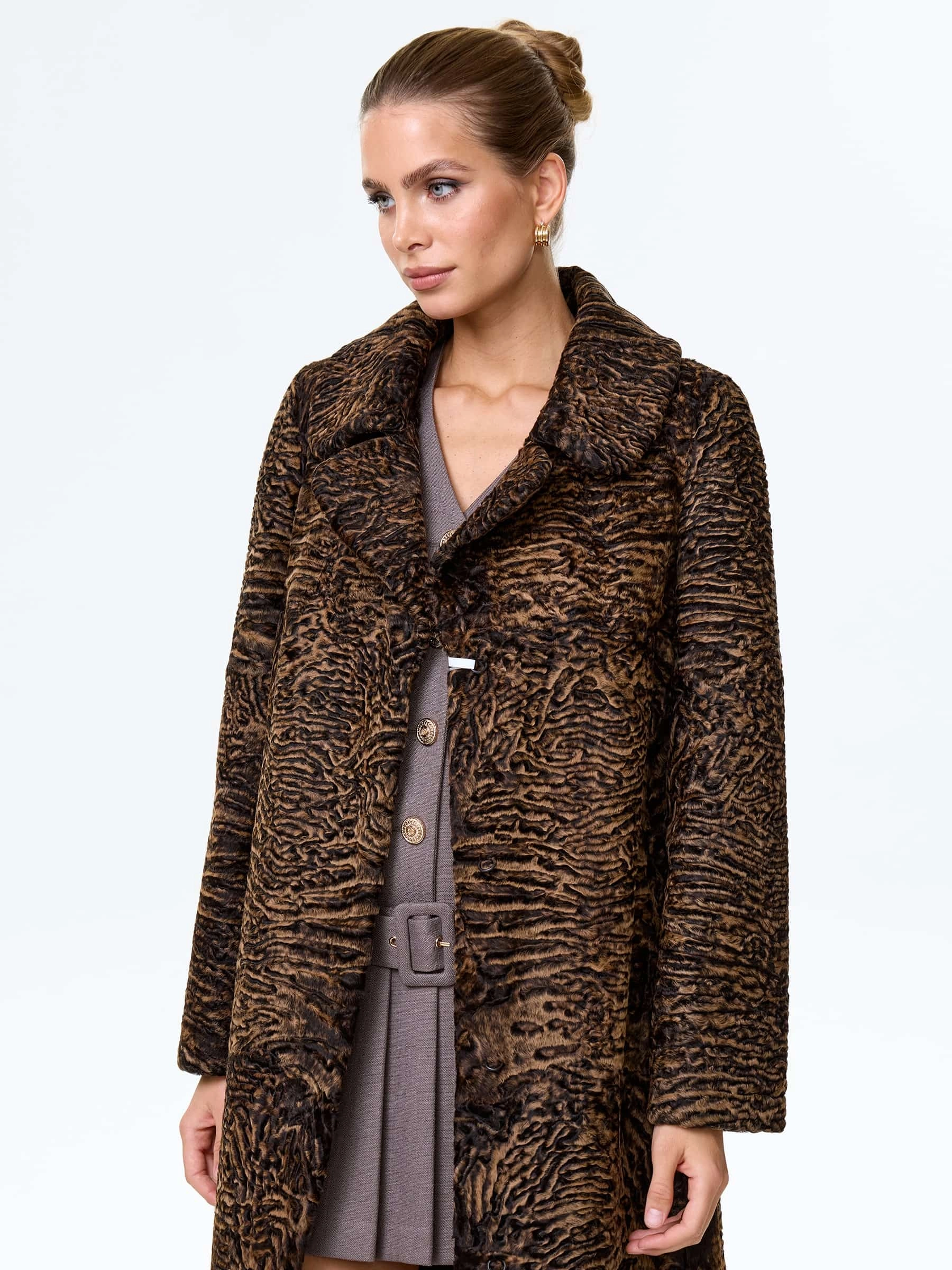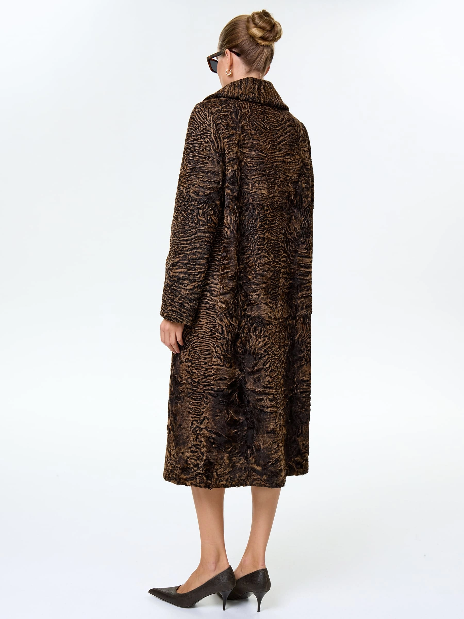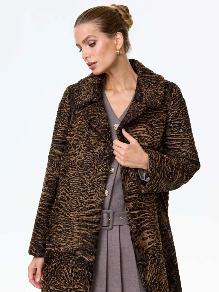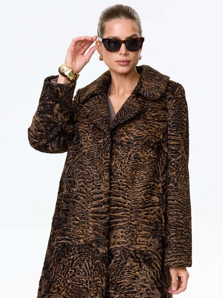 Афганская каракульча темно-коричневого цвета. Английский воротник. Аккуратная работа портных. Чёткая посадка по фигуре. Премиальное качество.