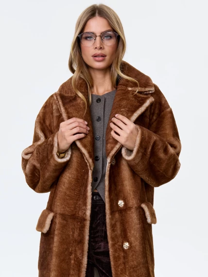 Товар длинное женское пальто из натуральной овчины астрагана премиум класса 2053, коричневое, размер 48, артикул 64370 выполнен из овчина "мерино" с застежкой кнопки. Рассчитан на сезон: осень-зима. Длина изделия 126 см, силуэт прямой.