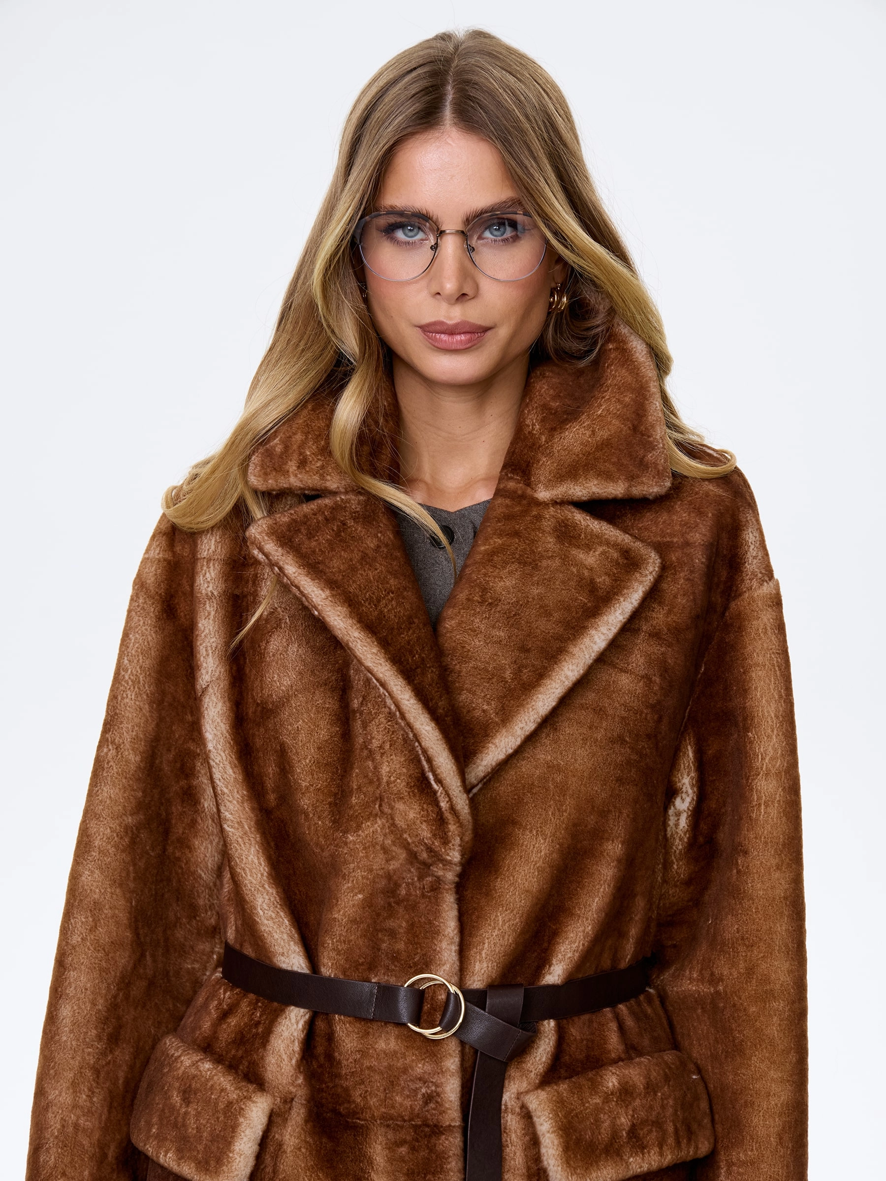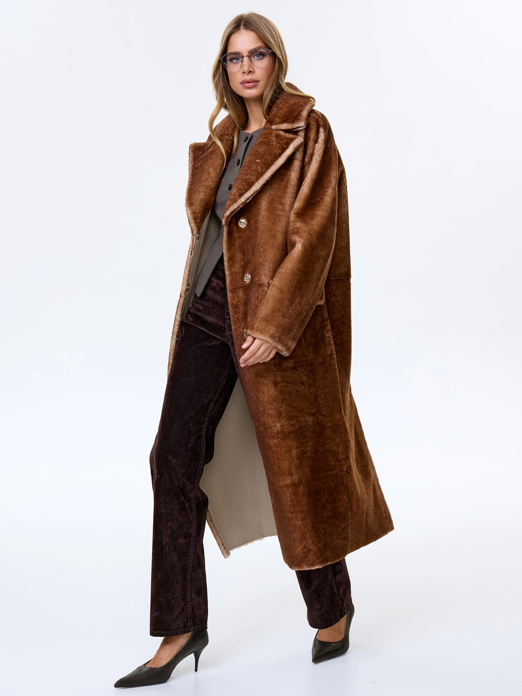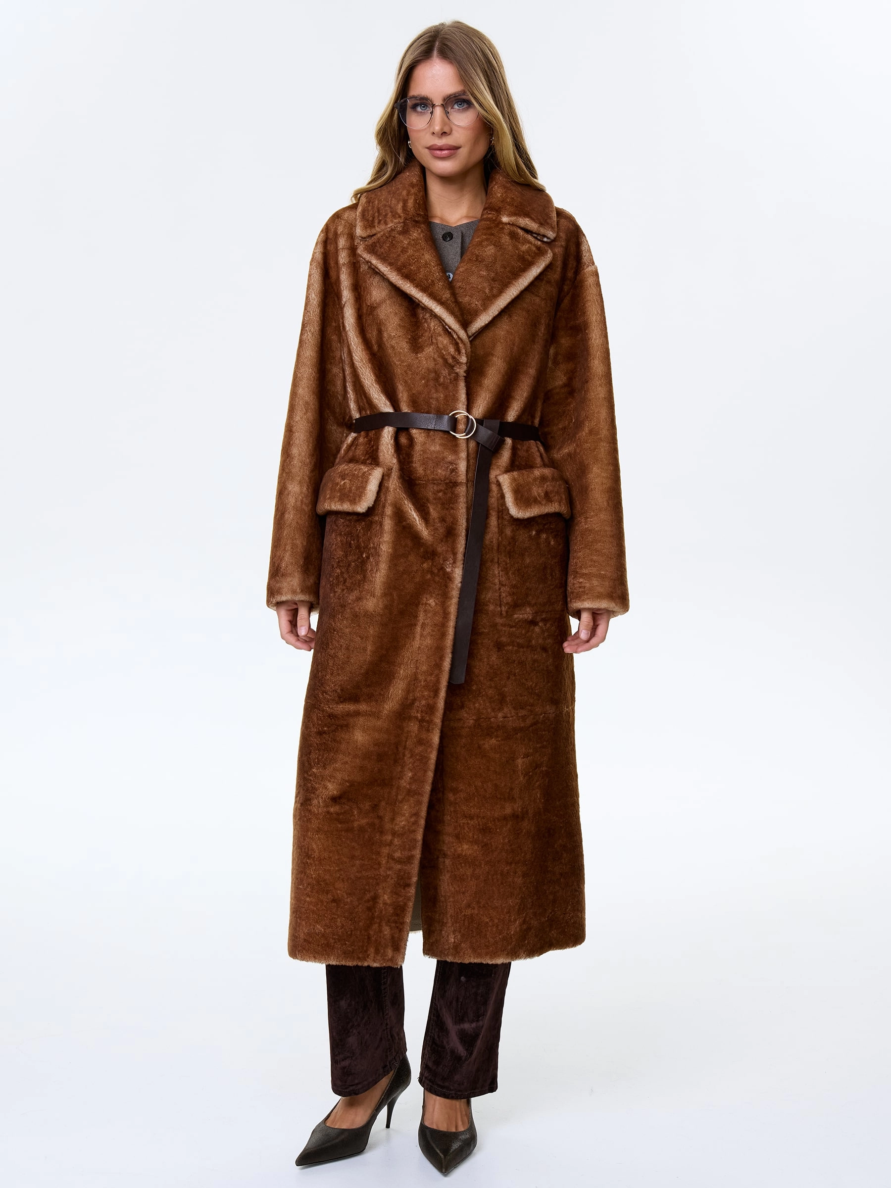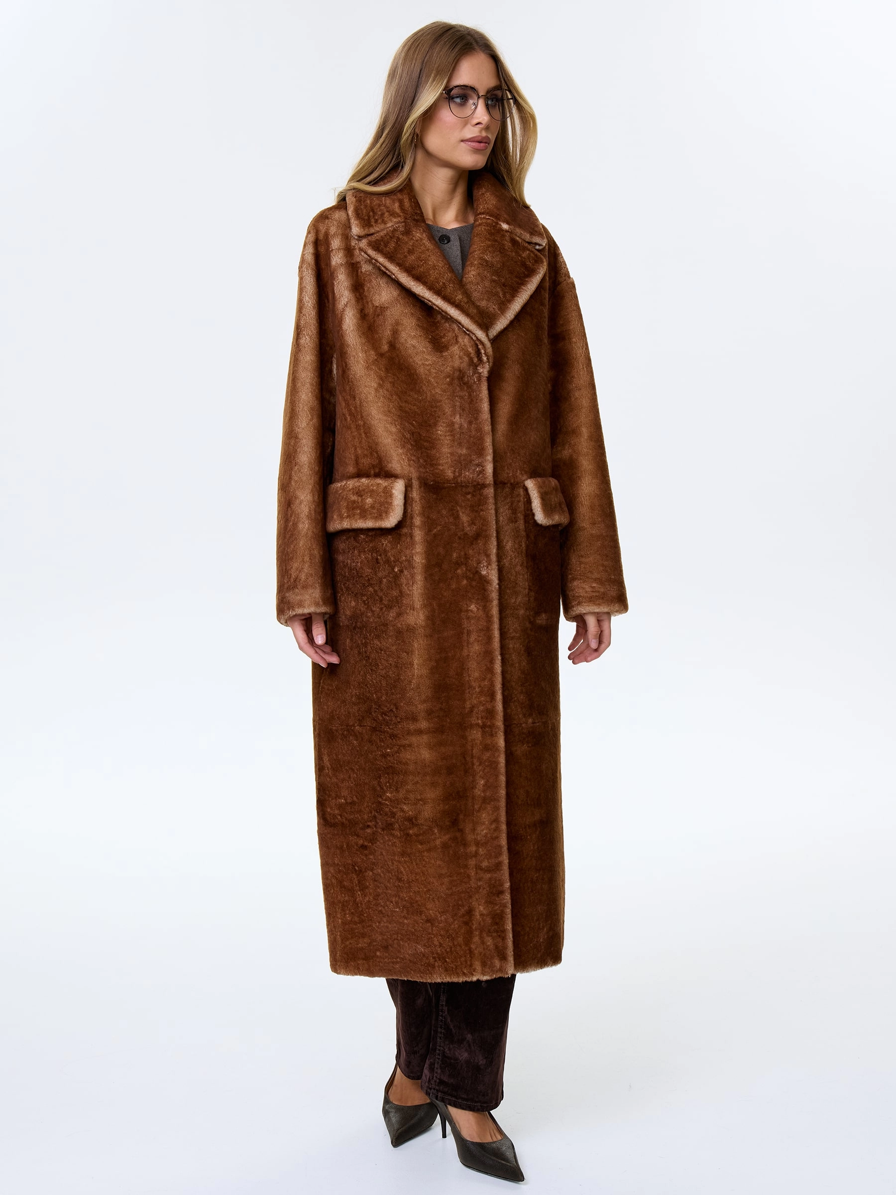 Сдержанное и одновременно стильное пальто с английским воротником и широкими лацканами выполнили из мягкой овчины. Прямой крой изделия обеспечивает комфортную посадку по фигуре и не ограничивает движения. Модель дополнили большими накладными карманами закрывающиеся клапанами. Застежка - кнопки.
