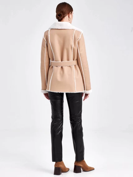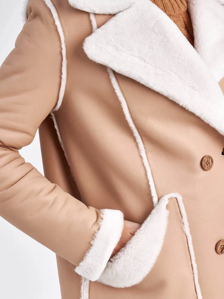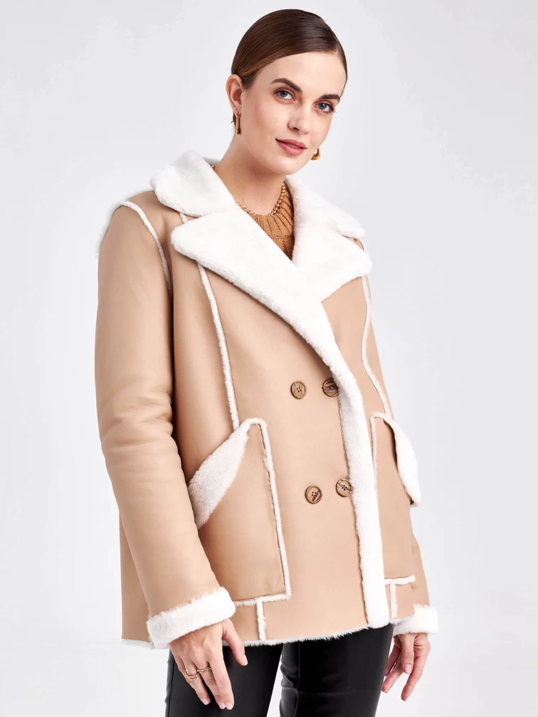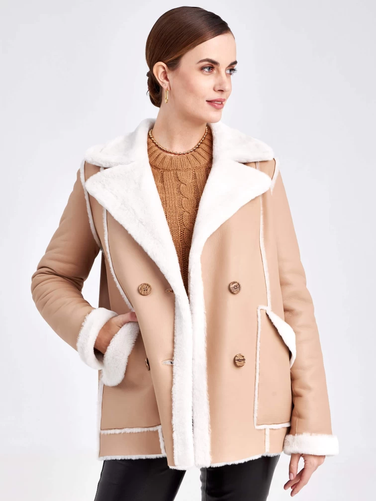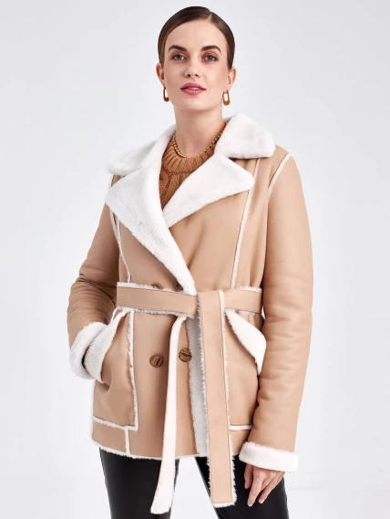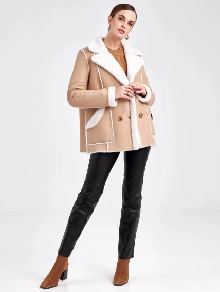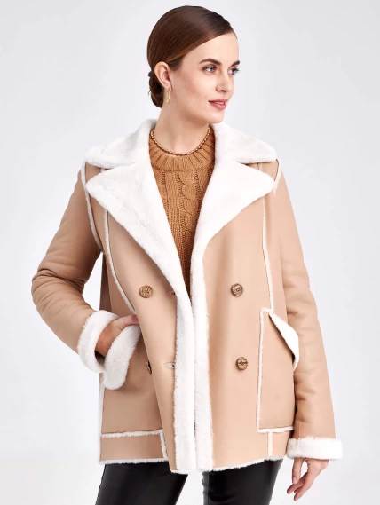 Двубортная короткая женская дубленка премиум класса 2010, бежевая, размер 46, артикул 62651