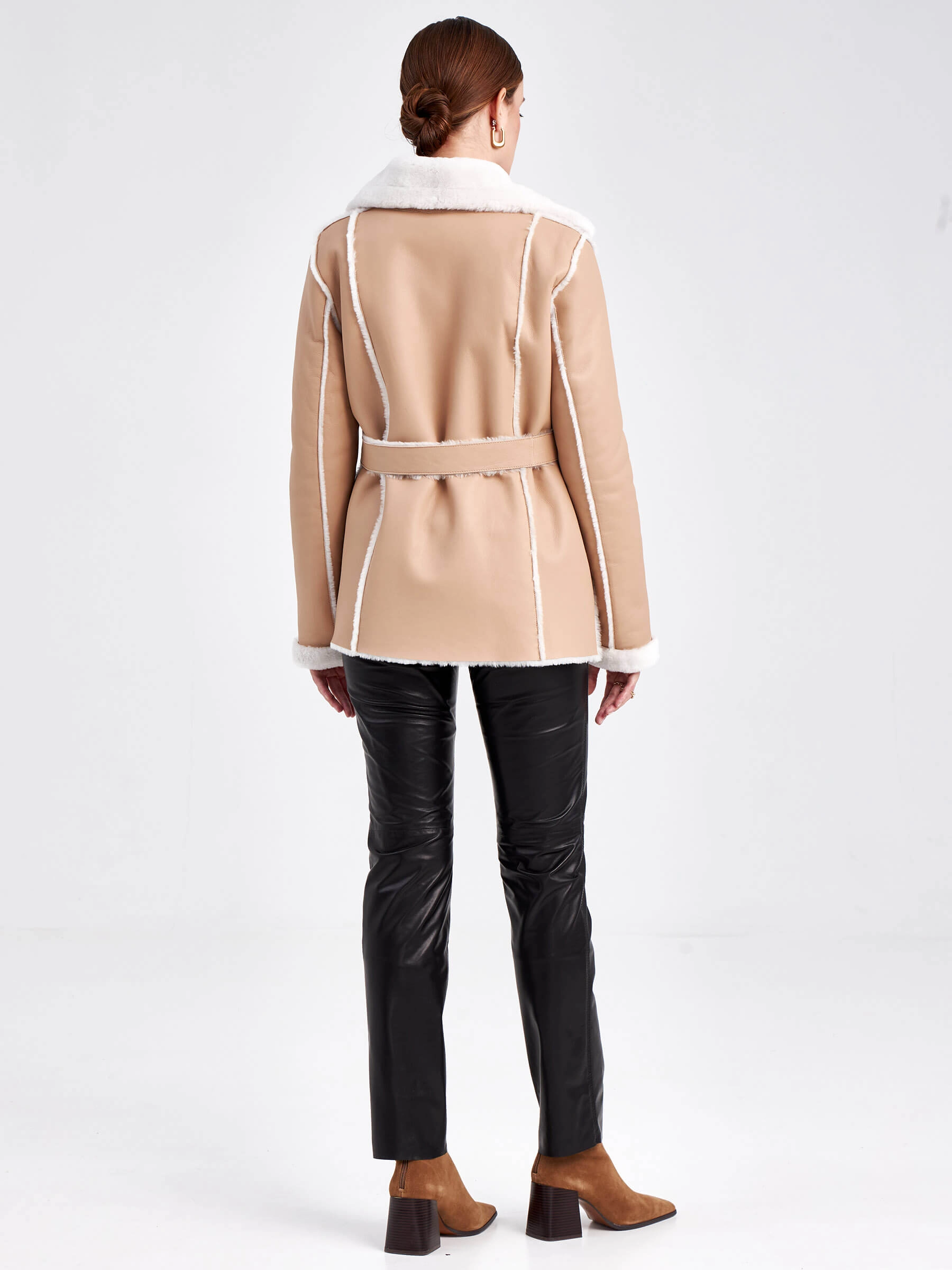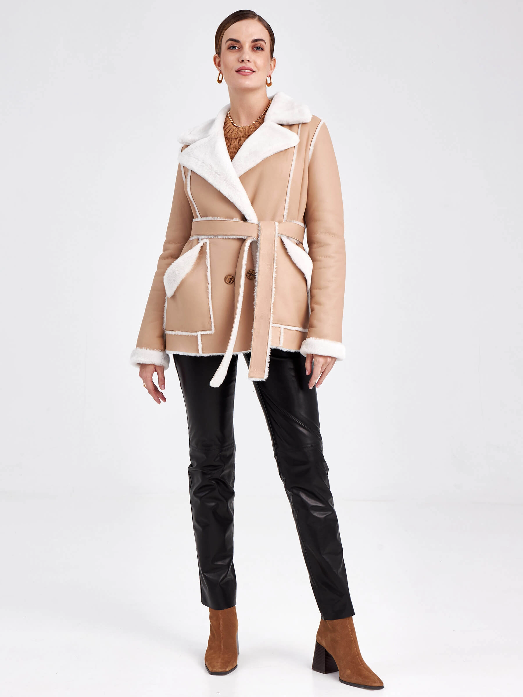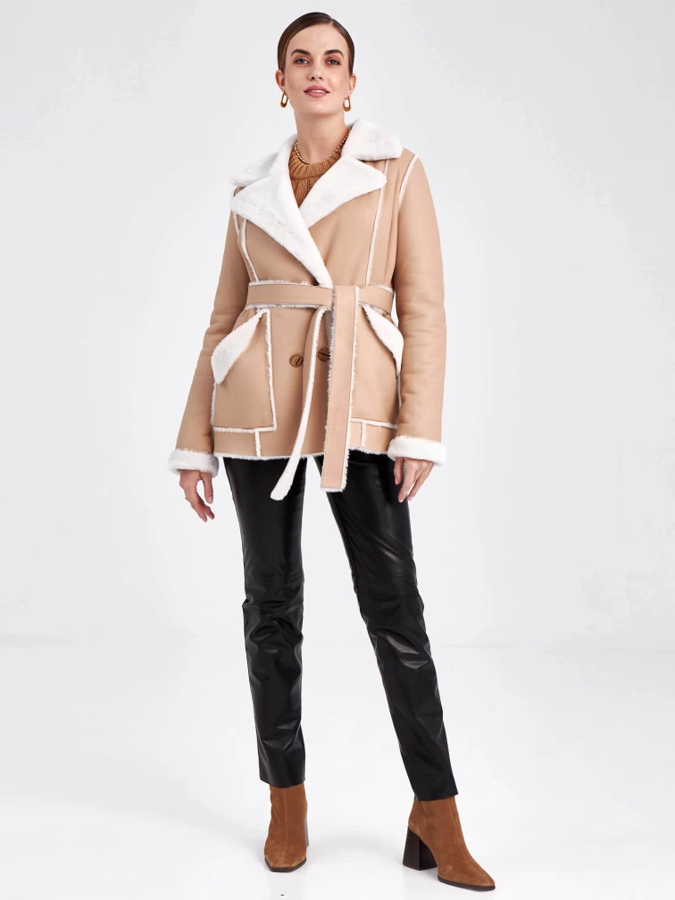 Двубортная короткая женская дубленка премиум класса 2010, бежевая, размер 46, артикул 62651