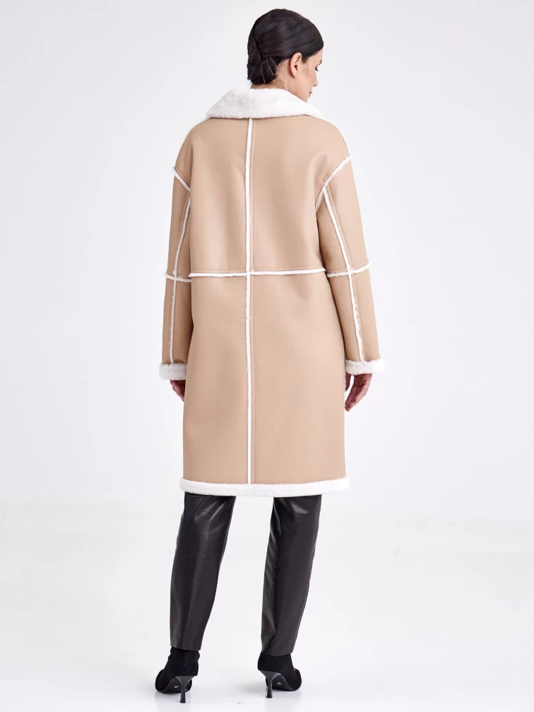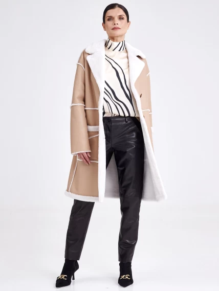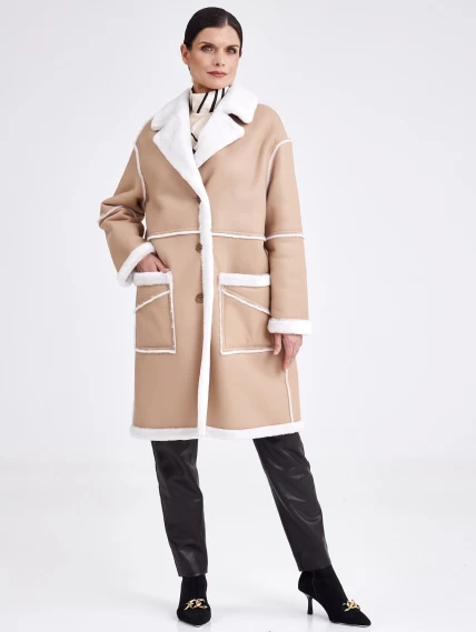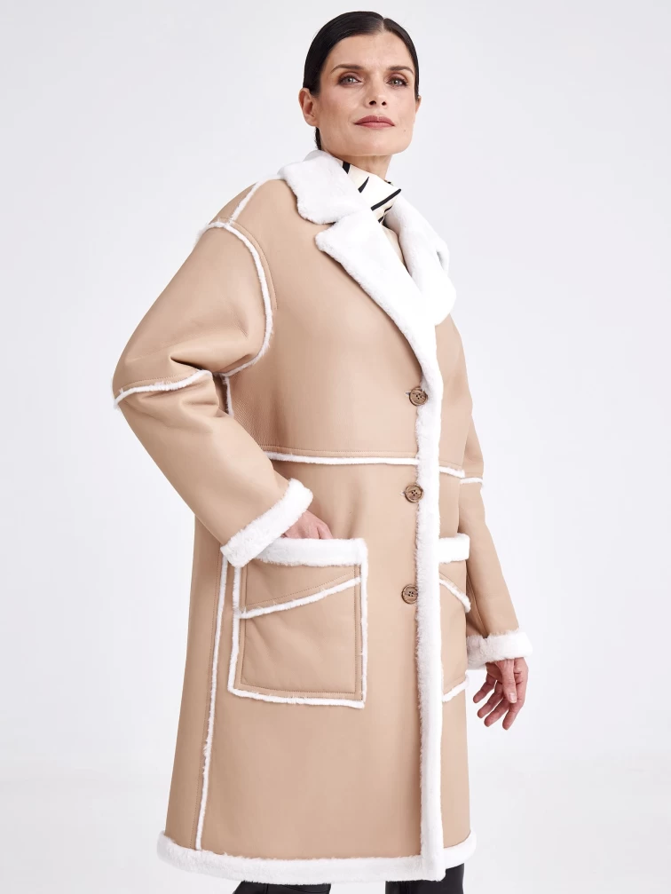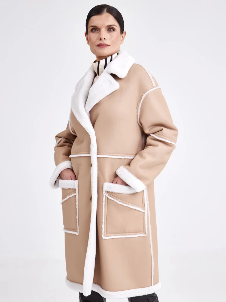 Удлиненная женская дубленка оверсайз премиум класса 2014, бежевая, размер 44, артикул 62710