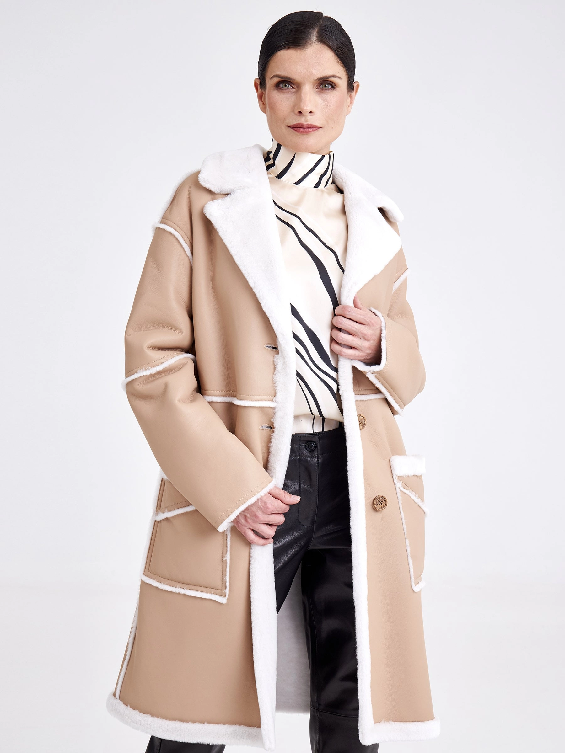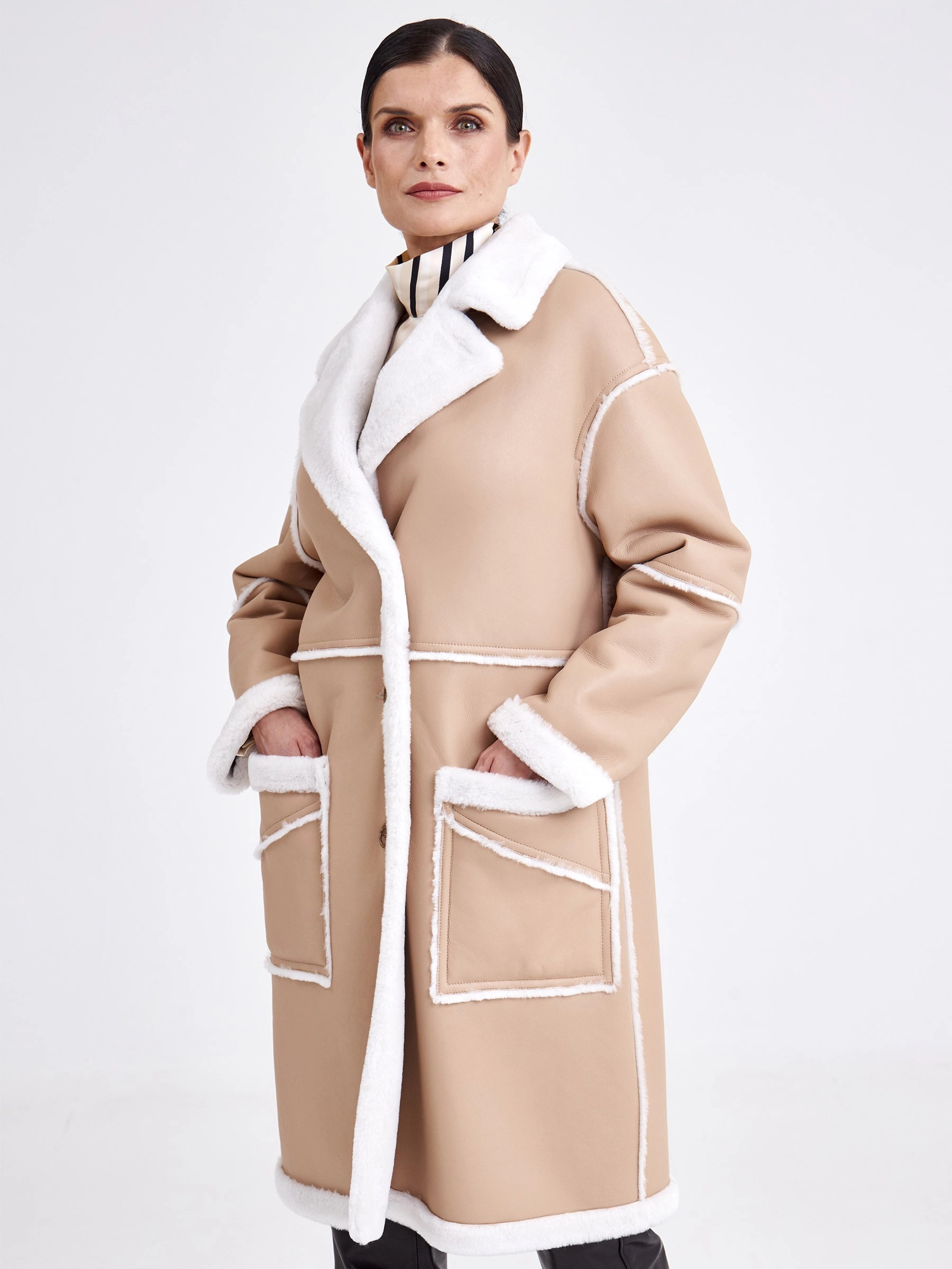 Дубленку с вывернутыми наружу швами выполнили из бережно выделанной овчины в теплом бежевом цвете. Изделие получилось легким и теплым. Застежка-пуговицы. Прямой крой, английский воротник, комфортная посадка. Модель дополнили двумя большими накладными карманами.