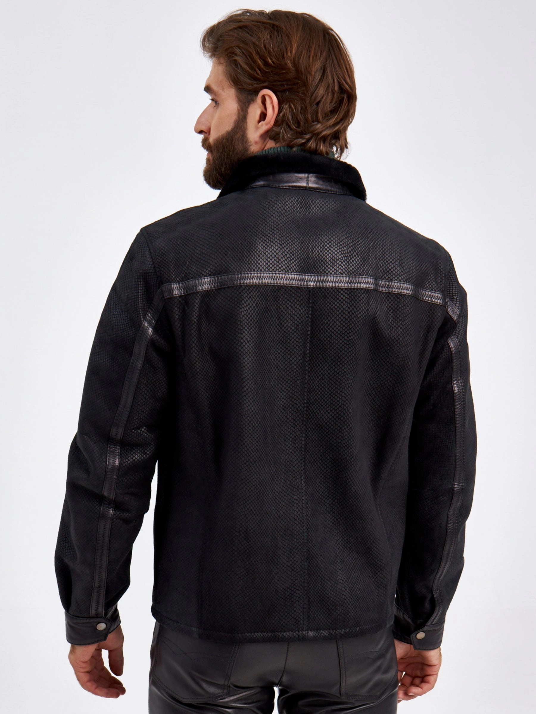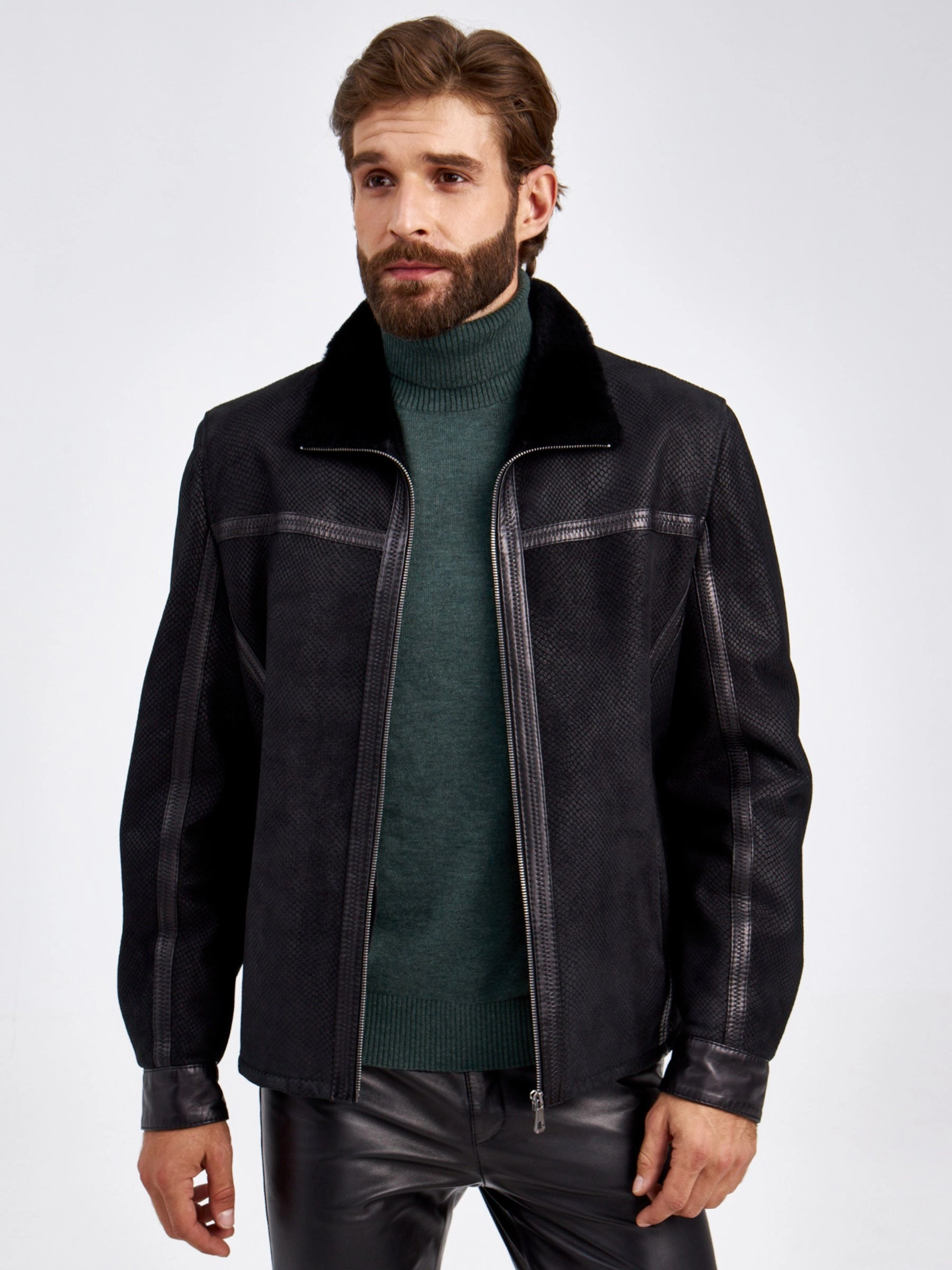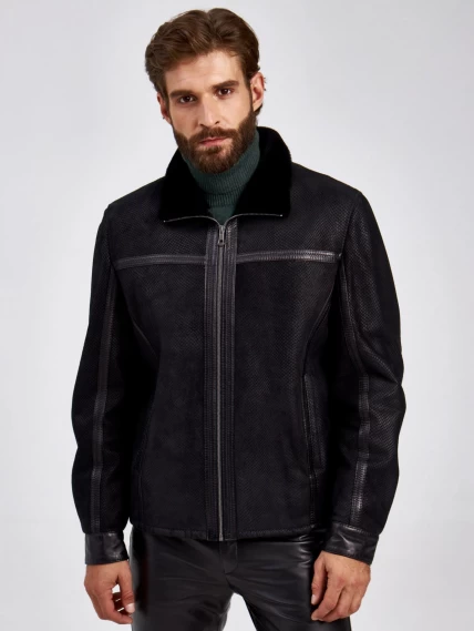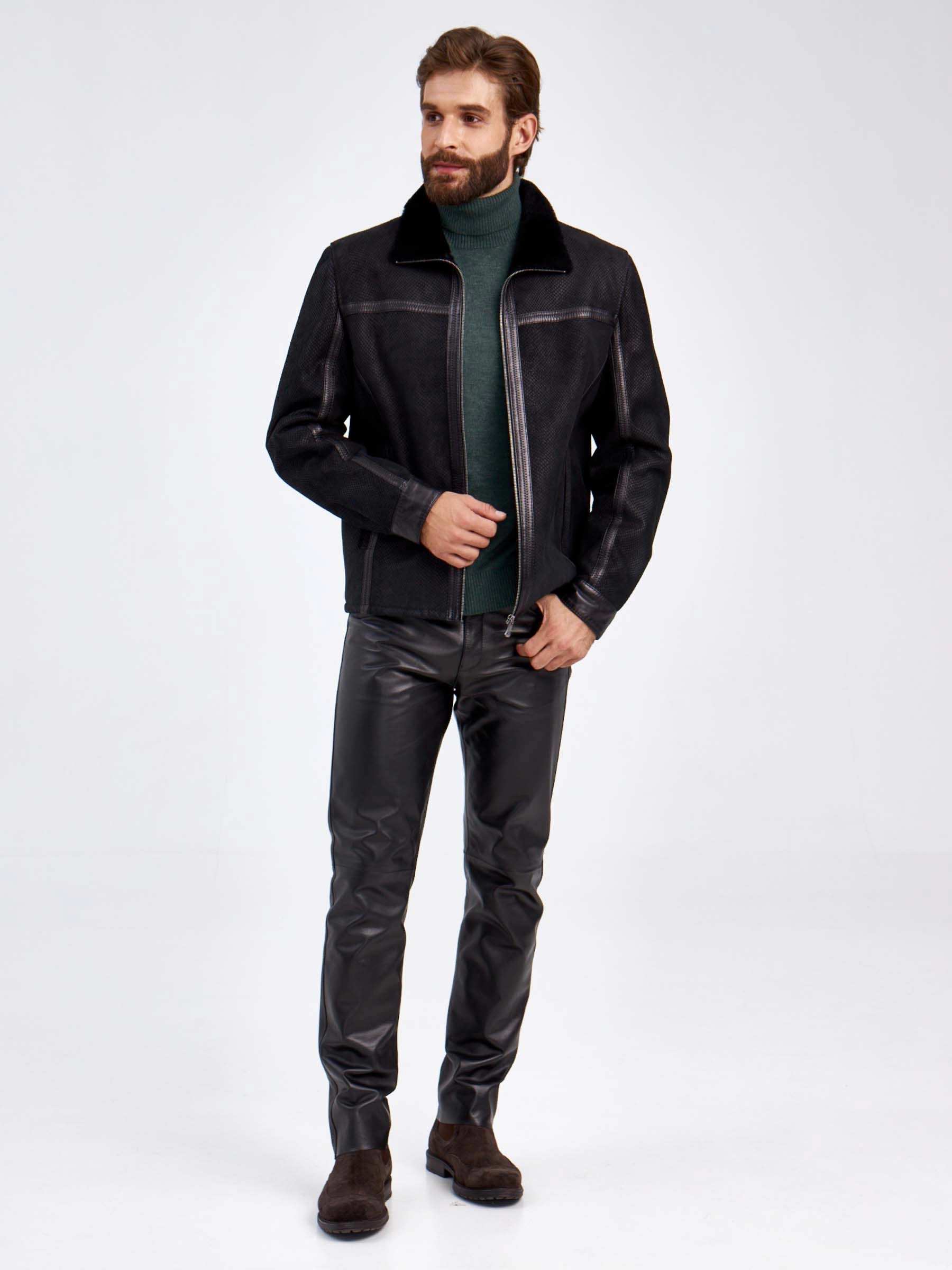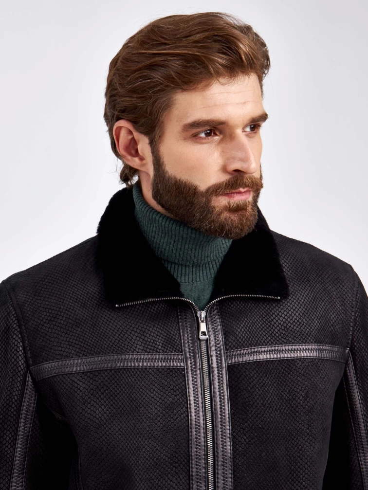 Короткая дубленка- застегивающаяся на молнию в черном цвете. Модель выполнили из испанского мерино. Отложной меховой воротник мягко трансформируется в стойку. Лицевую сторону изделия имитировали под питона. Полуприлегающий силуэт, широкая пройма. Декором послужили канты из натуральной кожи.