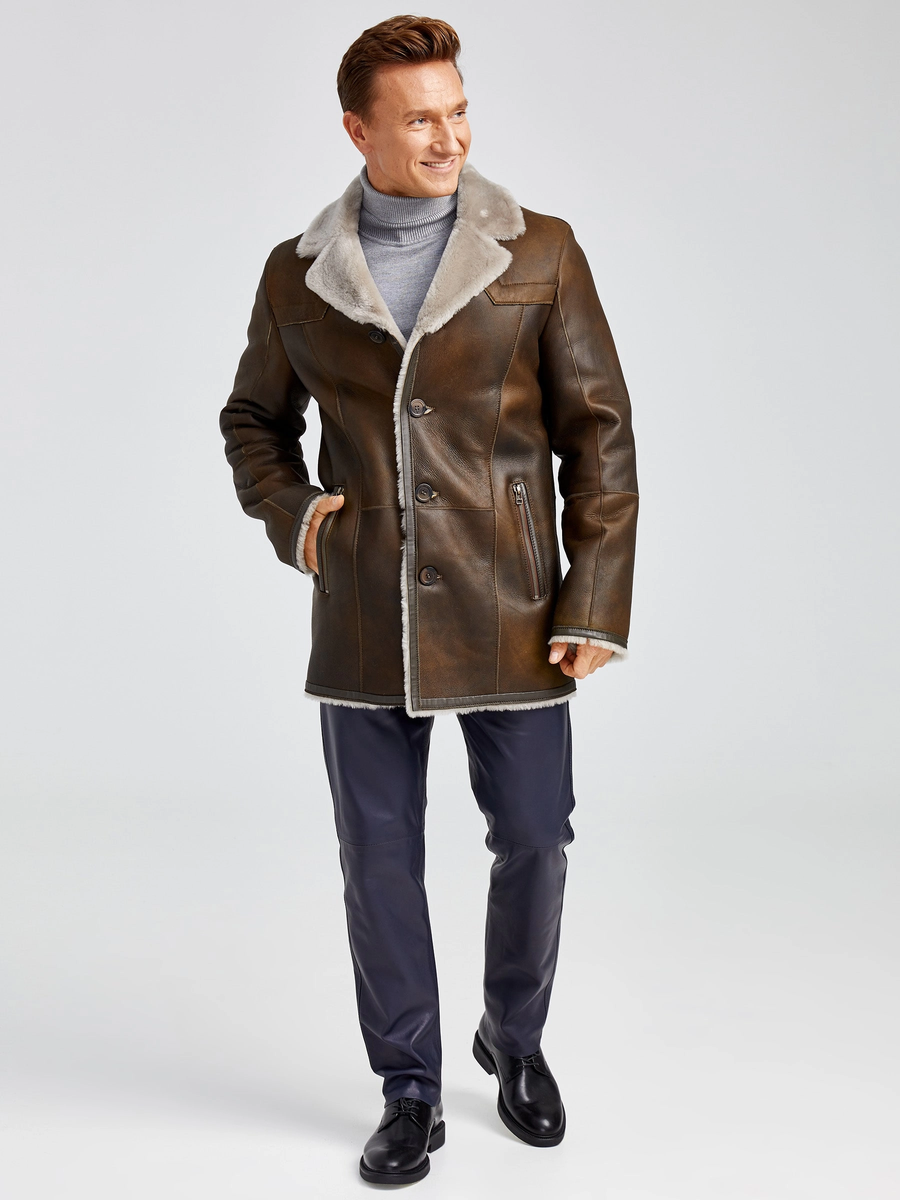 Современная мужская дублёнка, классической длины. Удобные карманы для ключей и документов. Верхняя застёжка закрывает горловину. Новейшее защитное покрытие. Особо прочные нитки. Приятный на ощупь, максимально густой мех мериносной породы овец. Идеальные швы, продуманные и удобные элементы. Аккуратность во всей работе. Чёткая и очень удобная посадка по фигуре. Великолепная свобода движений. Абсолютный комфорт.
