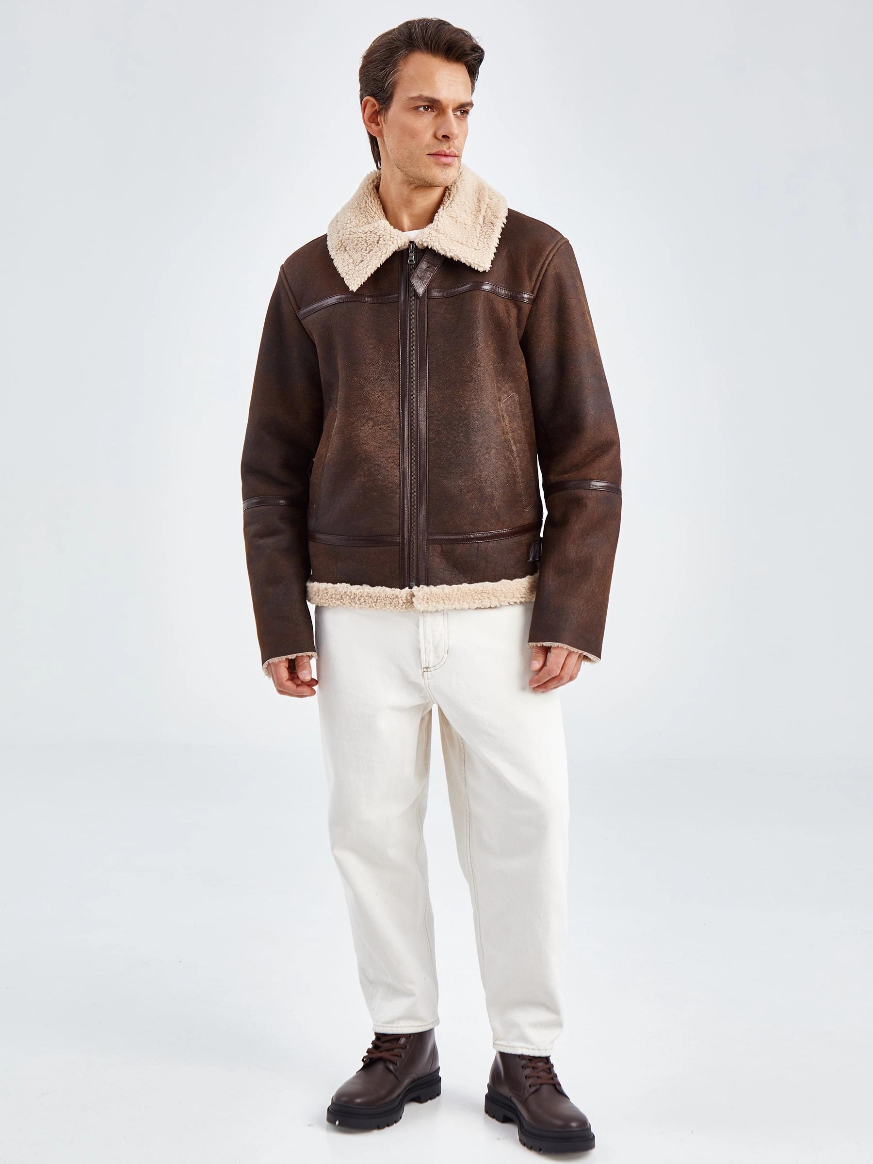 Товар короткая мужская дубленка пилот из овчины керли премиум класса 430, коричневая, размер 48, артикул 70571 выполнен из овчина "мерино" с застежкой молния. Рассчитан на сезон: осень-зима. Длина изделия 70 см, силуэт прямой.