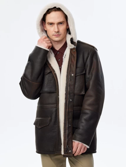 Дубленка мужская с капюшоном премиум класса 433, коричневая, размер 50, артикул 70751