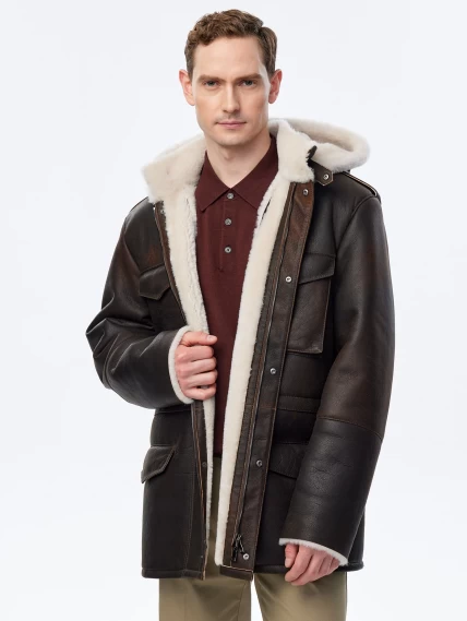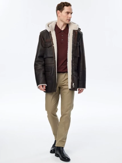 Товар дубленка мужская с капюшоном премиум класса 433, коричневая, размер 50, артикул 70751 выполнен из овчина "мерино" с застежкой молния. Рассчитан на сезон: осень-зима. Длина изделия 81 см, силуэт прямой.