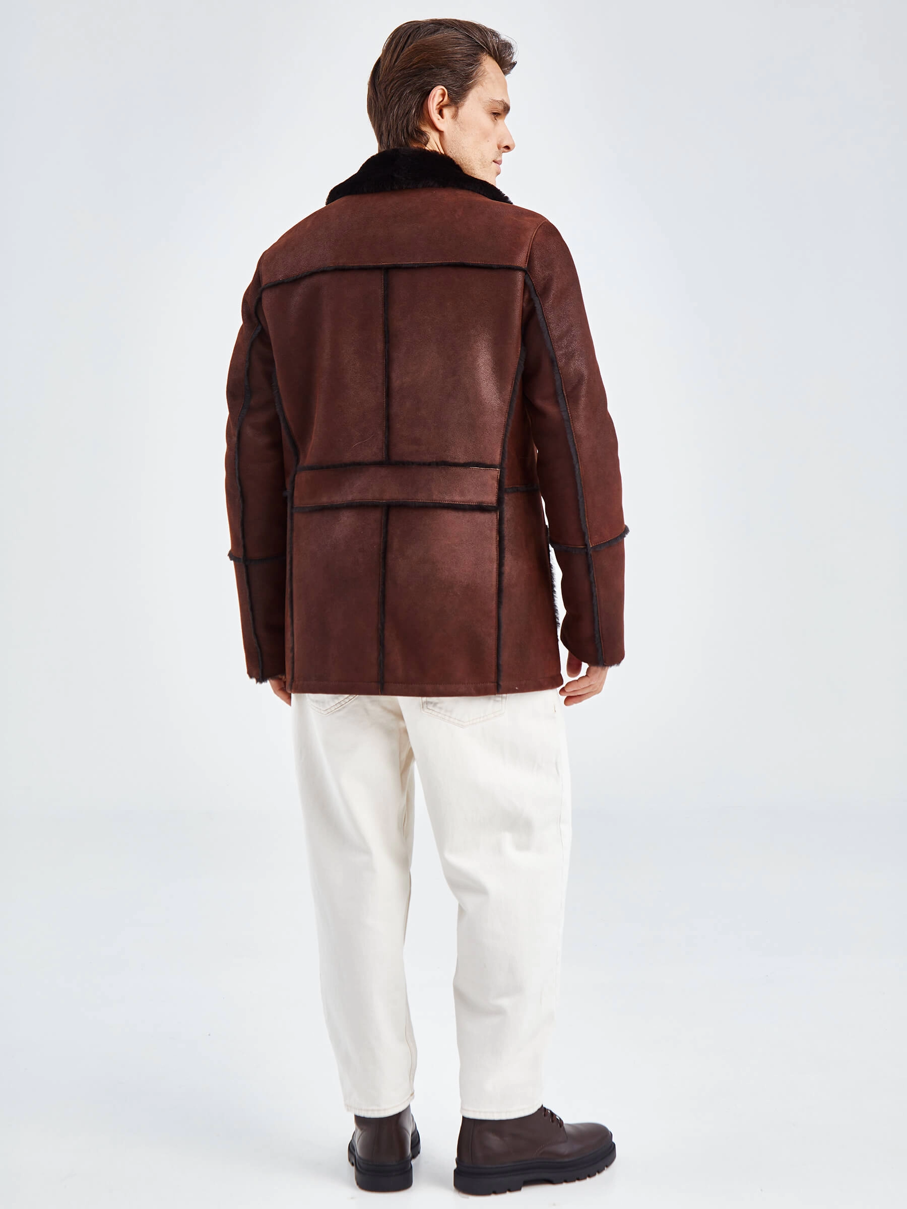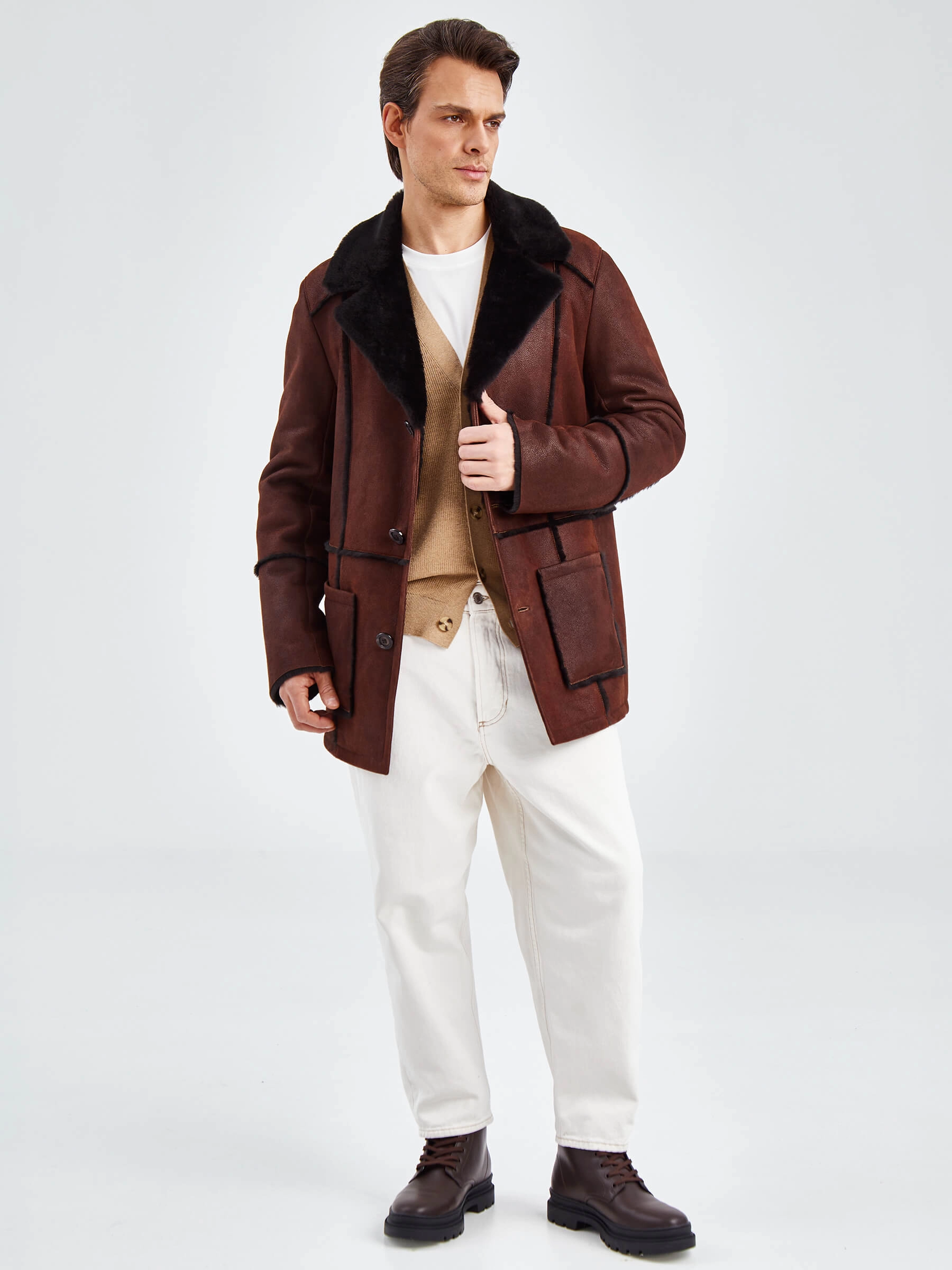 Товар дубленка пиджак с выпущенным мехом для мужчин премиум класса 434, виски, размер 54, артикул 71440 выполнен из овчина "мерино" с застежкой пуговицы. Рассчитан на сезон: осень-зима. Длина изделия 81 см, силуэт прямой.