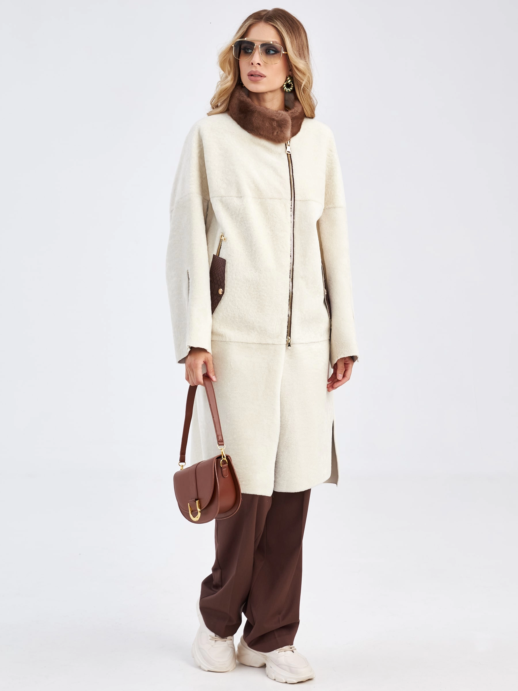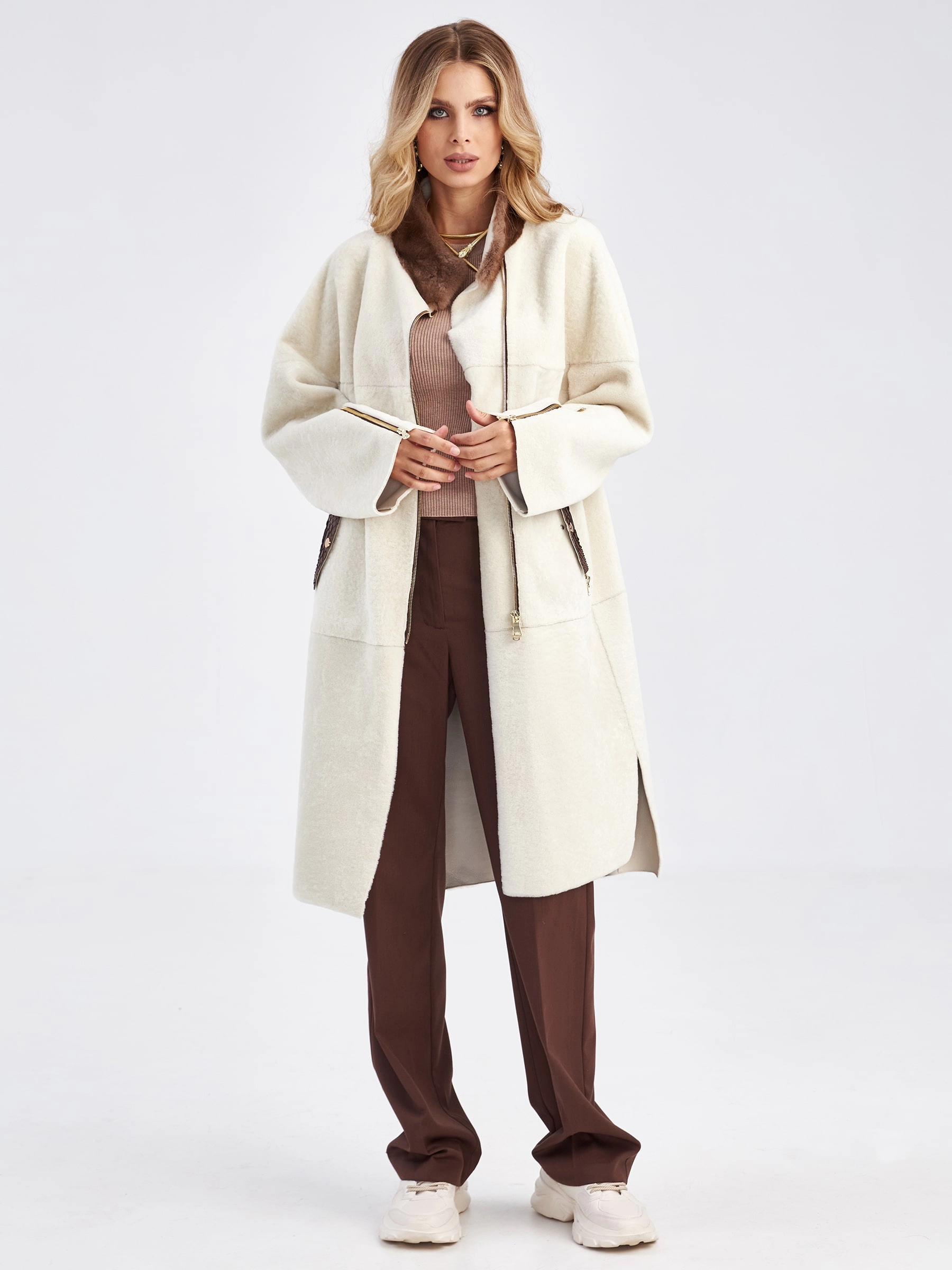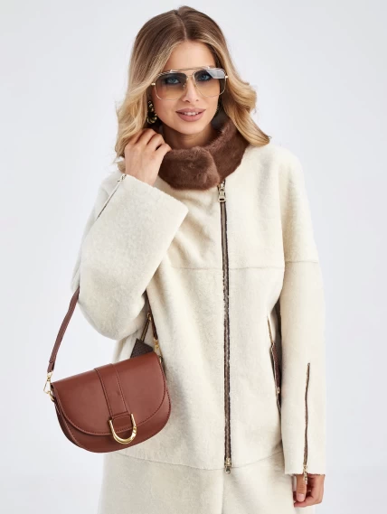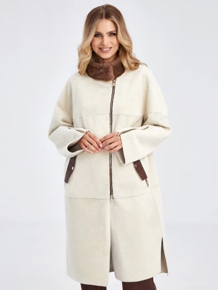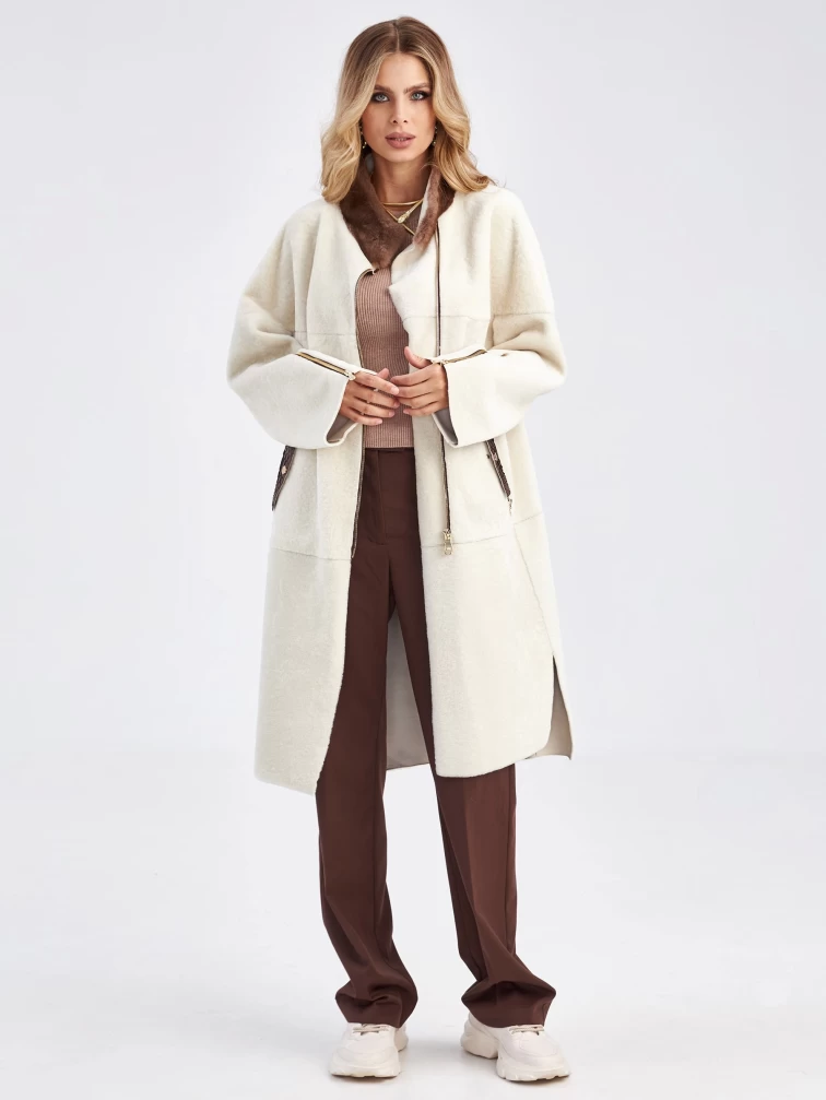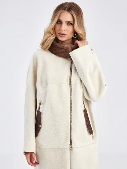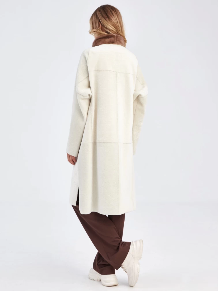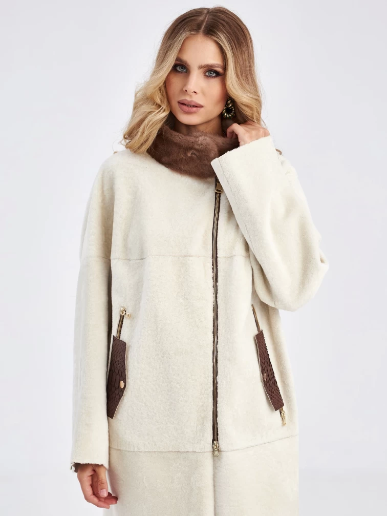Товар женская молодежная дубленка с воротником из меха норки премиум класса 2022, белая, размер 48, артикул 63030 выполнен из овчина "мерино" с застежкой молния. Рассчитан на сезон: осень-зима. Длина изделия 105 см, силуэт прямой.