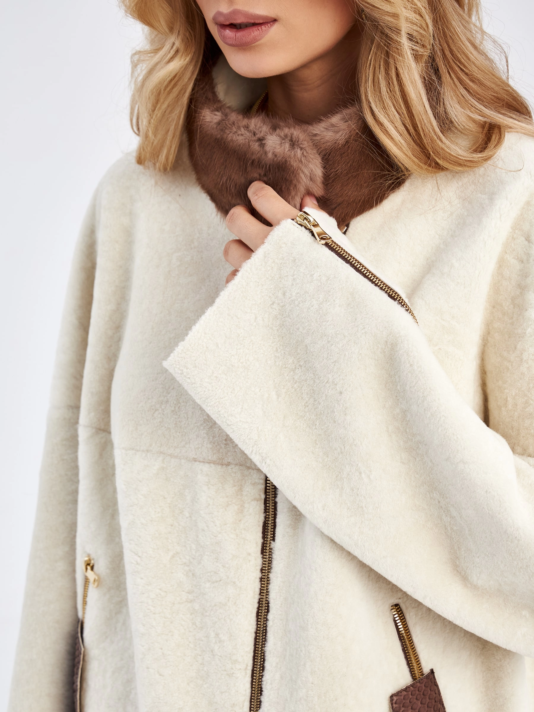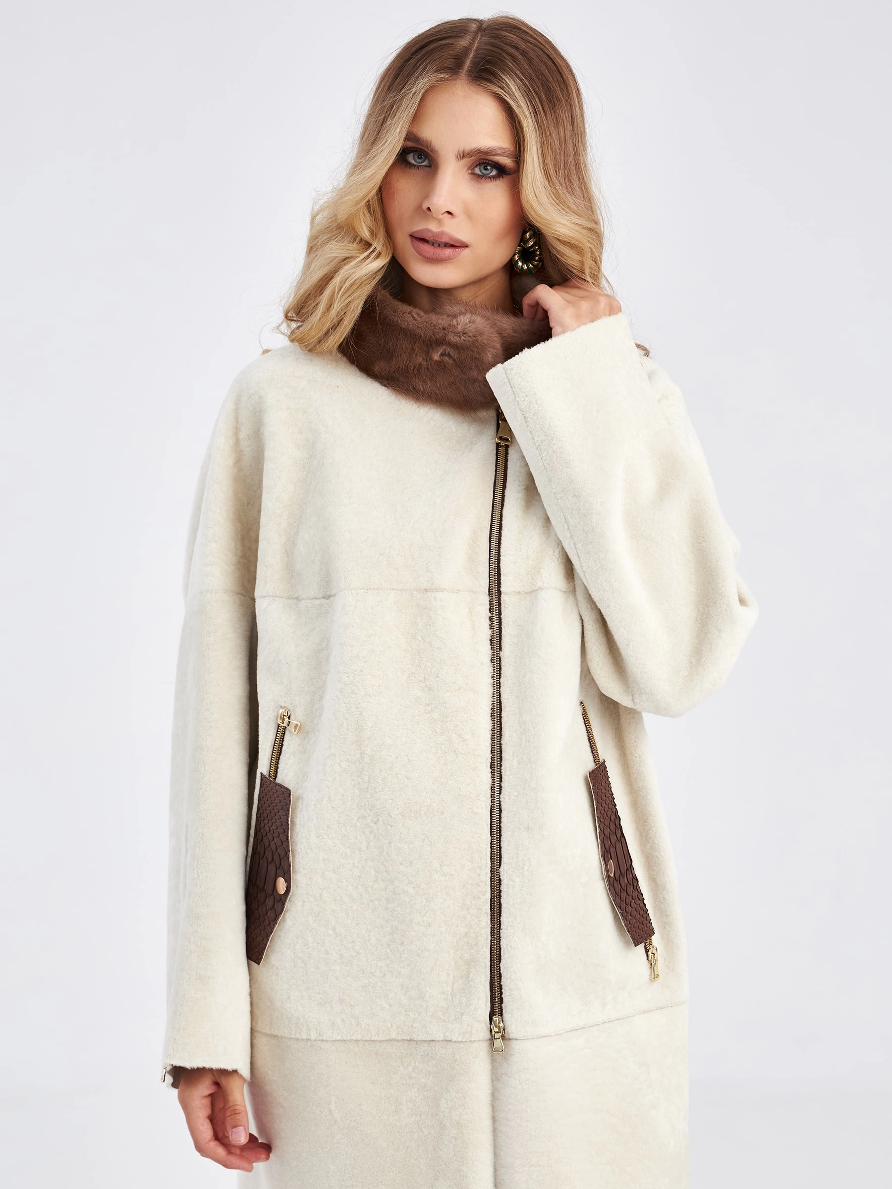 Дубленка выполненная из мягкой овчины ягнят не оставит равнодушной ни одну модницу. Стиль и комфорт этой модели говорят сами за себя. Свободный крой, воротник - стойка с меховой отделкой пушистой норки, широкий рукав, глубокие разрезы по бокам. Дополнением к модели послужили молнии на рукавах и карманах закрывающиеся кожаными клапанами.