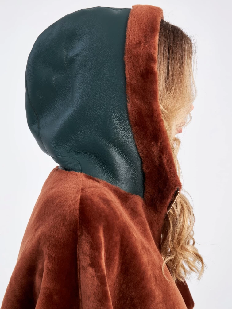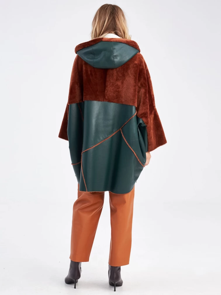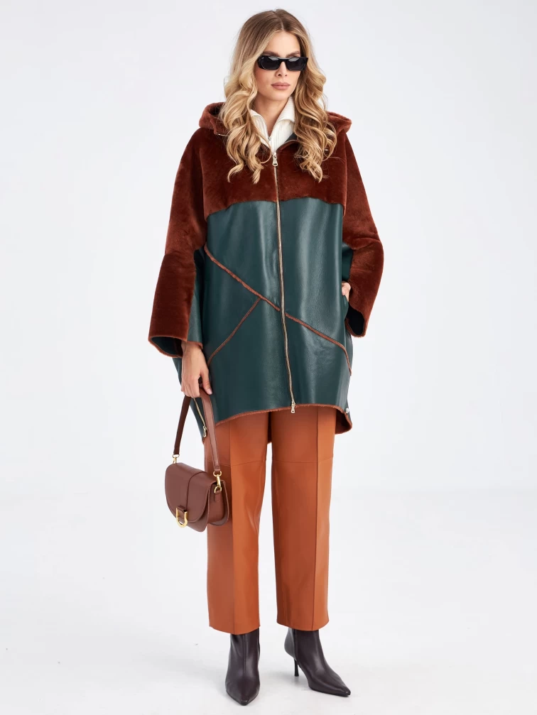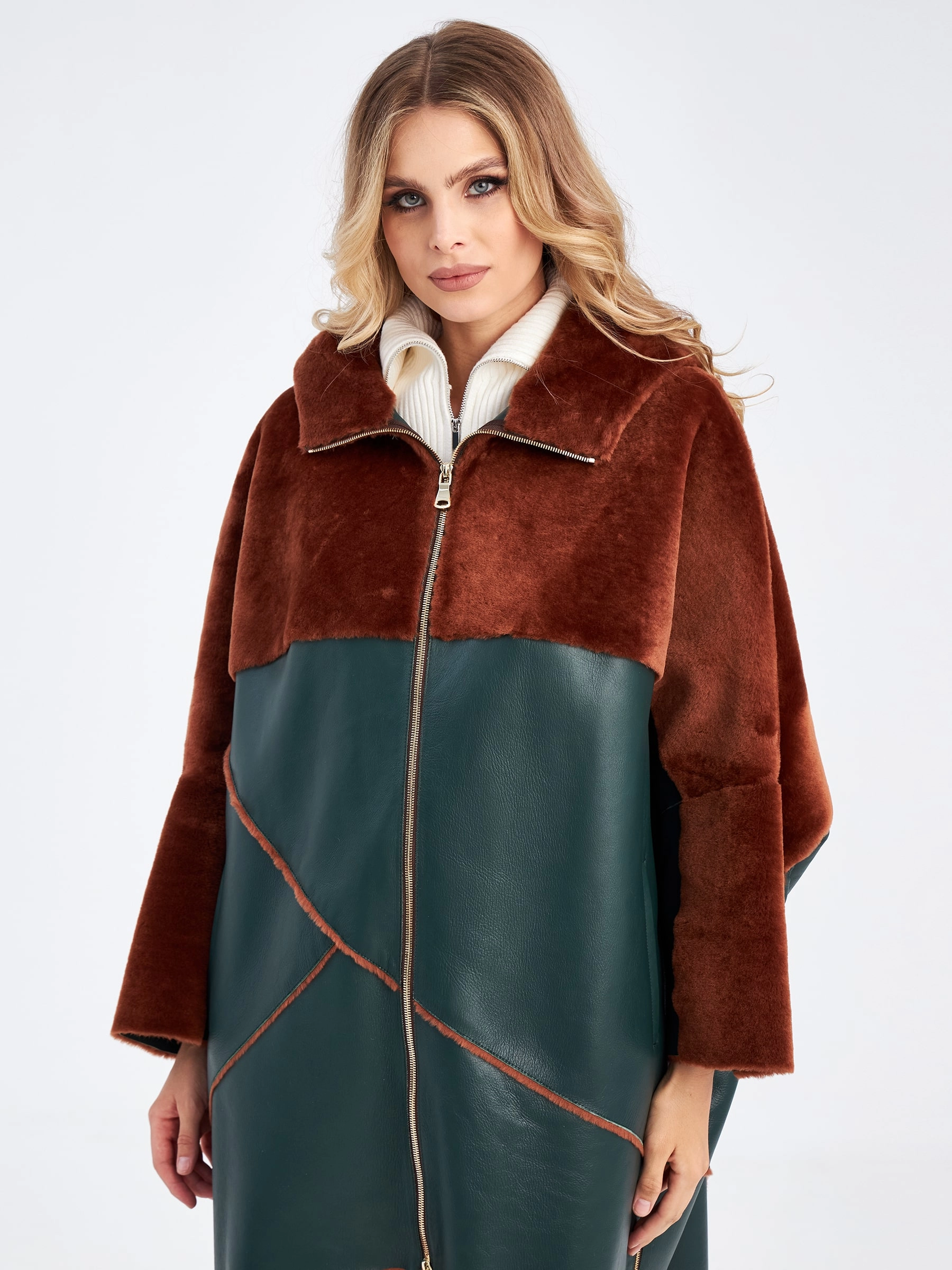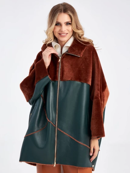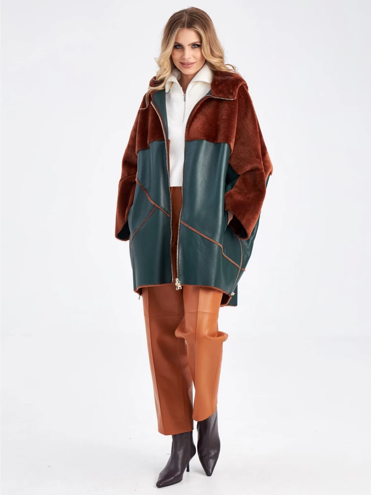 Нельзя оставить без внимания дубленку свободного кроя выполненную из нежного меха ягненка. Создавая эту модель, мастера словно поделили ее пополам используя два контрастных оттенка:коричневый и зеленый. Верхнюю часть и широкий рукав выделили мехом наружу. Для нижней - использовали плотную овчину из которой сшили модель, обработав ее так, чтобы с внешней стороны она напоминала гладкую кожу. Изделие дополнили объемным капюшоном. Застежкой боковых разрезов и самой модели послужила крупная молния в цвете золото.