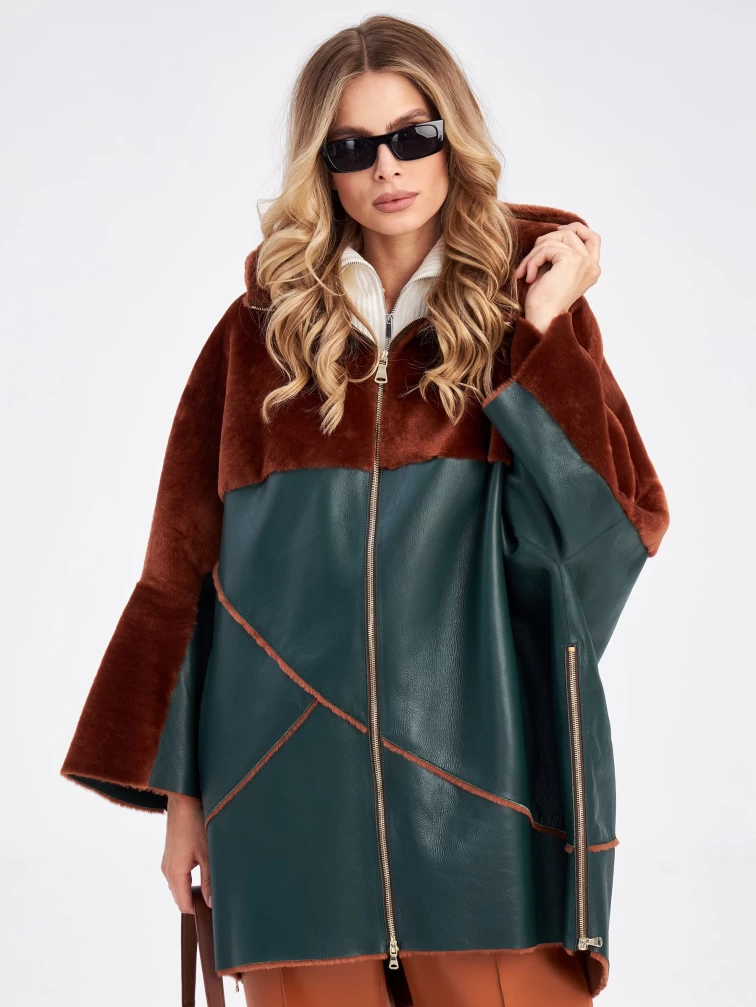 Короткая комбинированная женская дубленка с капюшоном премиум класса 2043, зеленая, размер 46, артикул 63170