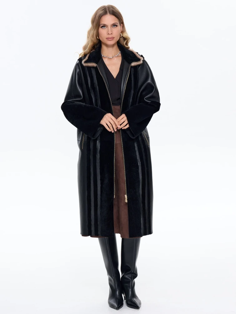 Товар женская дубленка на молнии с норковым воротником премиум класса 2040, черная, размер 46, артикул 63120 выполнен из овчина "мерино" с застежкой молния. Рассчитан на сезон: осень-зима. Длина изделия 110 см, силуэт прямой.