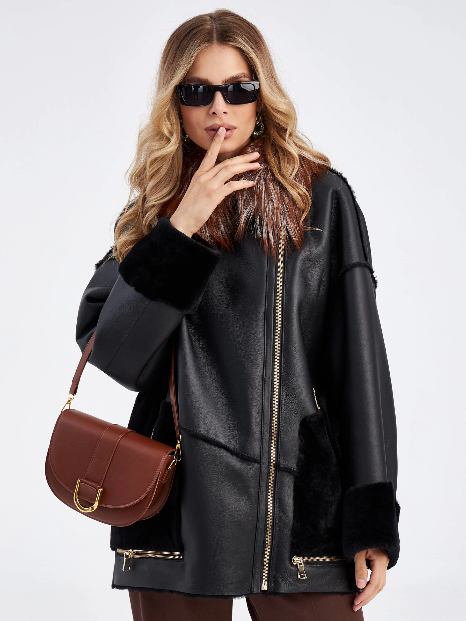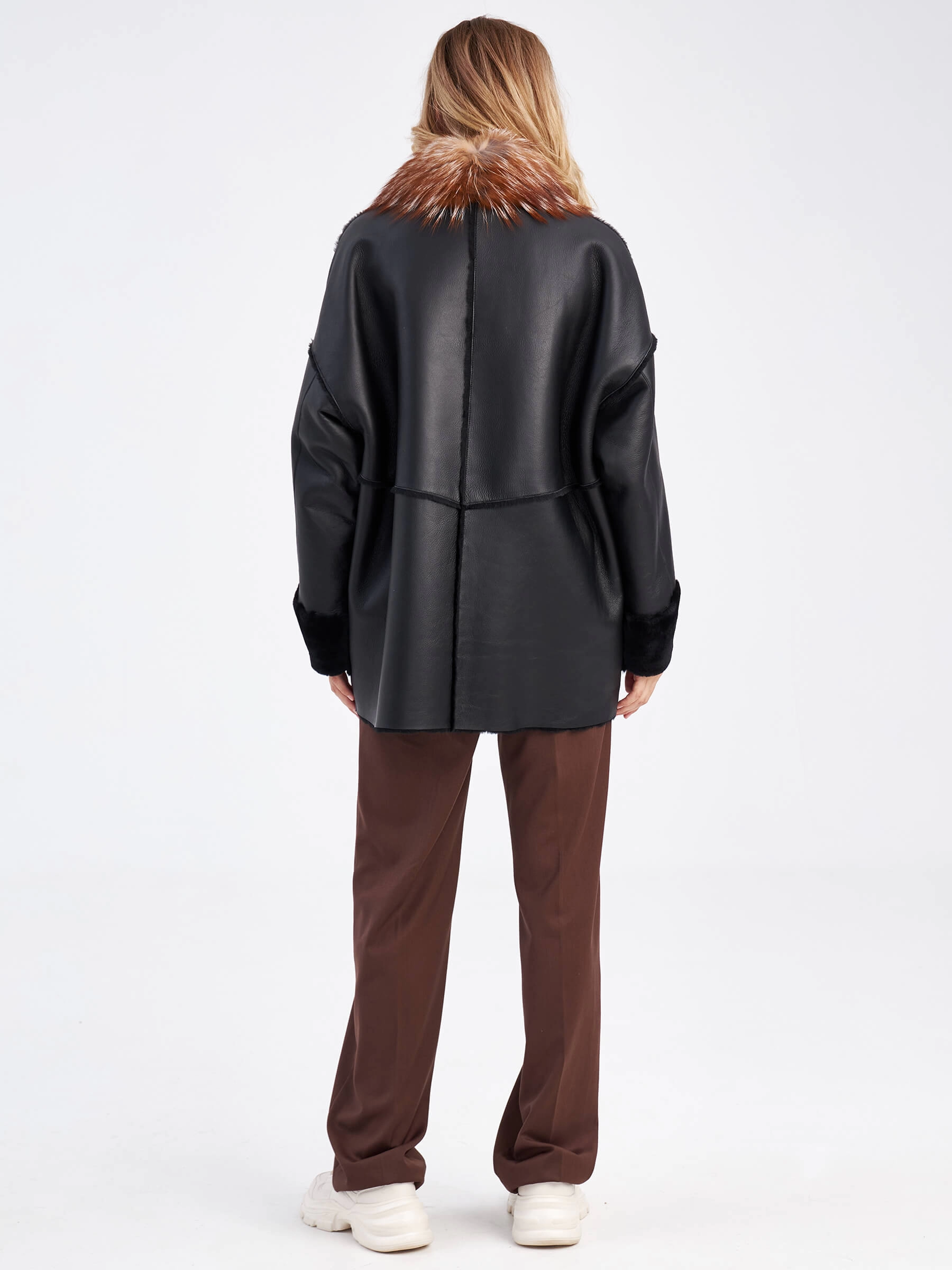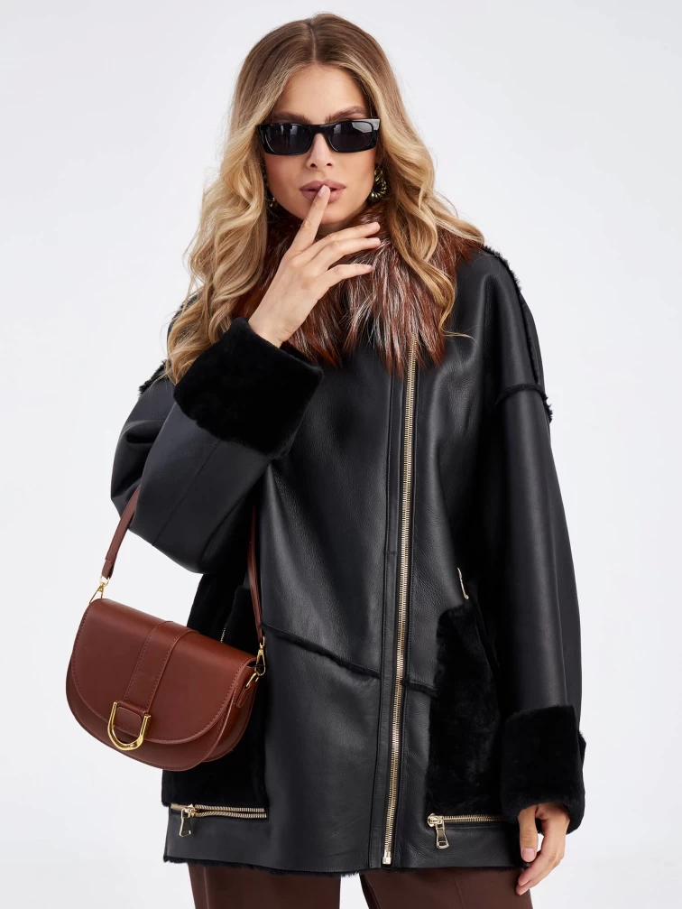 Товар короткая женская дубленка оверсайз с воротником лисицы премиум класса 2042, черная, размер 46, артикул 63160 выполнен из овчина "мерино" с застежкой кнопки. Рассчитан на сезон: осень-зима. Длина изделия 70 см, силуэт прямой.