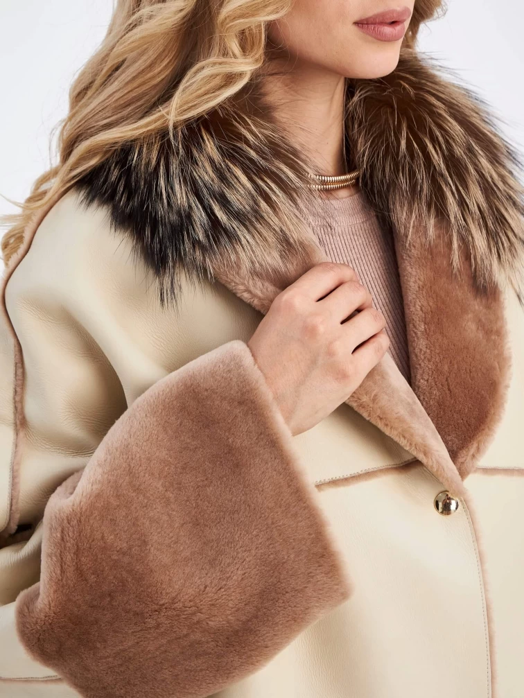 Товар стильная женская дубленка оверсайз с воротником лисицы премиум класса 2046, бежевая, размер 44, артикул 63180 выполнен из овчина "мерино" с застежкой молния. Рассчитан на сезон: осень-зима. Длина изделия 110 см, силуэт прямой.
