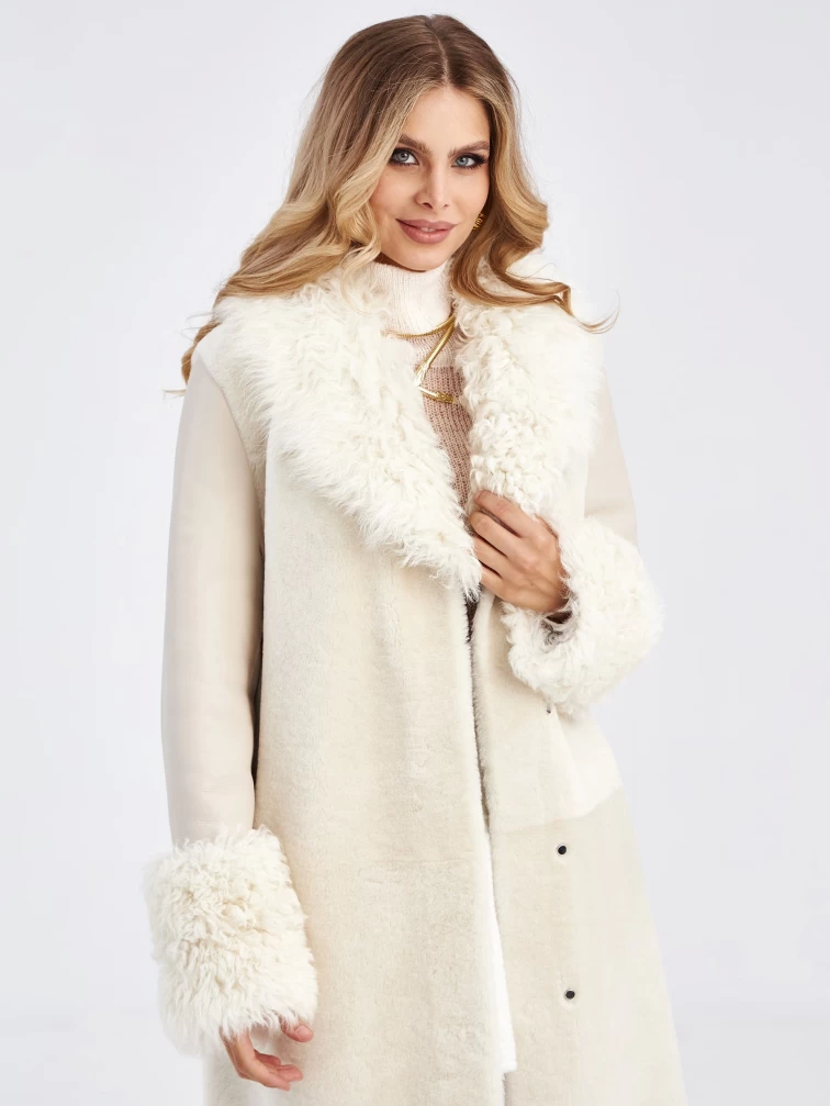 Товар модная женская дубленка с воротником тиградо премиум класса 2031, белая, размер 44, артикул 63050 выполнен из овчина "мерино" с застежкой кнопки. Рассчитан на сезон: осень-зима. Длина изделия 120 см, силуэт прямой.