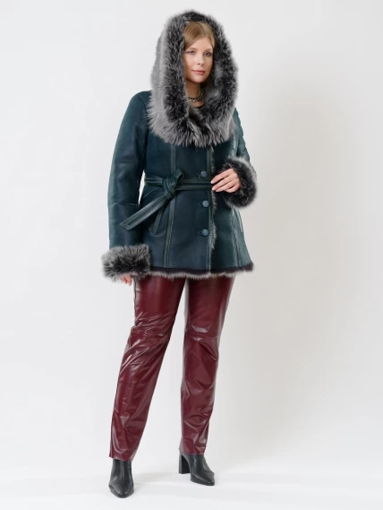 Короткая женская дубленка из тосканы с капюшоном 122, синяя, размер 44, артикул 62040