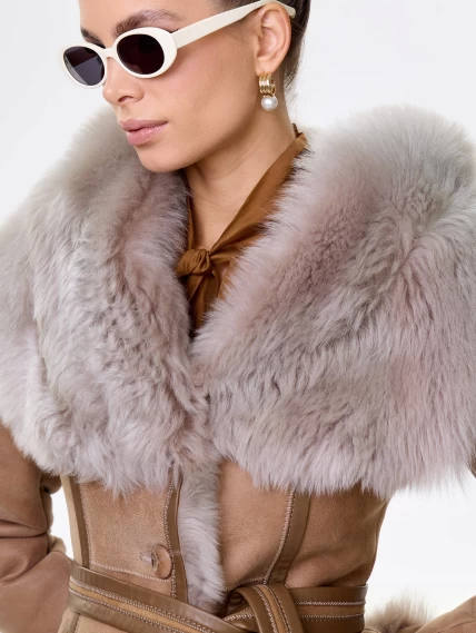 Идеальная полуприлегающая модель премиум-класса: невероятно густой мех тосканской овчины согреет в лютый мороз, а глубокий капюшон-трансформер эффектно завернёт вас в уют или элегантно ляжет шалью на плечи. Защитное покрытие убережёт от царапин, кожаная отделка карманов и борта добавит статусности, а регулируемые манжеты и боковые карманы обеспечат комфорт. Идеальная посадка по фигуре, продуманные швы и длинный пояс подчеркнут силуэт — сочетайте с джинсами, объёмными свитерами или тёмными платьями для дерзкого зимнего образа! Преимущество: короткая длина, полуприлегающий крой - это мобильность для города и элегантность для вечера.
