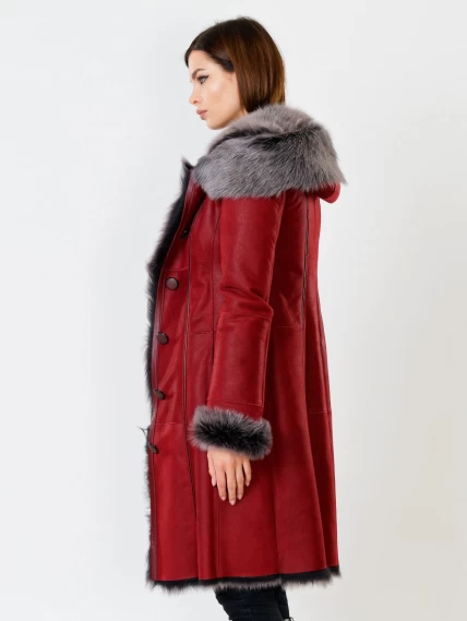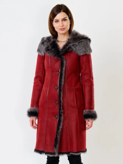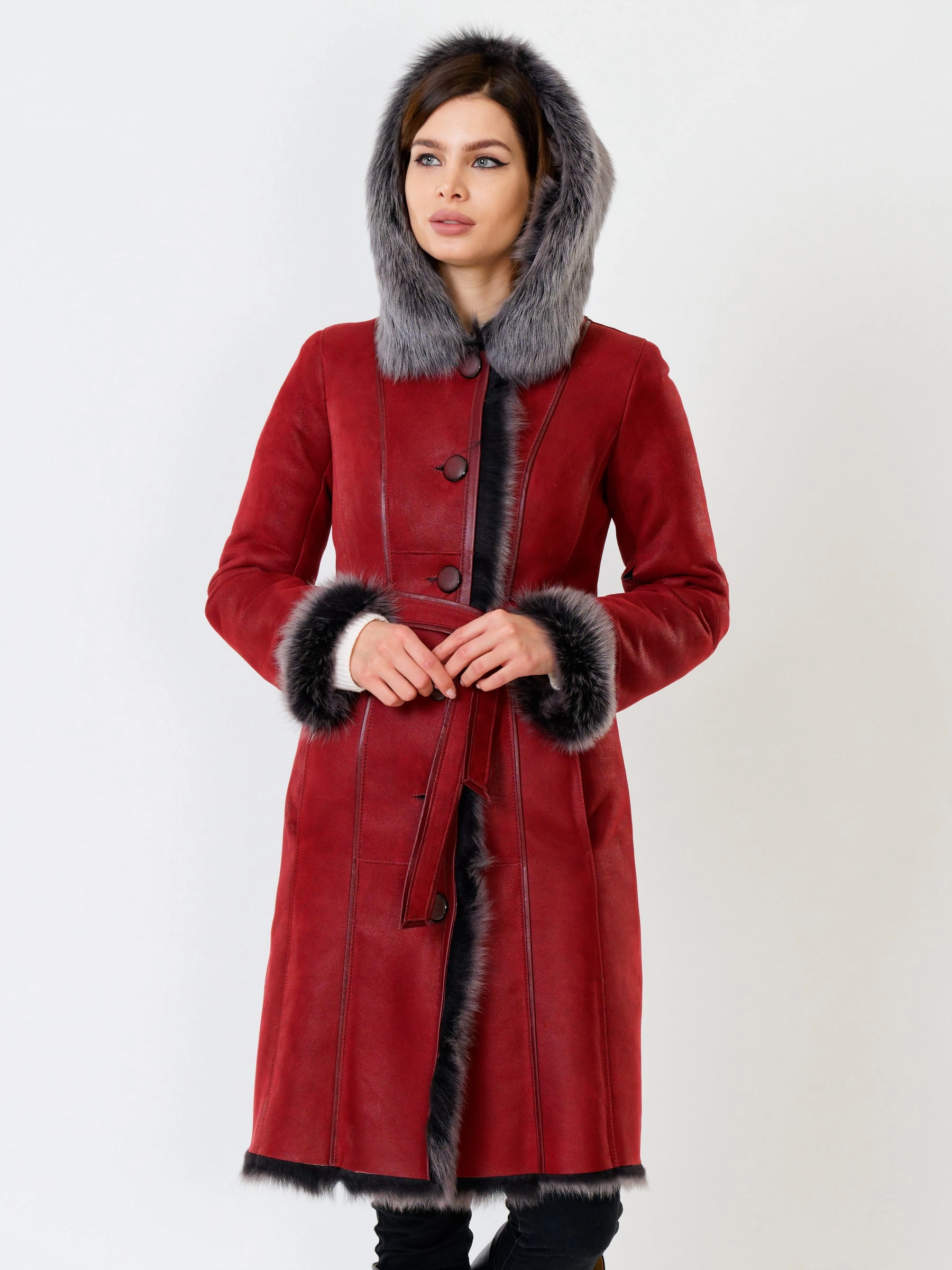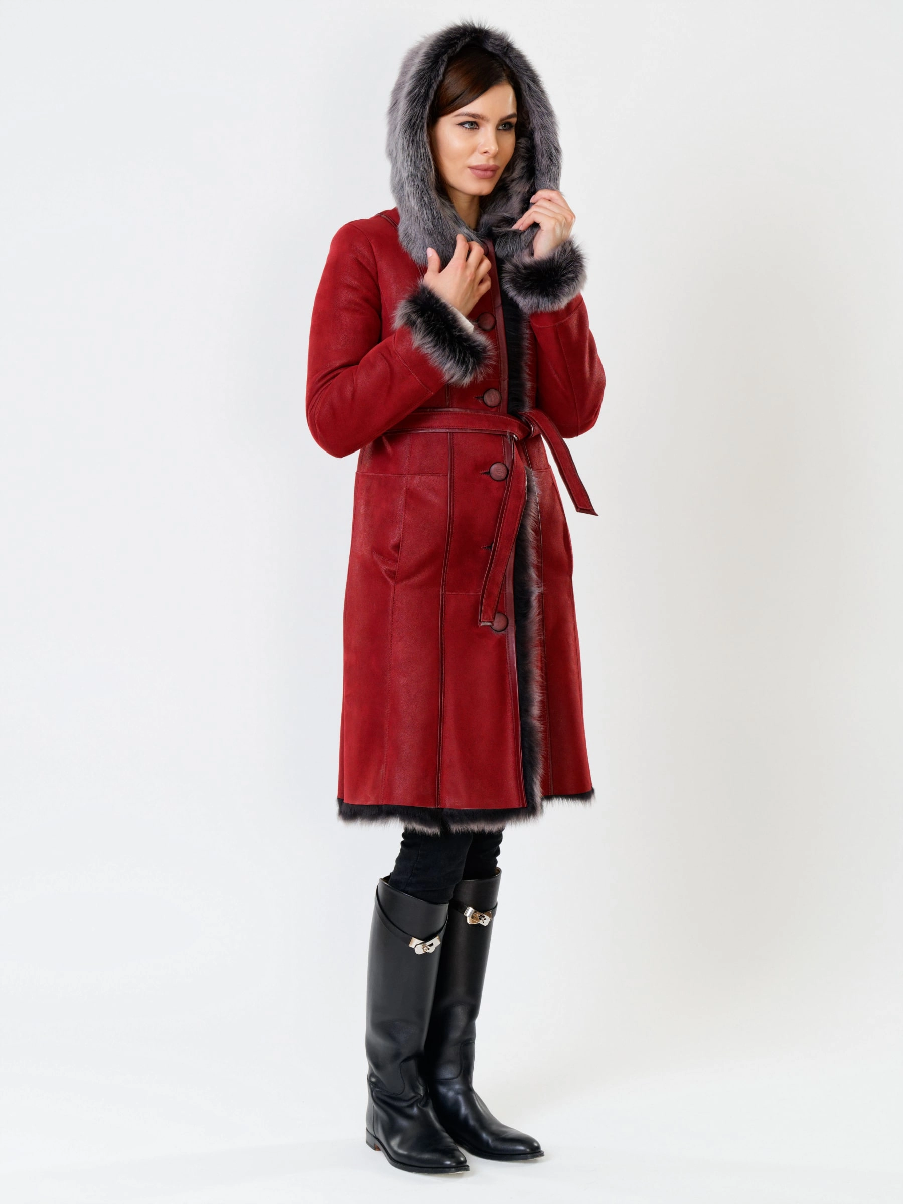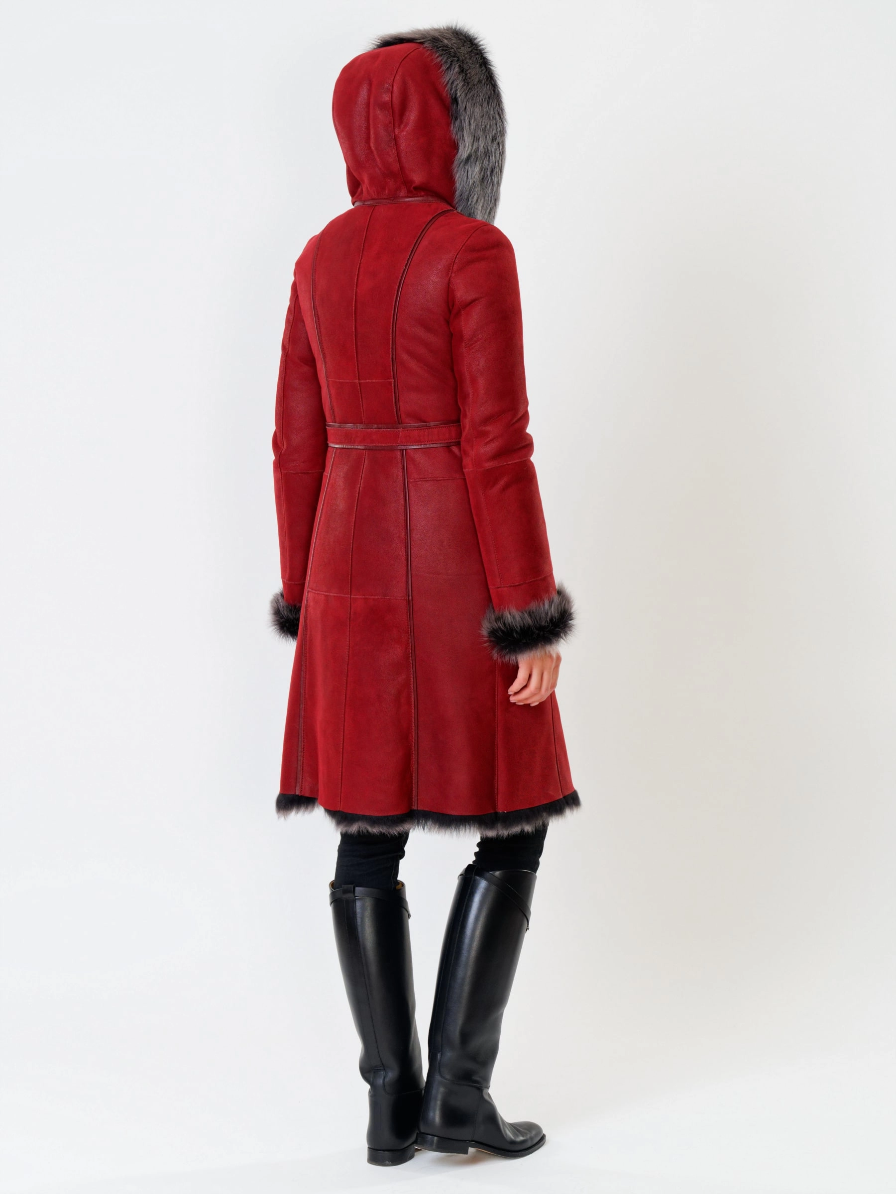 Длинная женская дубленка из тосканы с капюшоном 123нк, красная, размер 52, артикул 61911