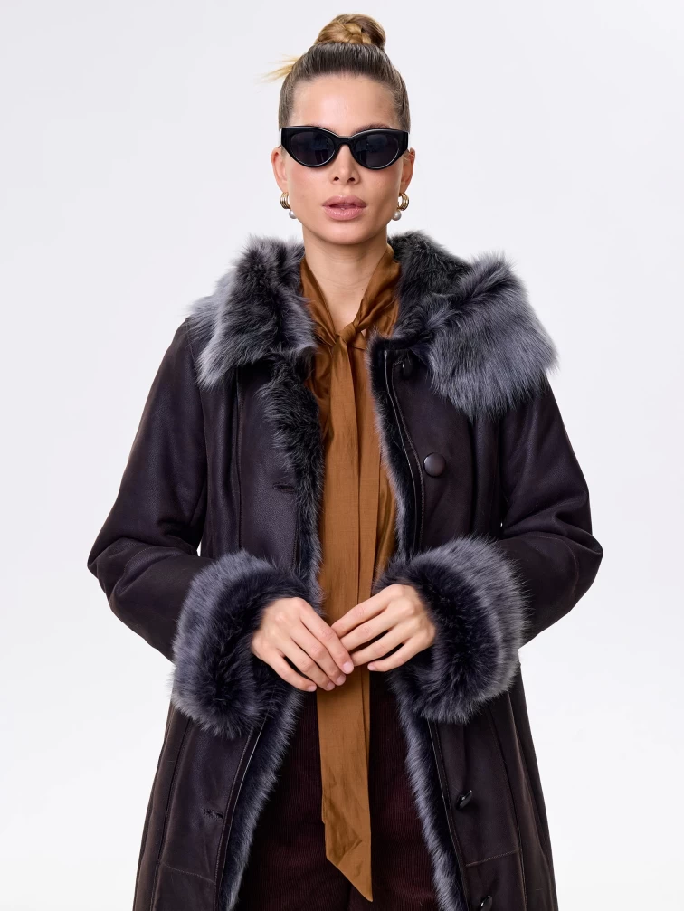 Длинная дублёнка с капюшоном из тосканской овчины. Роскошная полуприлегающая модель премиум-класса: густой нежнейший мех глубокого оттенк подарит королевское тепло даже в лютый мороз, а объёмный капюшон создаст уютный кокон от непогоды или элегантно ниспадет на плечи. Защитное покрытие убережёт от царапин, а идеальная посадка по фигуре, боковые карманы и длинный пояс подчеркнут силуэт — сочетайте с чёрными джинсами, вязаными платьями или кожаными брюками для безупречного зимнего образа! Преимущество: короткая длина, полуприлегающий крой - это мобильность для города и элегантность для вечера.
