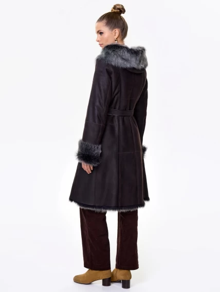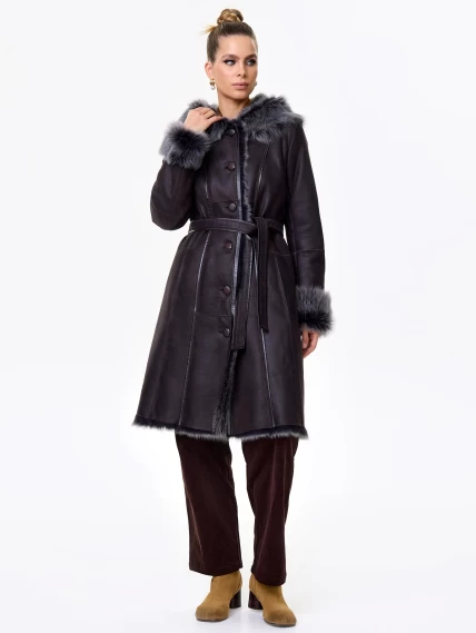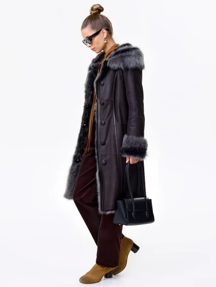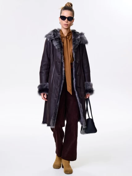 Длинная женская дубленка из тосканы с капюшоном 123нк, коричневая, размер 56, артикул 61483