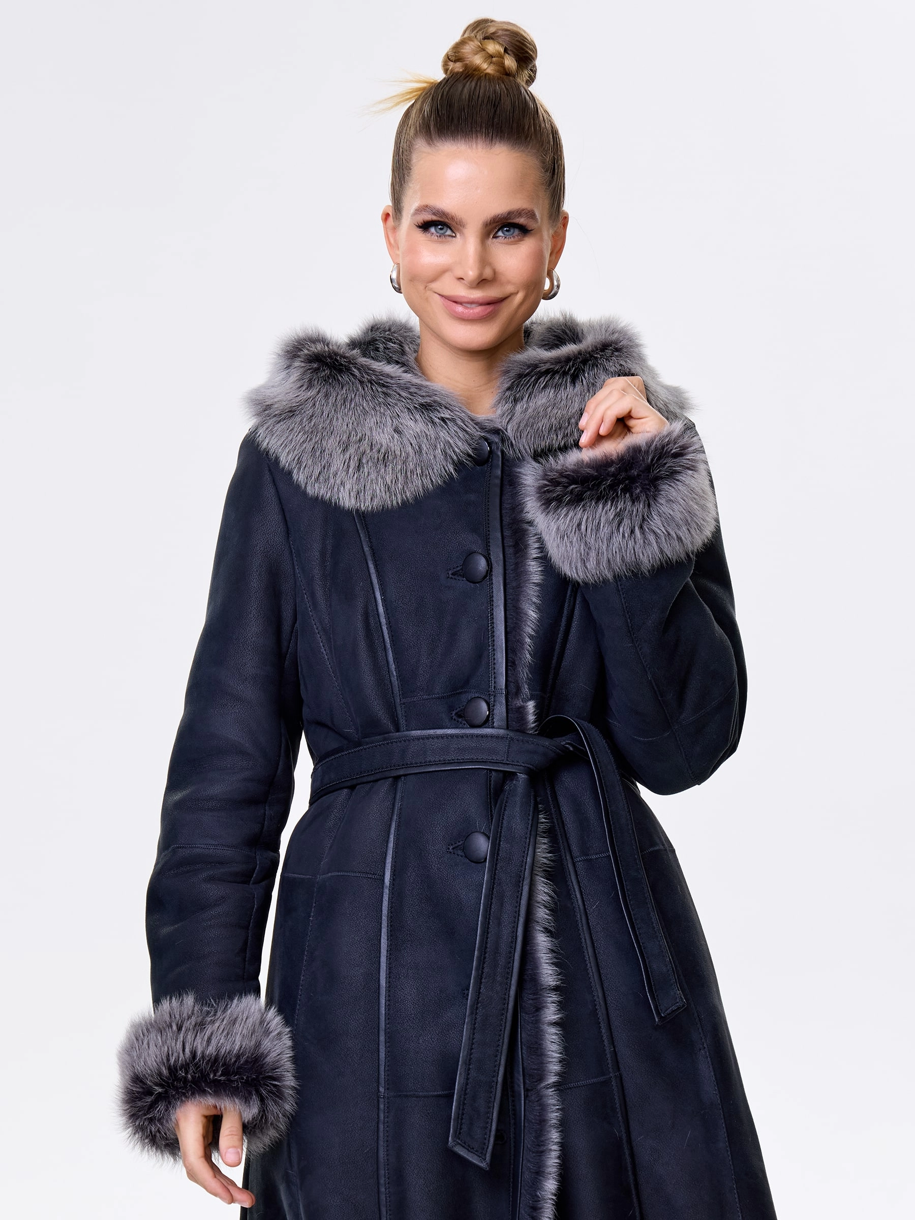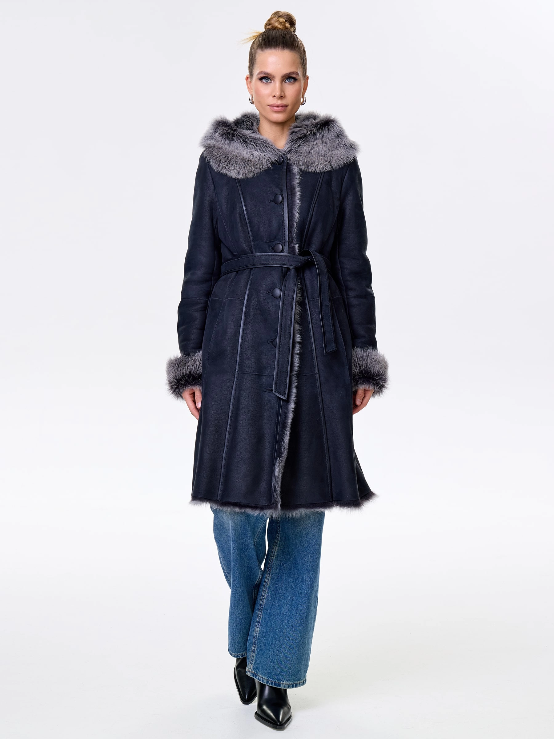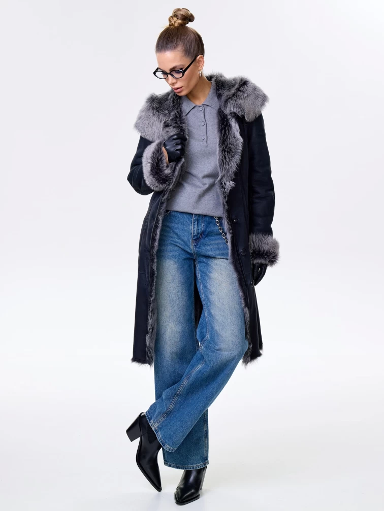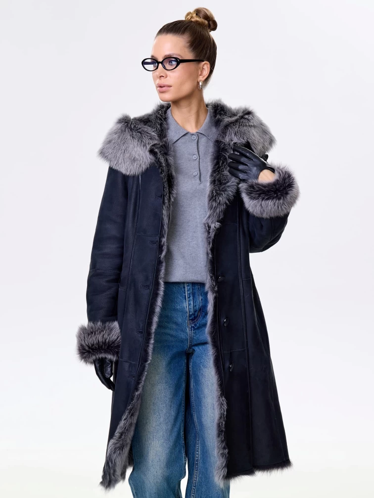 Длинная дублёнка с капюшоном из тосканской овчины. Роскошная полуприлегающая модель премиум-класса: густой нежнейший мех глубокого оттенк подарит королевское тепло даже в лютый мороз, а объёмный капюшон создаст уютный кокон от непогоды или элегантно ниспадет на плечи. Защитное покрытие убережёт от царапин, а идеальная посадка по фигуре, боковые карманы и длинный пояс подчеркнут силуэт — сочетайте с чёрными джинсами, вязаными платьями или кожаными брюками для безупречного зимнего образа! Преимущество: короткая длина, полуприлегающий крой - это мобильность для города и элегантность для вечера.