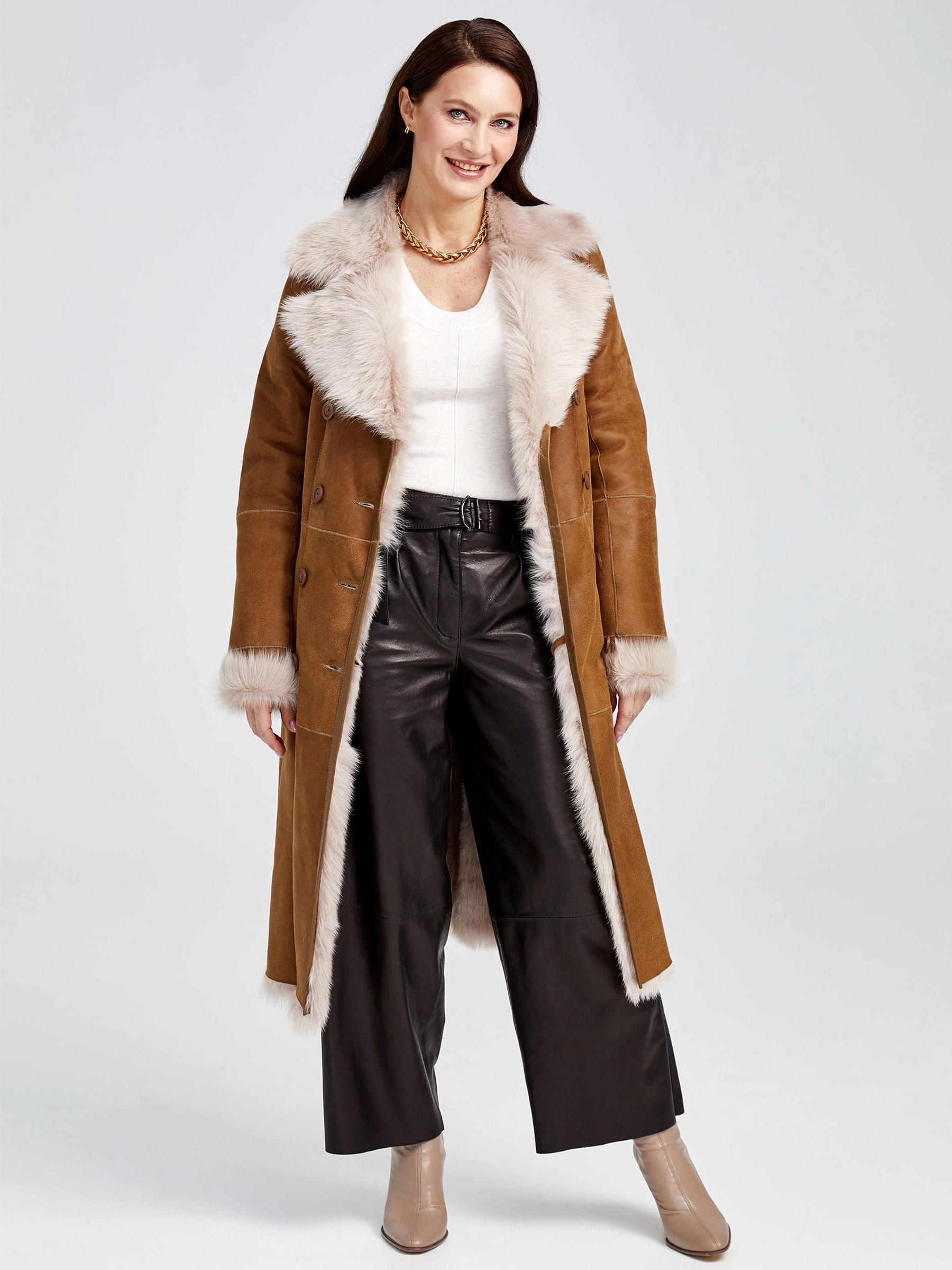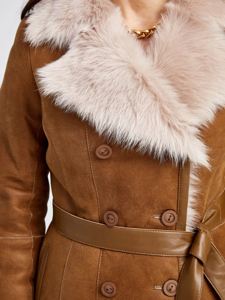 Согревающая классика премиум-класса: нежнейшая бежевая овчина «тосканы» в полуприлегающем силуэте дарит элегантное тепло, а двубортная застёжка на пуговицах и английский воротник создают вневременной образ. Длинный пояс мягко подчеркнёт талию, сохраняя комфорт — сочетайте с вязаными платьями, кожаными брюками или джинсами для безупречного зимнего стиля!