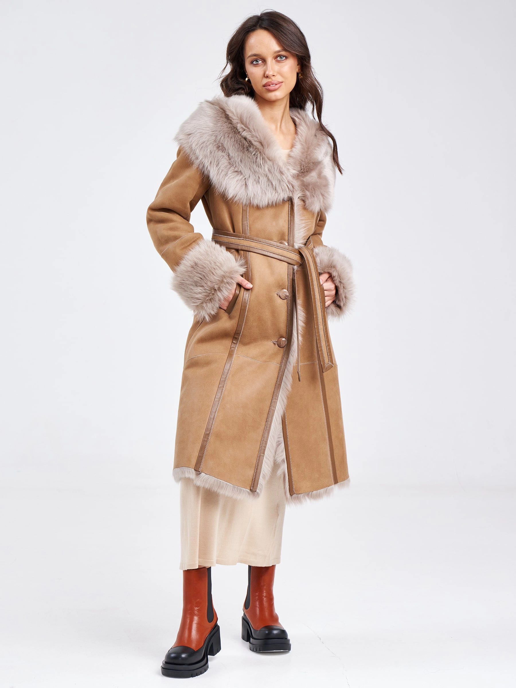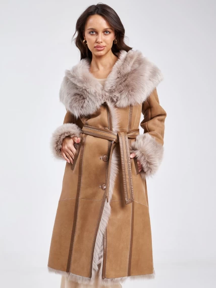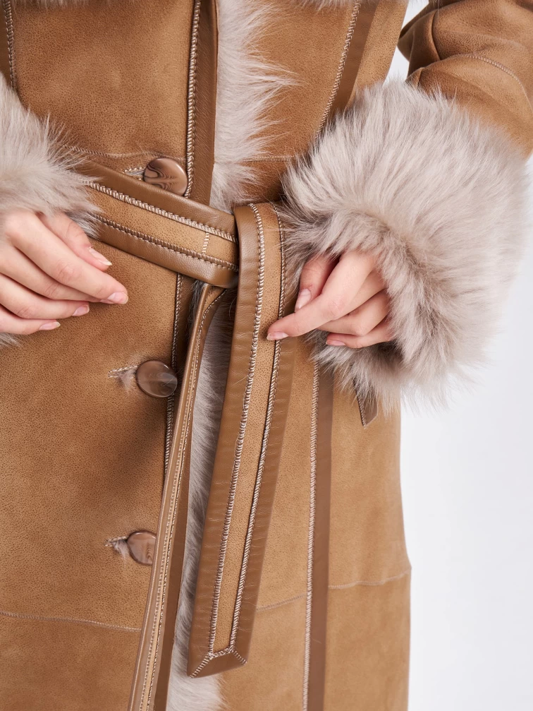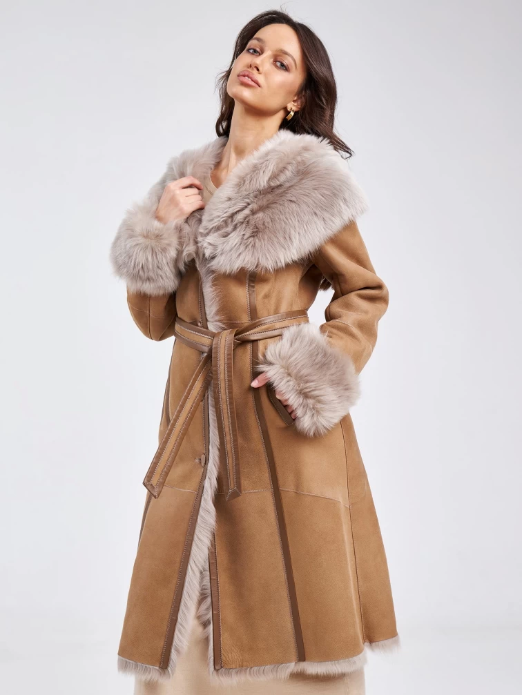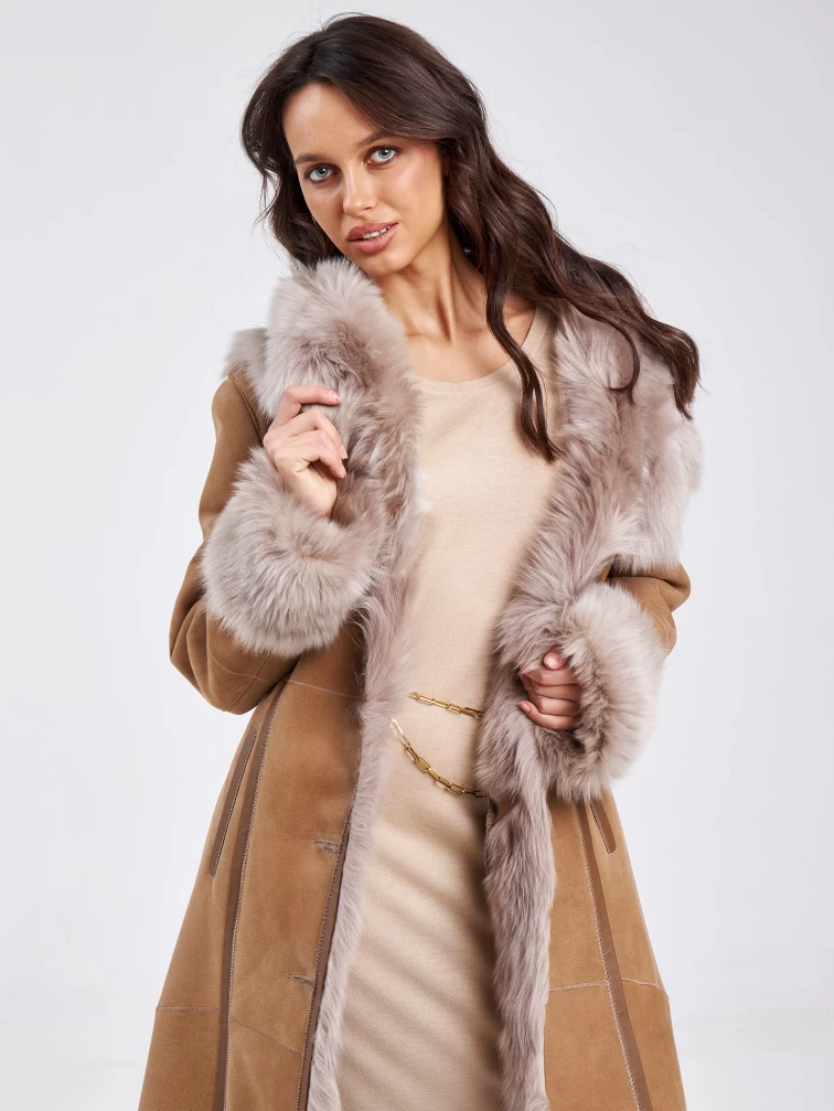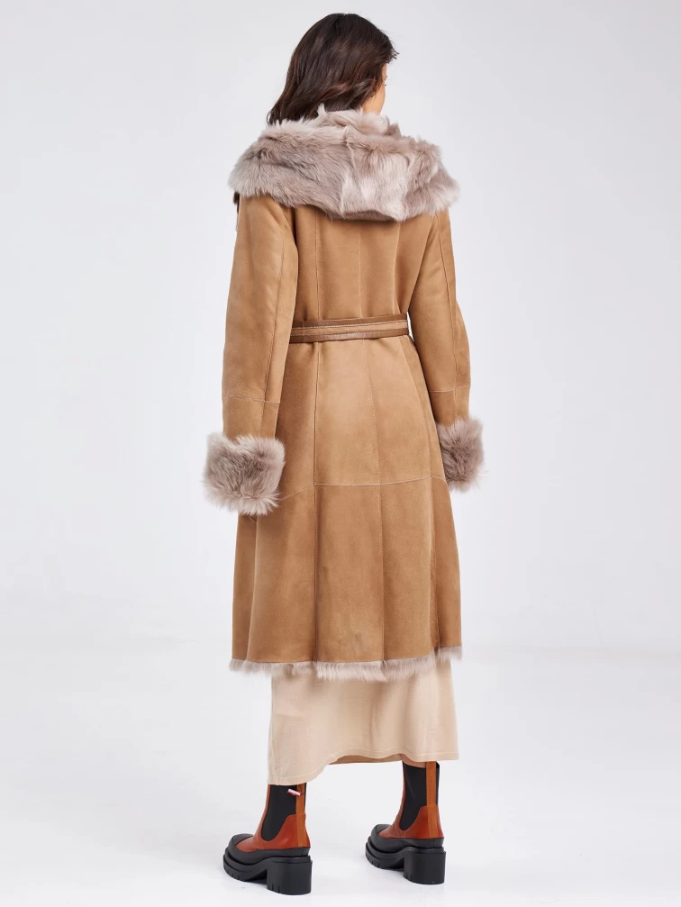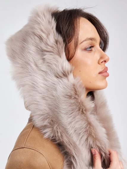 Длинная дубленка из тосканы с капюшоном для женщин 132, бежевая, размер 44, артикул 62860