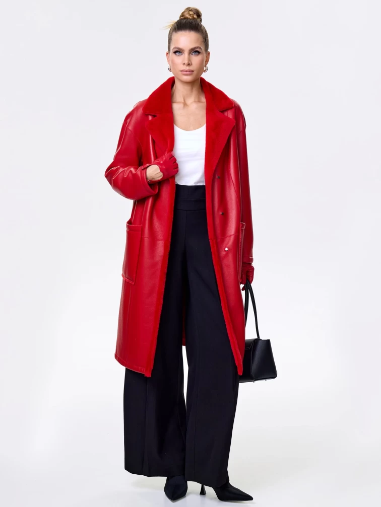 Товар длинная женская дубленка оверсайз премиум класса 2002, красная, размер 46, артикул 62441 выполнен из овчина "мерино" с застежкой кнопки. Рассчитан на сезон: осень-зима. Длина изделия 105 см, силуэт прямой.