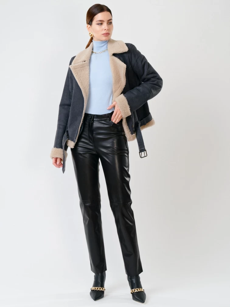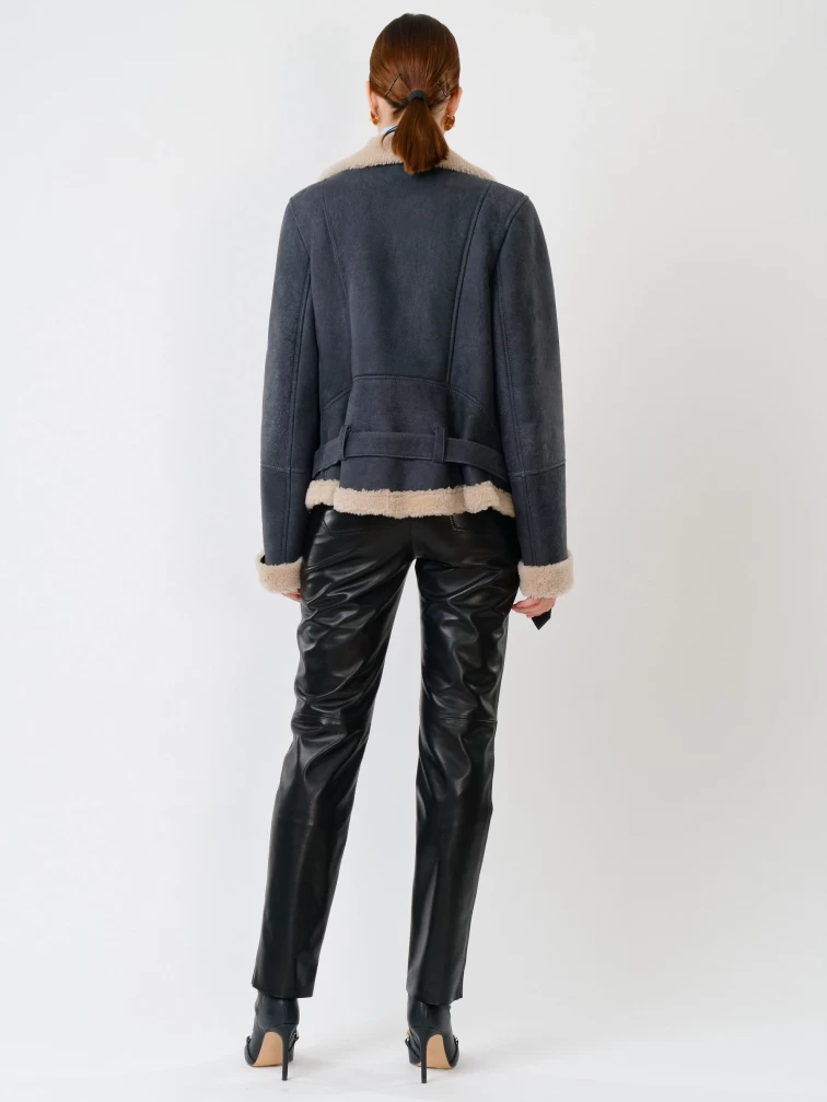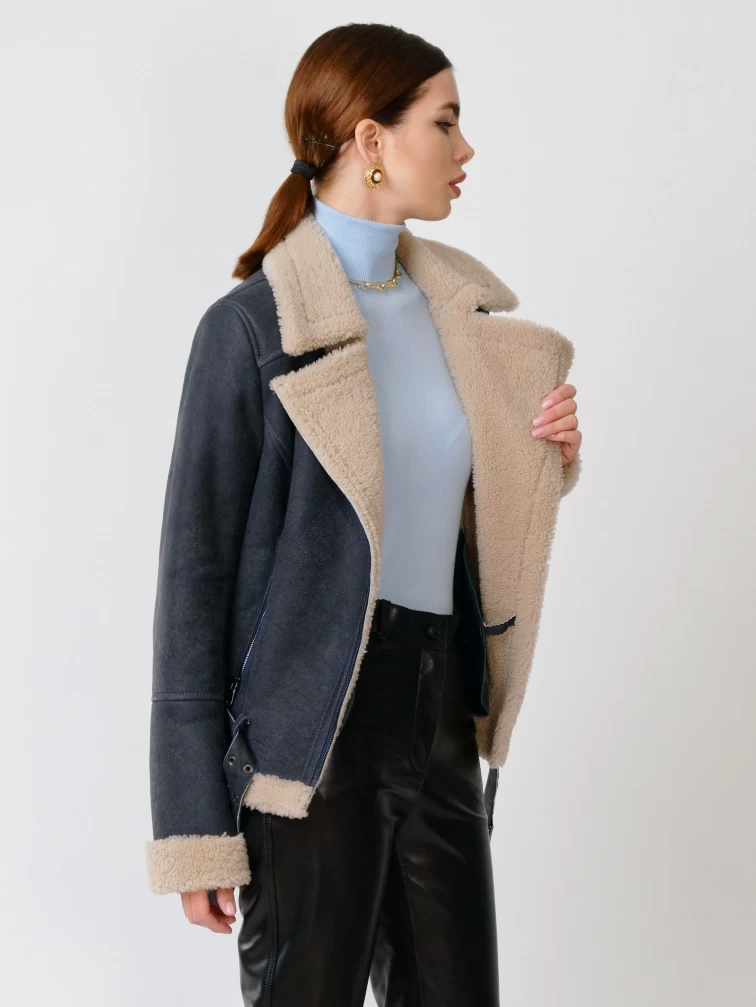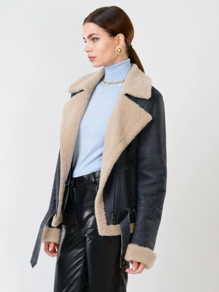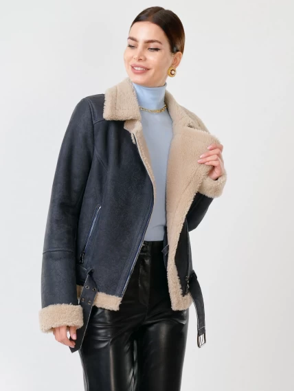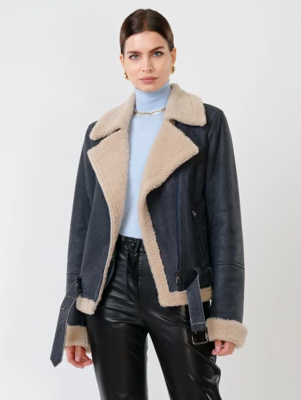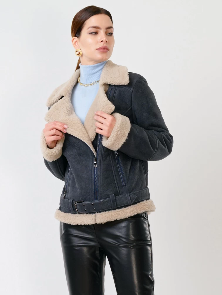 Короткая женская дубленка косуха из керли 201, синяя, размер 44, артикул 61711