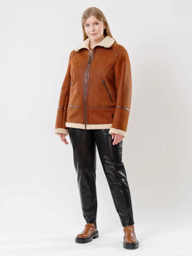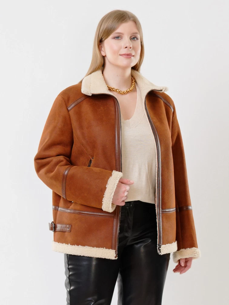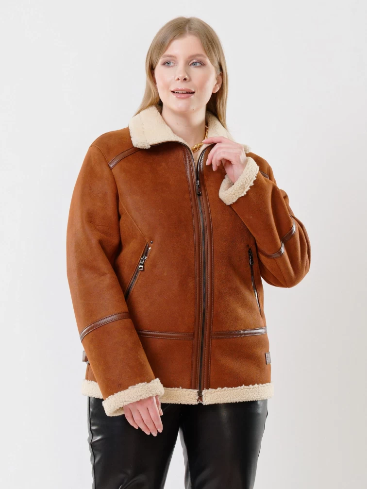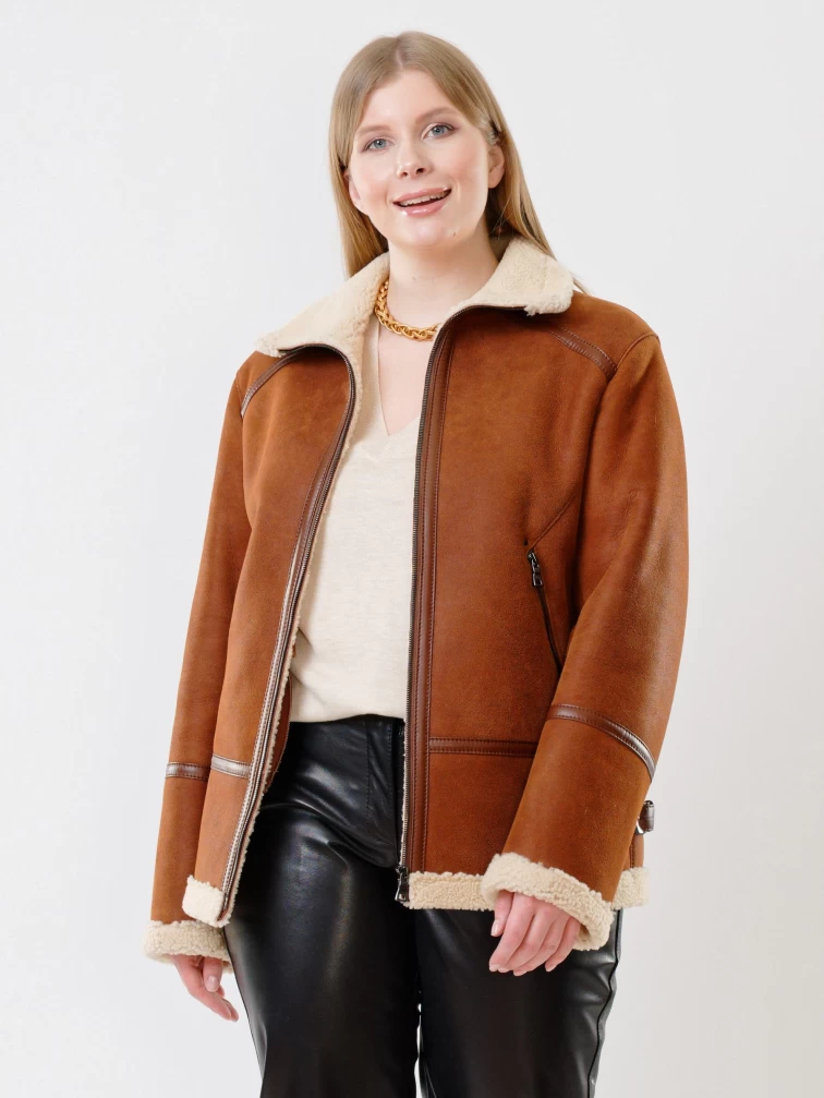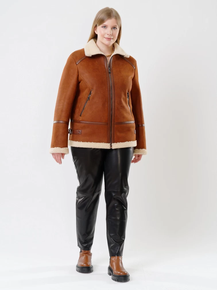 Товар короткая женская дубленка авиатор из керли 204, табачно-рыжая, размер 48, артикул 62151 выполнен из овчина "керли" с застежкой молния. Рассчитан на сезон: осень-зима. Длина изделия 66 см, силуэт свободный.