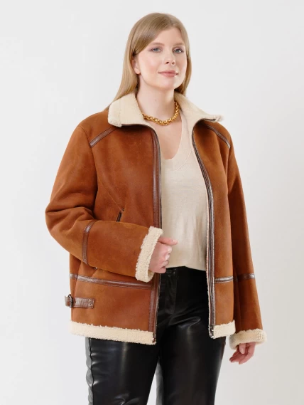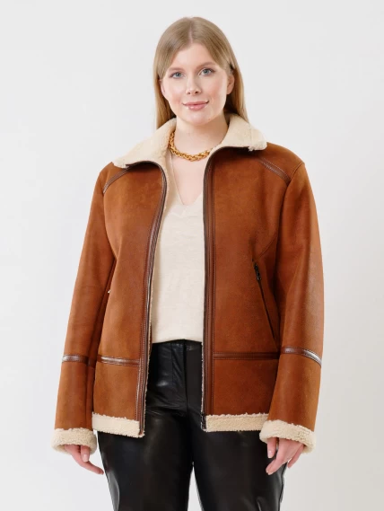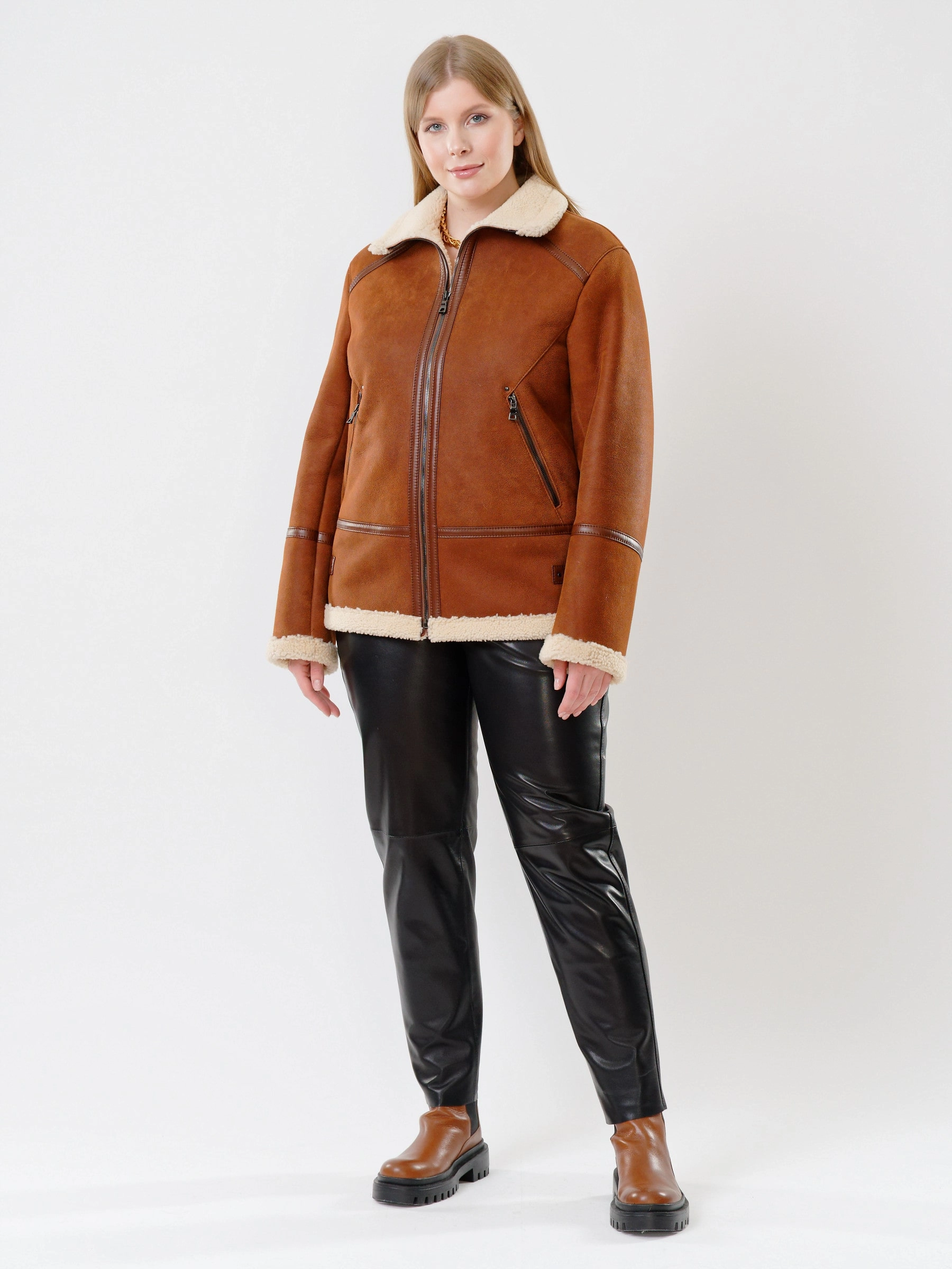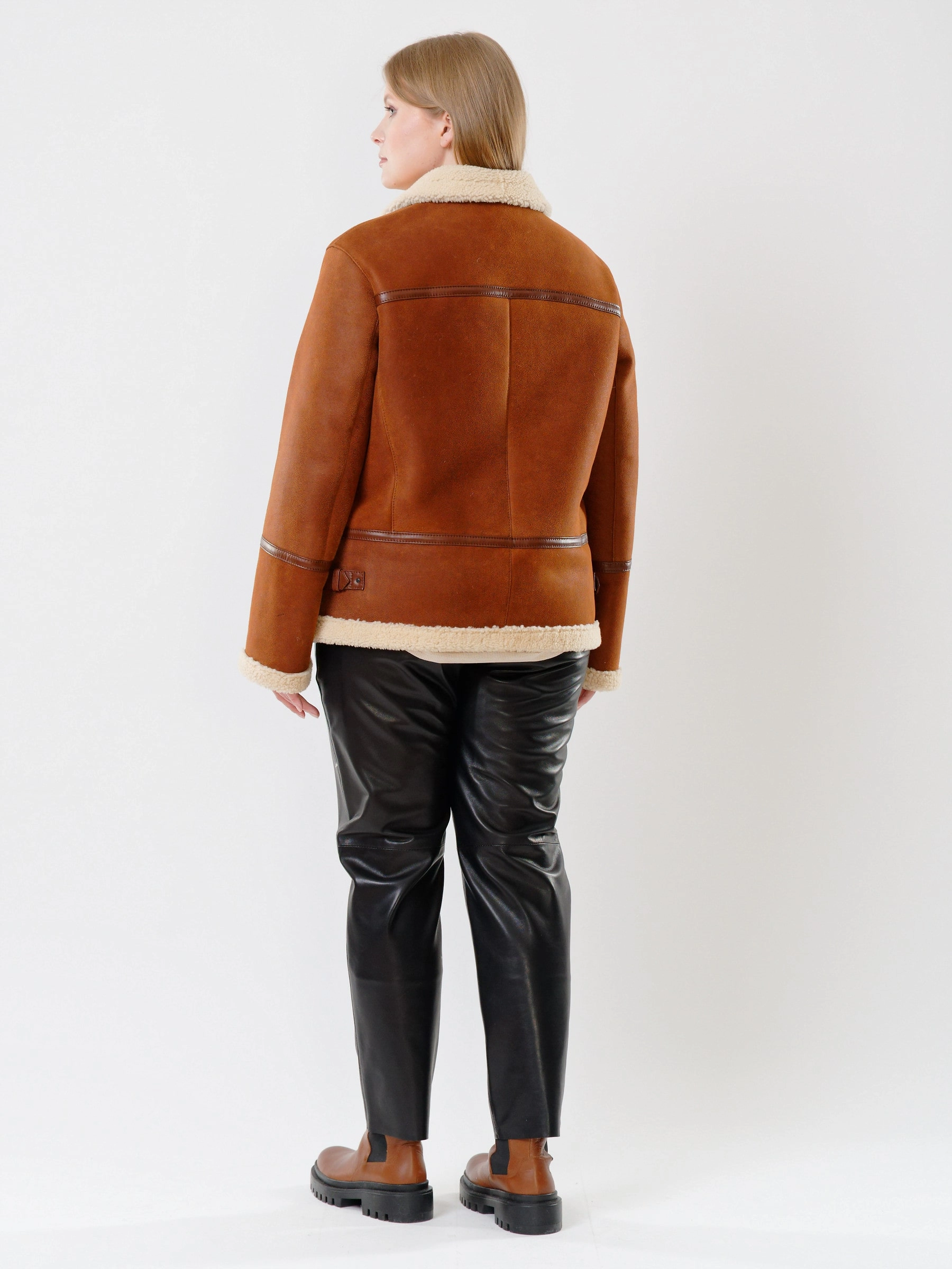 Короткая женская дубленка авиатор из керли 204, табачно-рыжая, размер 48, артикул 62151