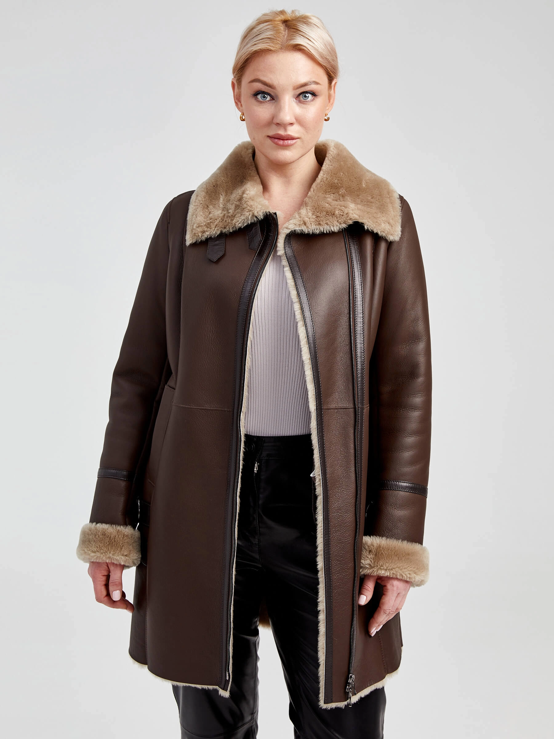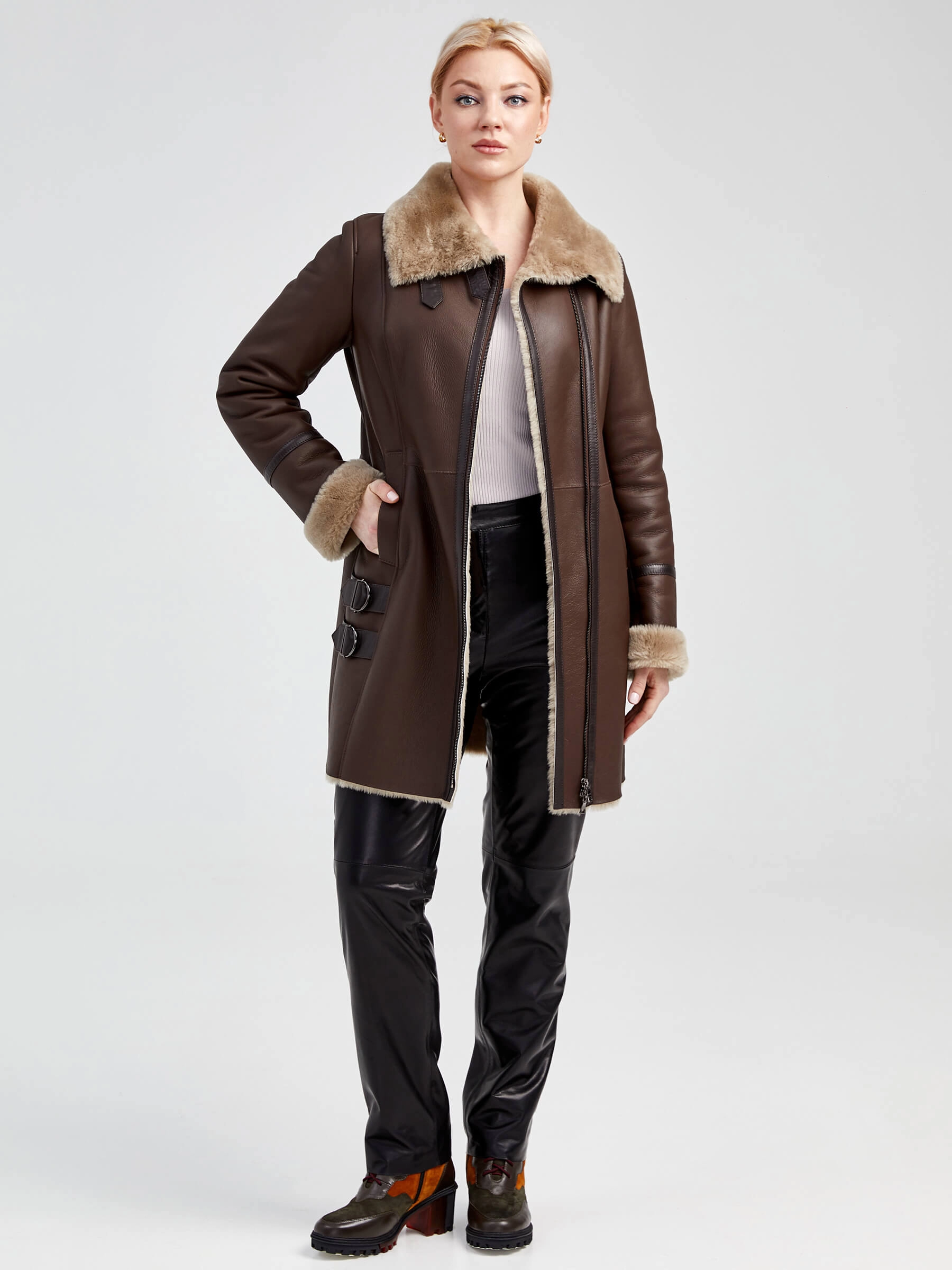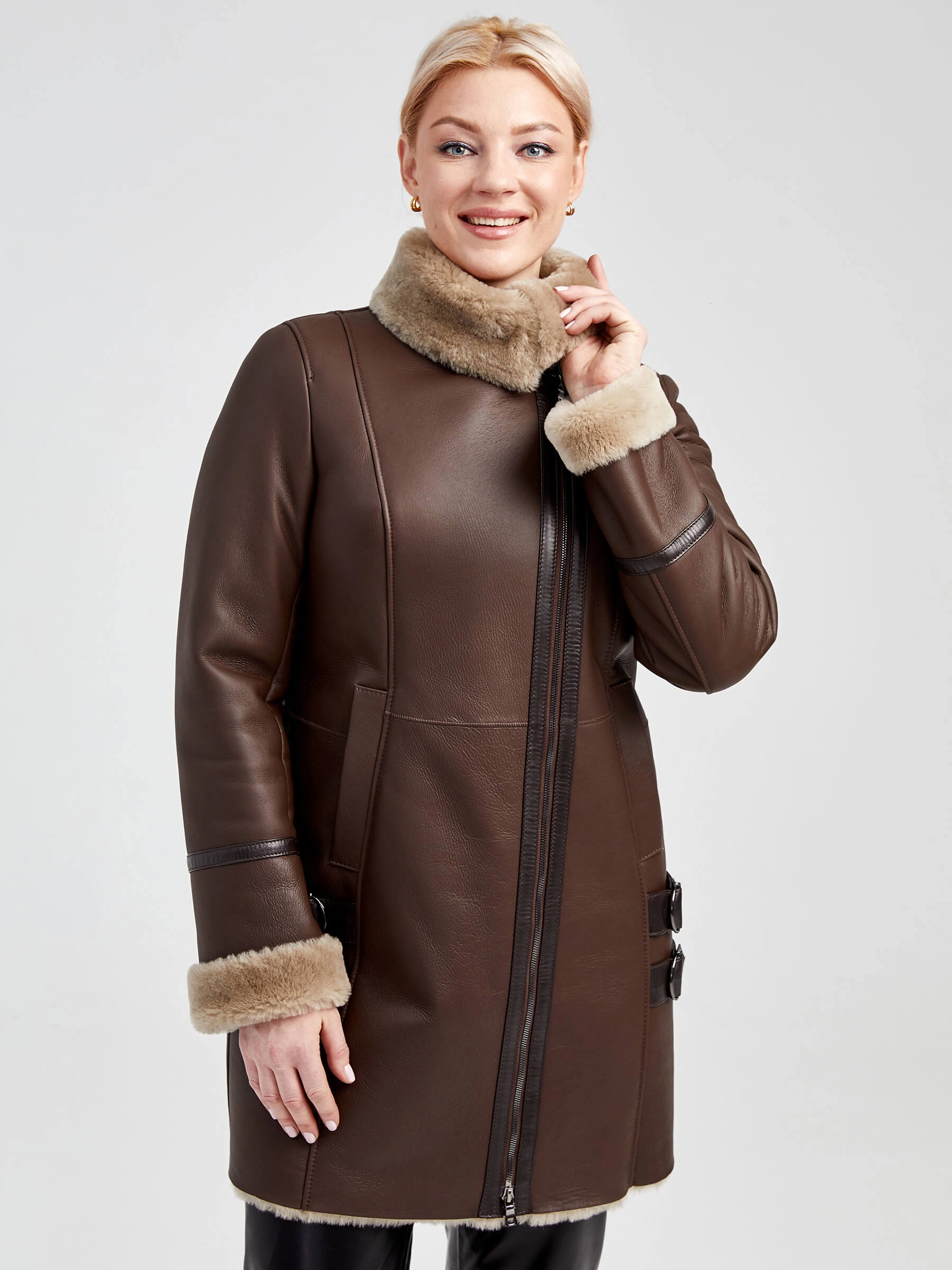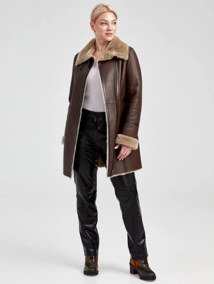 Товар дубленка косуха женская 206, коричневая, размер 48, артикул 62501 выполнен из овчина "мерино" с застежкой молния. Рассчитан на сезон: осень-зима. Длина изделия 85 см, силуэт полуприлегающий.