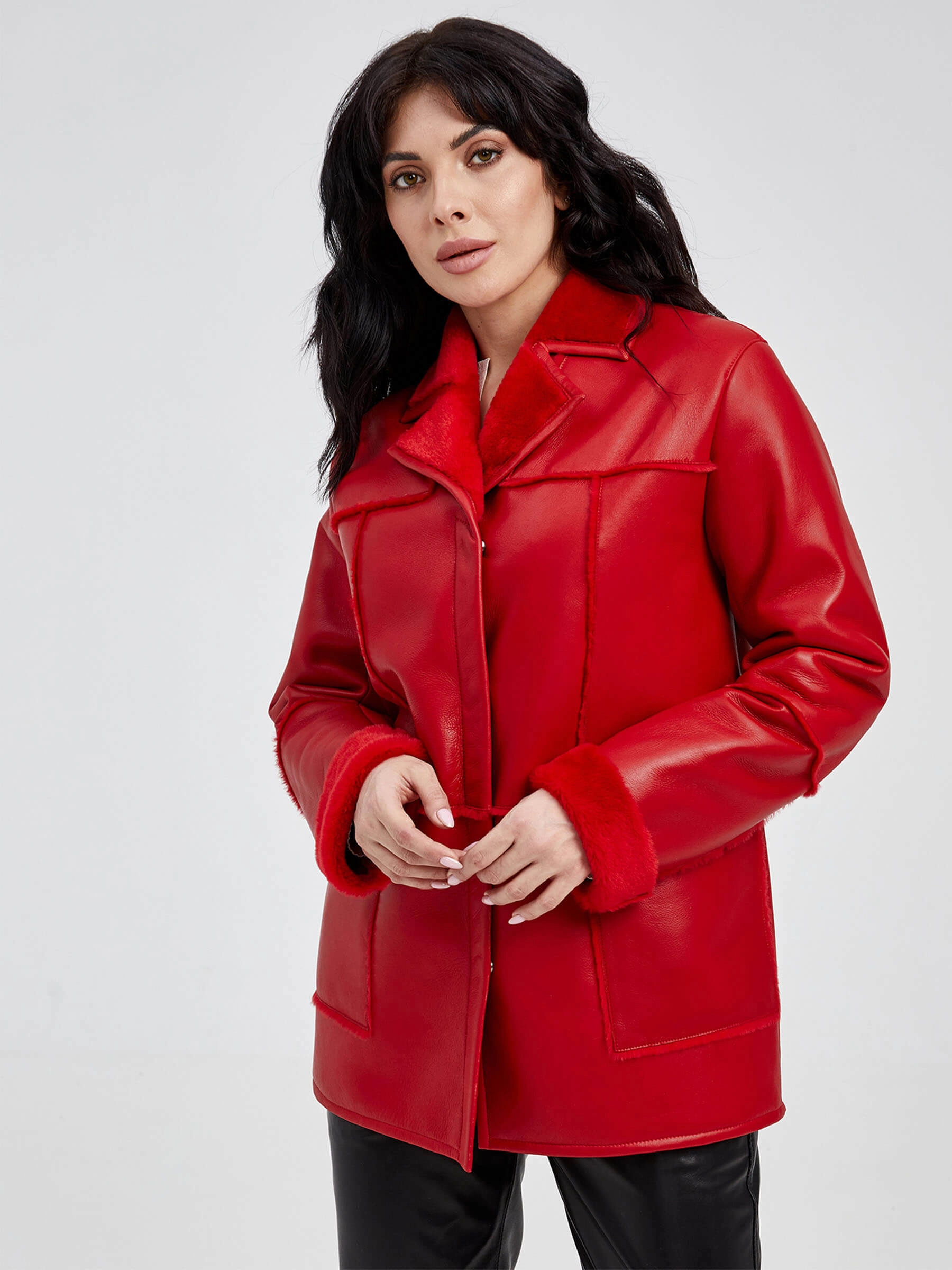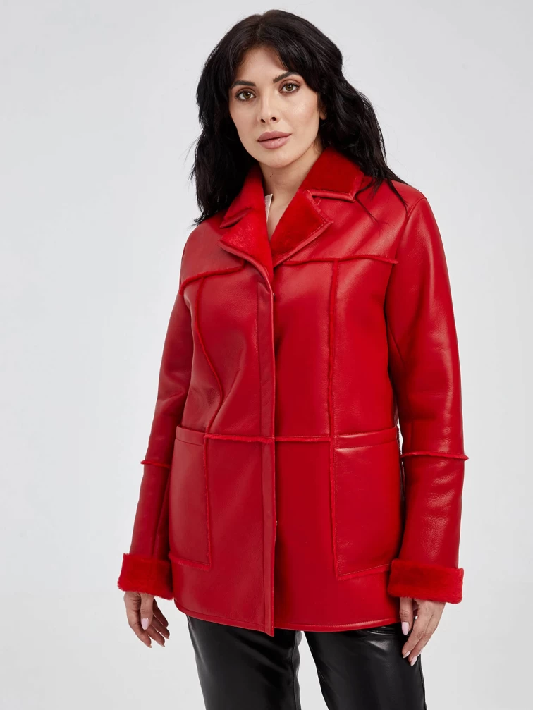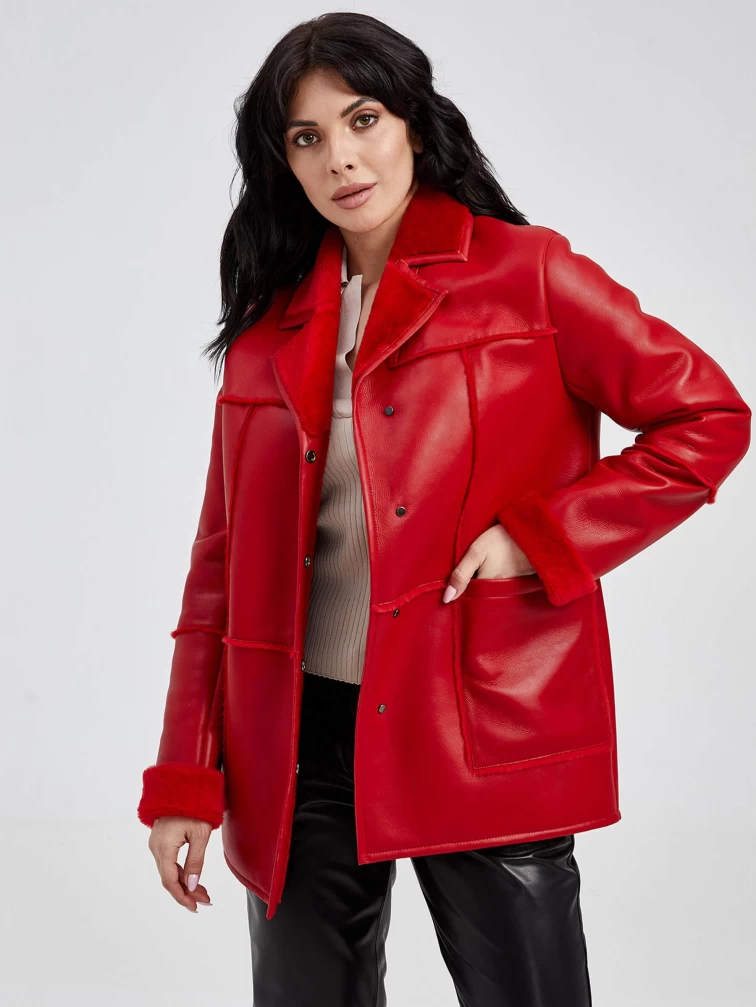 Короткая женская дубленка длиной 75 см на кнопках из натуральной овчины «мерино» насыщенного красного цвета. Прямой силуэт дополнен стильным поясом и классическим английским воротником. Модель с втачными рукавами выполнена из качественной овчины мерино, известной своей способностью поддерживать комфортную температуру и защищать от ветра. Стилисты рекомендуют носить эту дубленку с базовыми вещами: черными брюками строгого кроя и водолазкой для лаконичного образа или с джинсами-скинни и бежевым свитером для повседневного выхода, позволяя красному цвету стать главным акцентом.