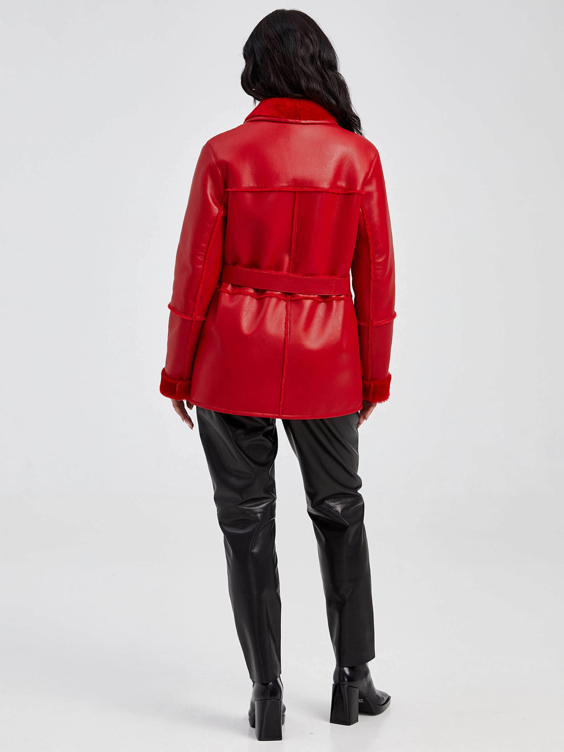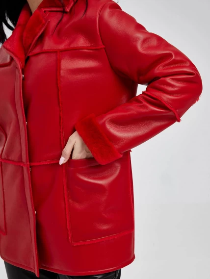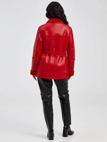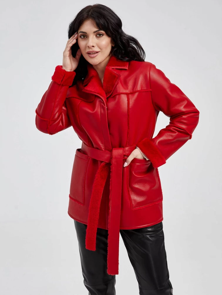 Женская короткая дубленка с поясом премиум класса 207, красная, размер 48, артикул 62520