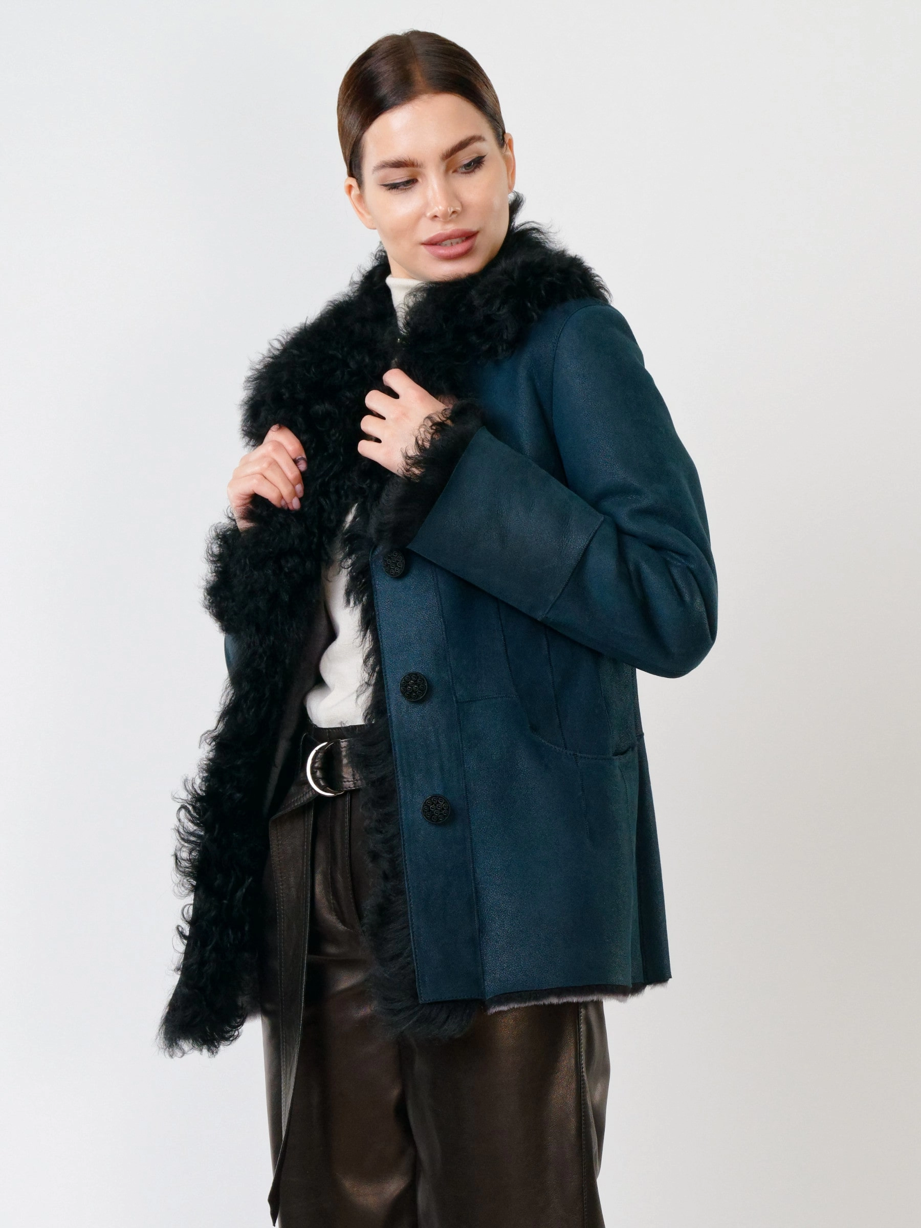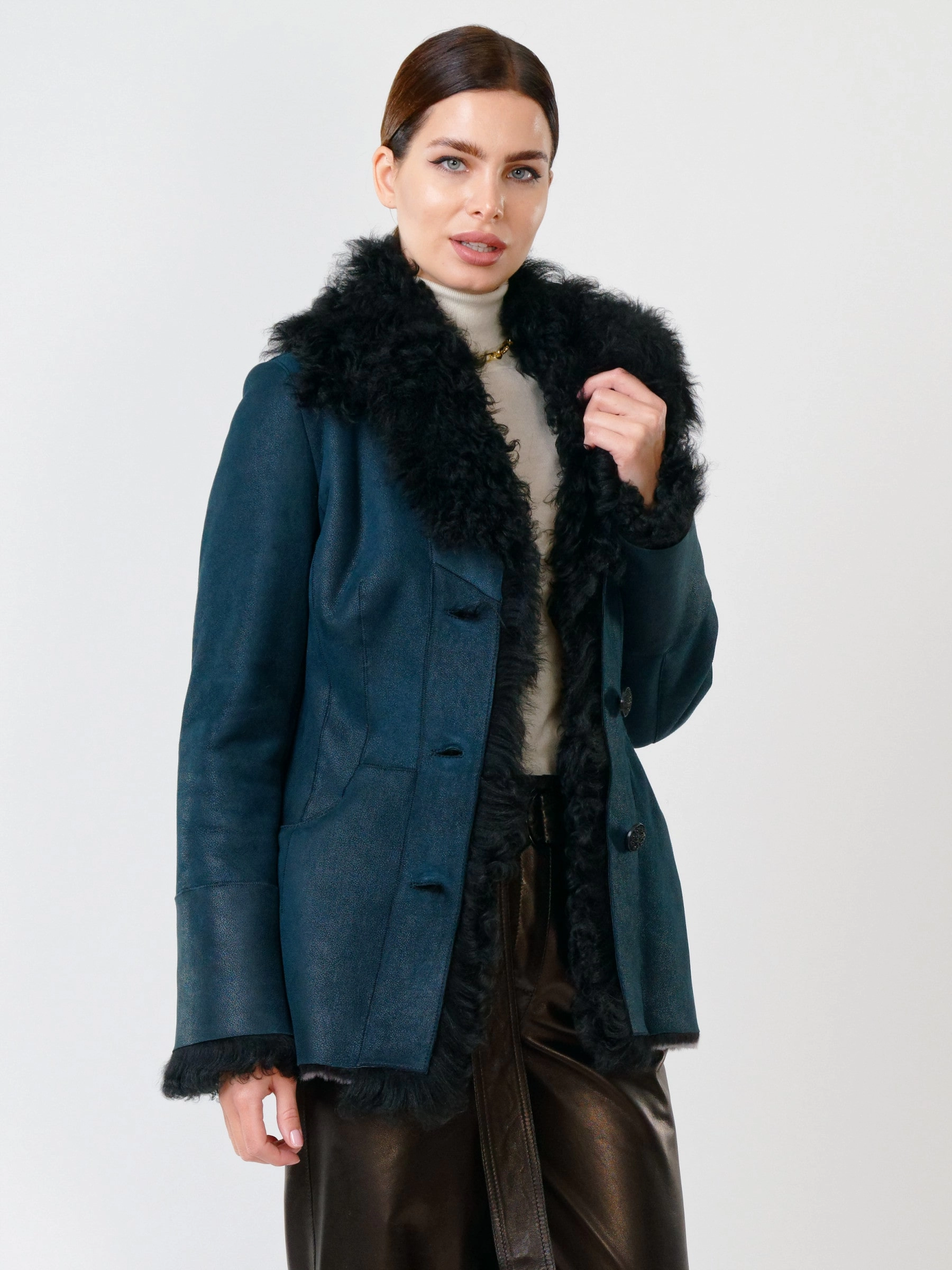 Элегантная короткая дубленка с английским воротником и отделкой из овчины «тиградо» на пуговицах из натуральной овчины «мерино» длиной 70 см представлена в полуприлегающем силуэте с втачными рукавами. Аристократичный воротник, борт и манжеты из эффектной «тиградо» создают роскошный контраст. Функциональные детали – застежка на воротнике для защиты от ветра и регулируемая длина рукавов за счет меховых отворотов – гарантируют комфорт и тепло. Два врезных кармана дополняют образ. Эта утонченная дубленка идеальна в сочетании с брюками-палаццо, юбками-карандаш, водолазками и элегантными сапогами для стильных городских выходов.